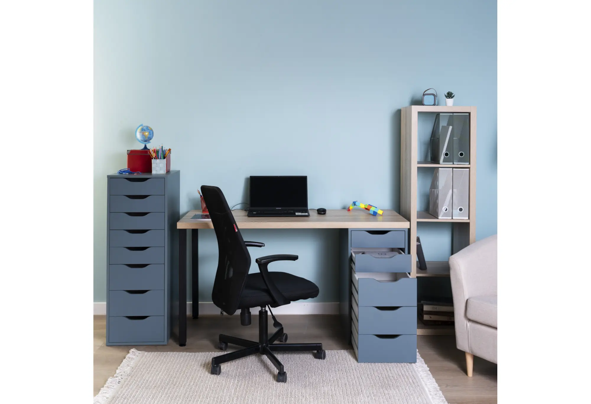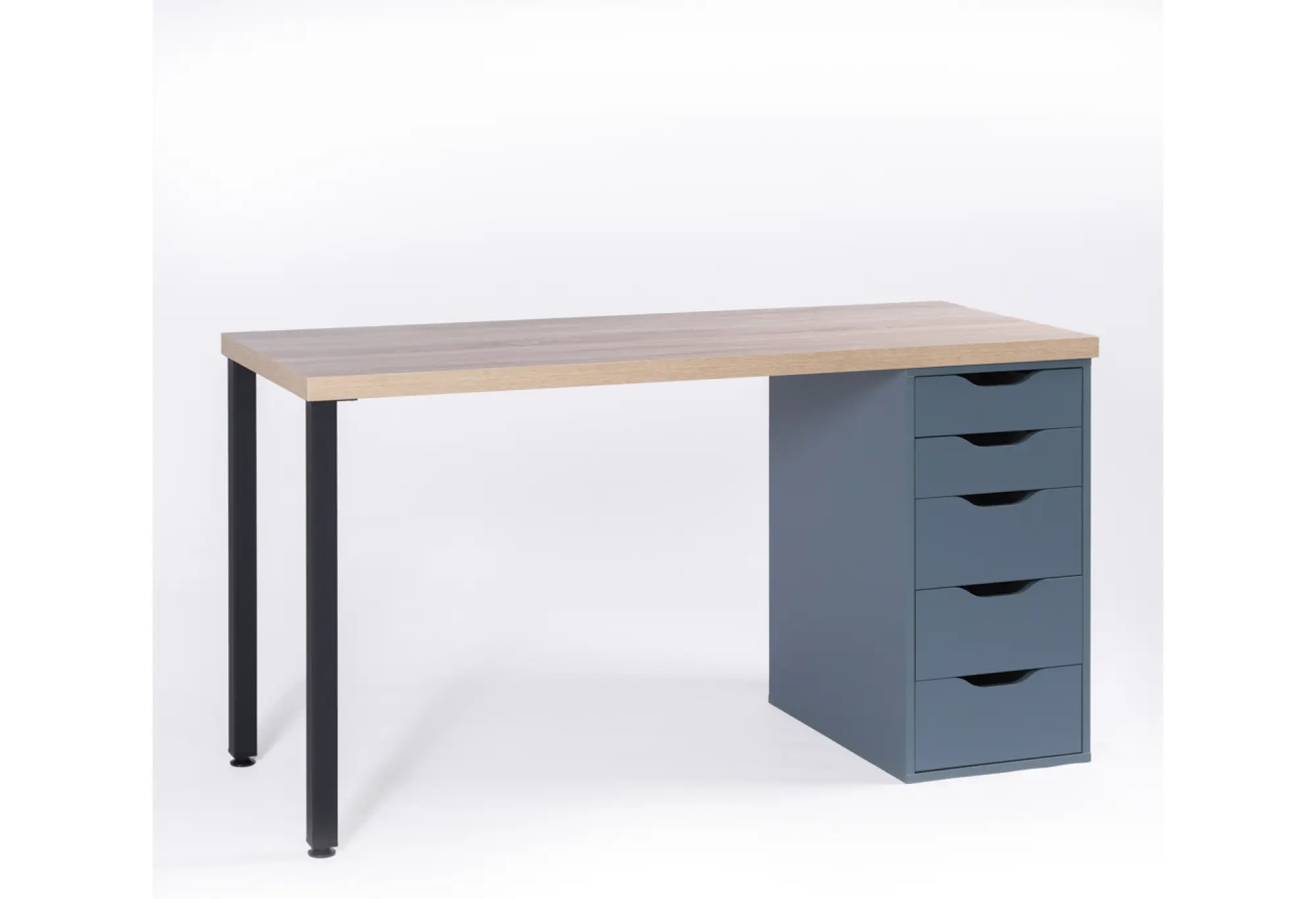 Стол письменный Ингар 2/5Т, 140x75x55, цвет Дуб беленый/серо-бирюзовый/черный. Стол комплектуется столешницей, двумя металлическими ножками и тумбой под столешницу с пятью выдвижными ящиками. Конструкция столешницы - тамбурат (рамка из ДСП и HDF с сотовым заполнением) - популярная современная технология, активно внедряемая крупнейшими производителями для изготовления мебели по скандинавским стандартам. Ножки - крашенный металл в черный цвет. Опоры ножек регулируемые. Конструкция тумб стола: ДСП, поверхность, декорированная бумага, окраска УФ материалами. Фасады ящиков без ручек, с вырезами для удобного выдвижения. Ящики переменной высоты позволяют использовать их для хранения разнообразных предметов.Преимущества: облегченная конструкция (тамбурат); высокая прочность, устойчивость; простая, быстрая сборка; эстетичный внешний вид. Гарантийный срок для жилых и общественных помещений 24 месяца.