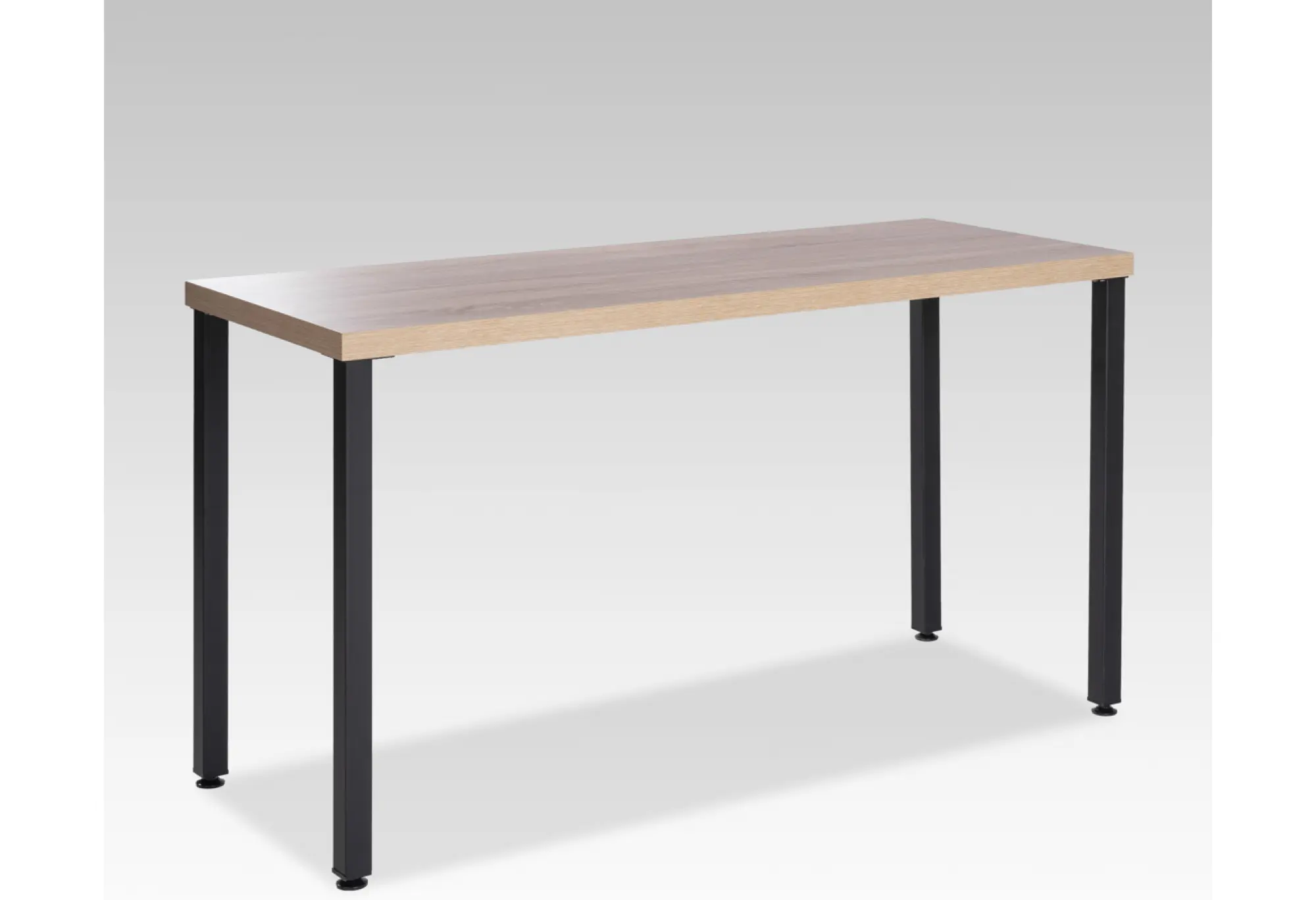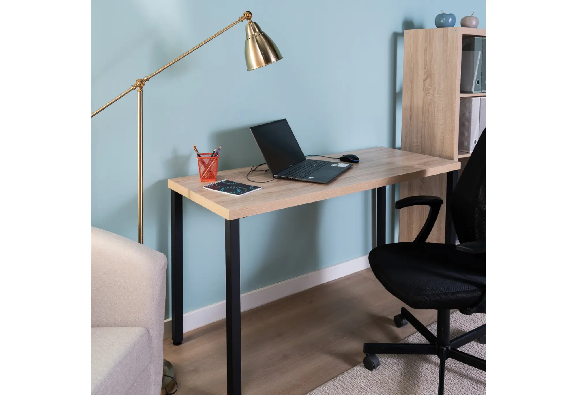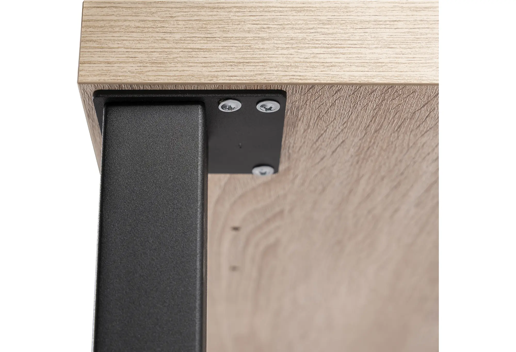 Металлические ножки, окрашенные в черный цвет, придают столу устойчивость и визуальную легкость. Регулируемые опоры позволяют выровнять стол даже на неровном полу, чтобы рабочая поверхность оставалась стабильной. Материалы корпуса — ДСП с декорированной поверхностью, защищенной УФ-окраской, что способствует сохранению внешнего вида при повседневной эксплуатации.