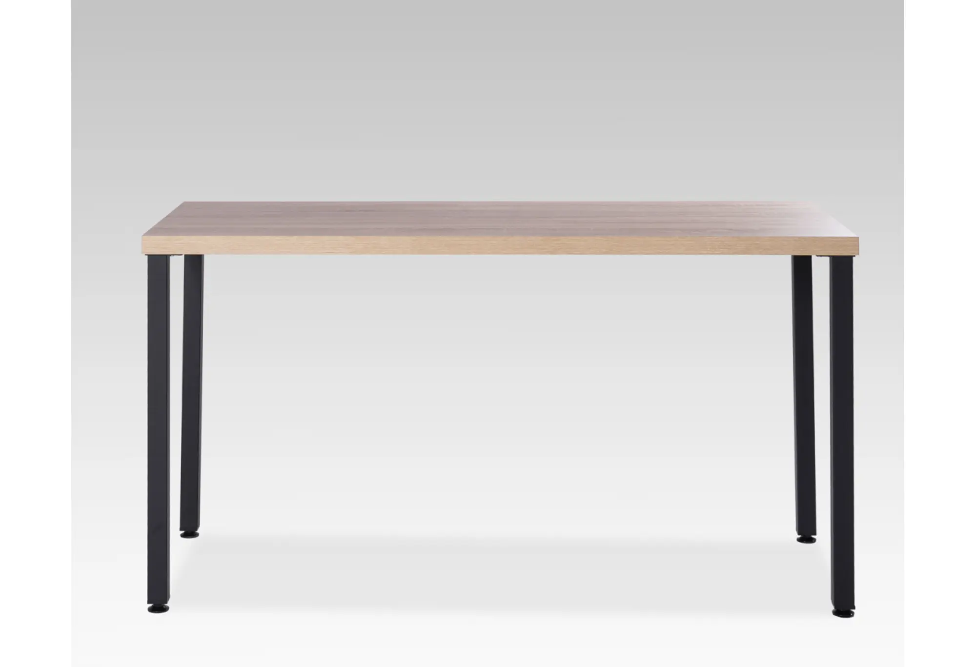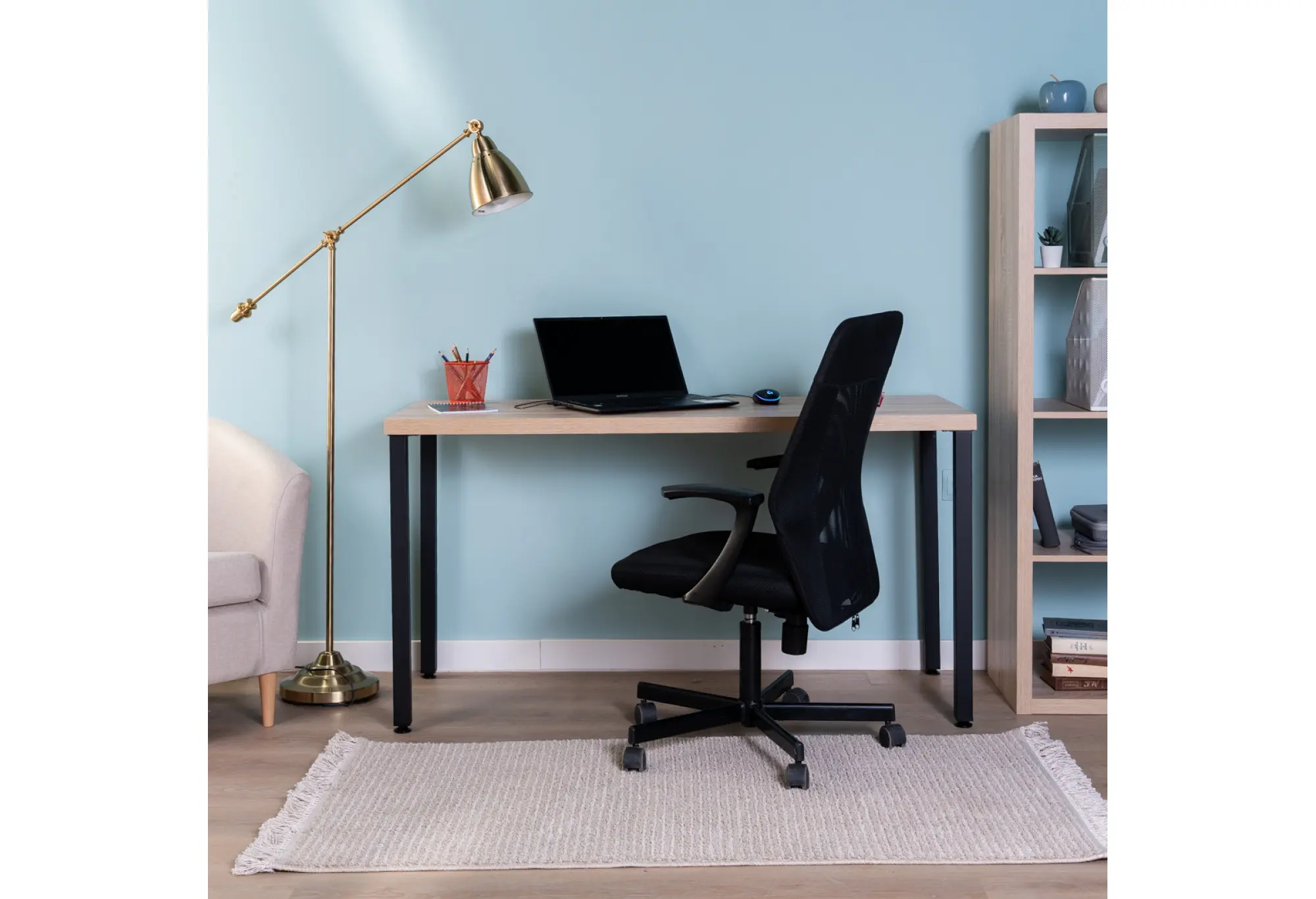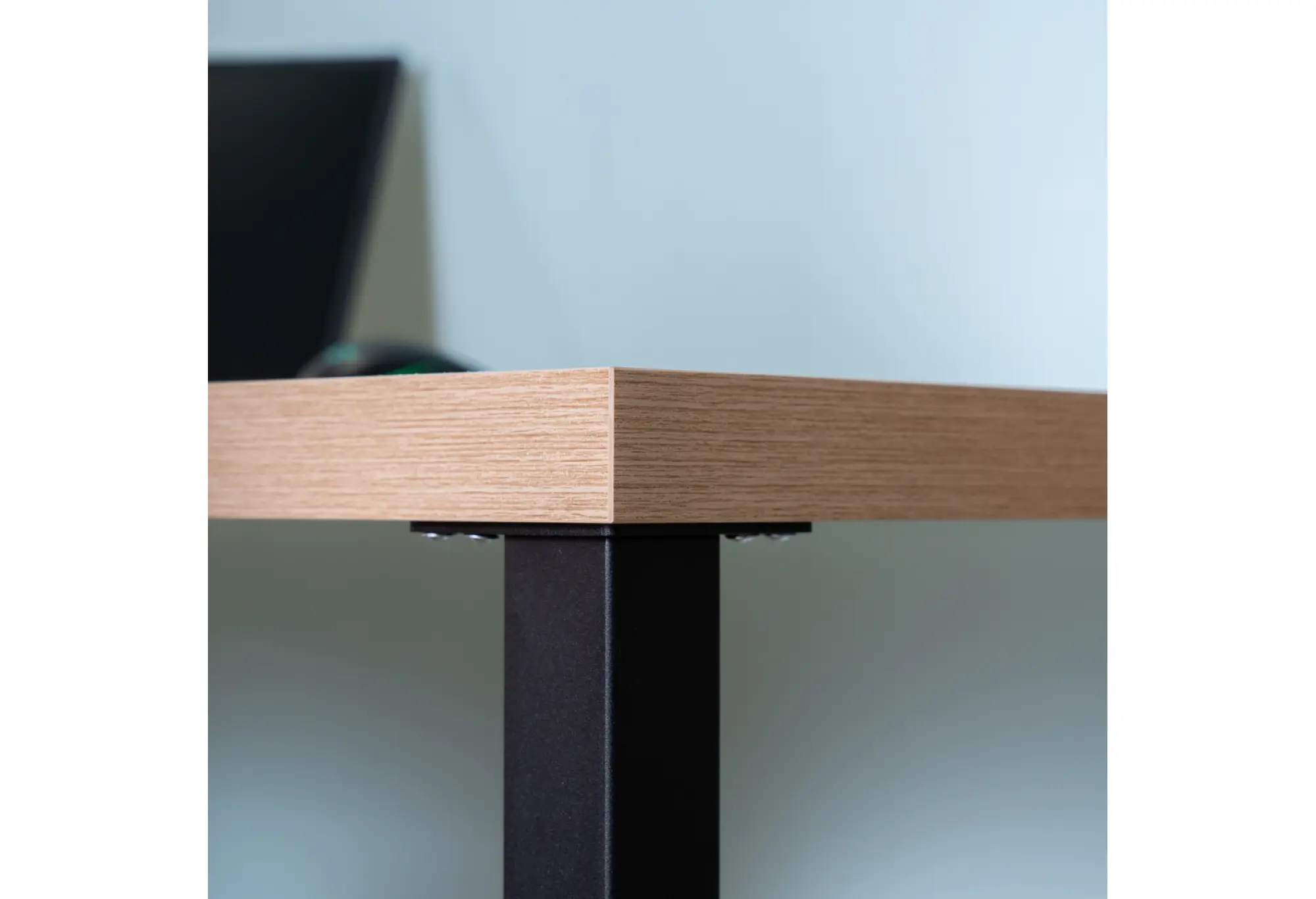 Металлические ножки, окрашенные в черный цвет, придают столу устойчивость и визуальную легкость. Регулируемые опоры позволяют выровнять стол даже на неровном полу, чтобы рабочая поверхность оставалась стабильной. Материалы корпуса — ДСП с декорированной поверхностью, защищенной УФ-окраской, что способствует сохранению внешнего вида при повседневной эксплуатации.