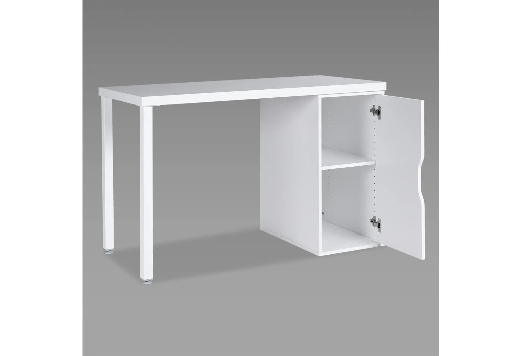 Боковая тумба с распашной дверцей дает закрытое пространство для хранения папок, учебников, офисных принадлежностей и личных вещей. Продолговатый вырез вместо ручки делает фасад более лаконичным и безопасным в ежедневном использовании, без выступающих элементов. Светлый белый цвет визуально облегчает конструкцию и делает рабочую зону более светлой и организованной.