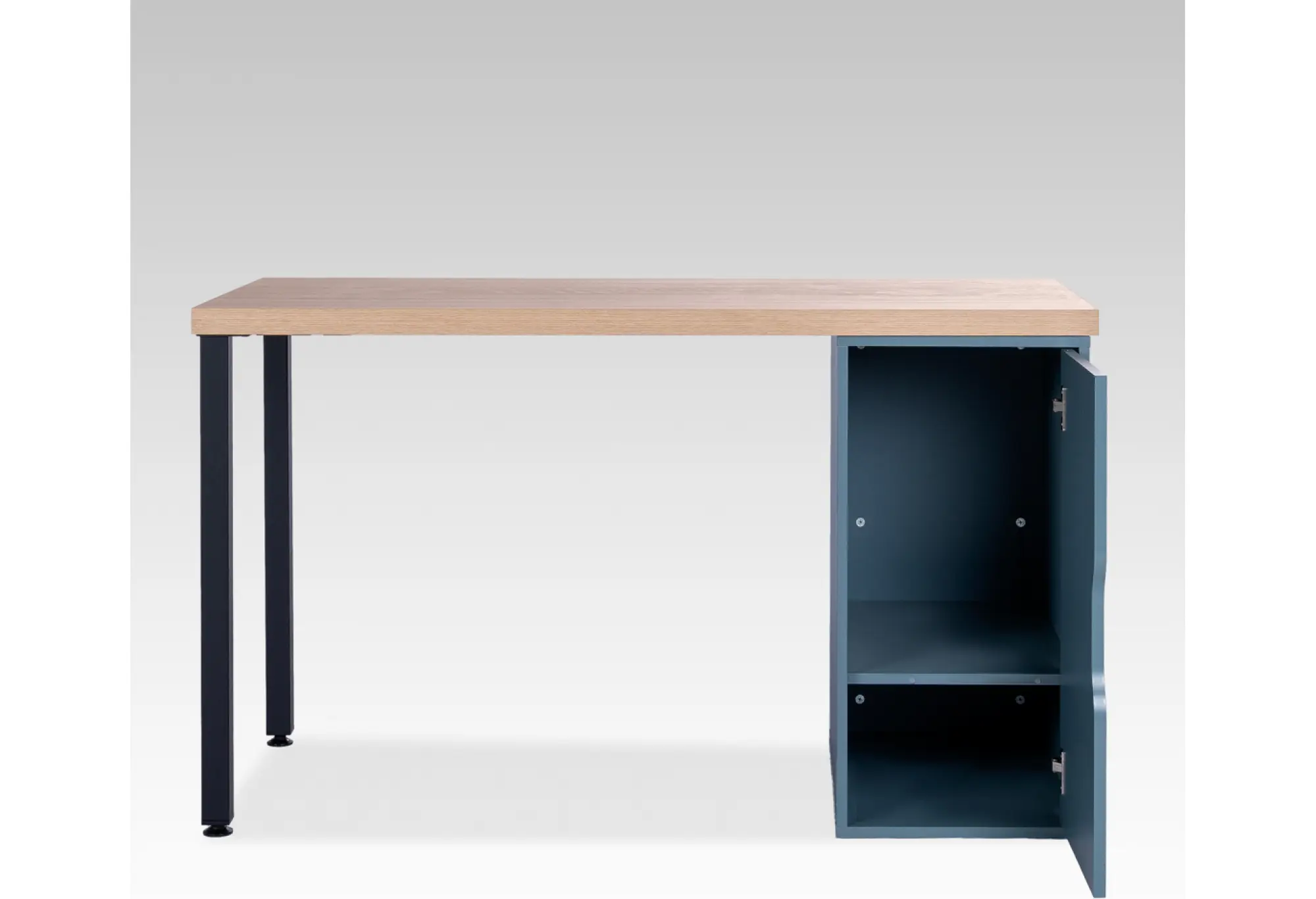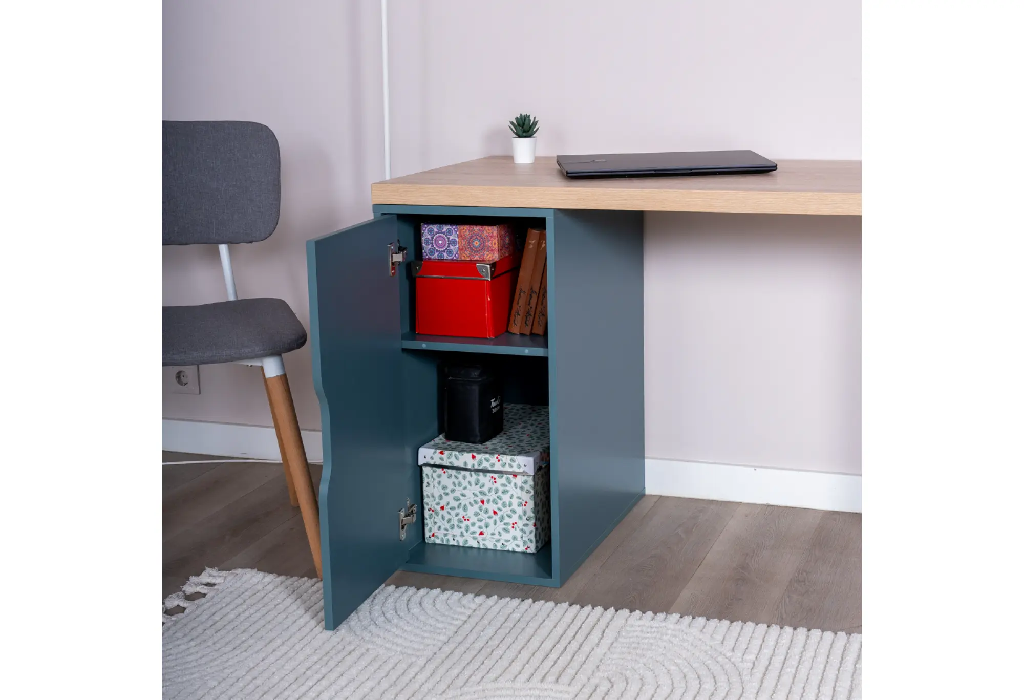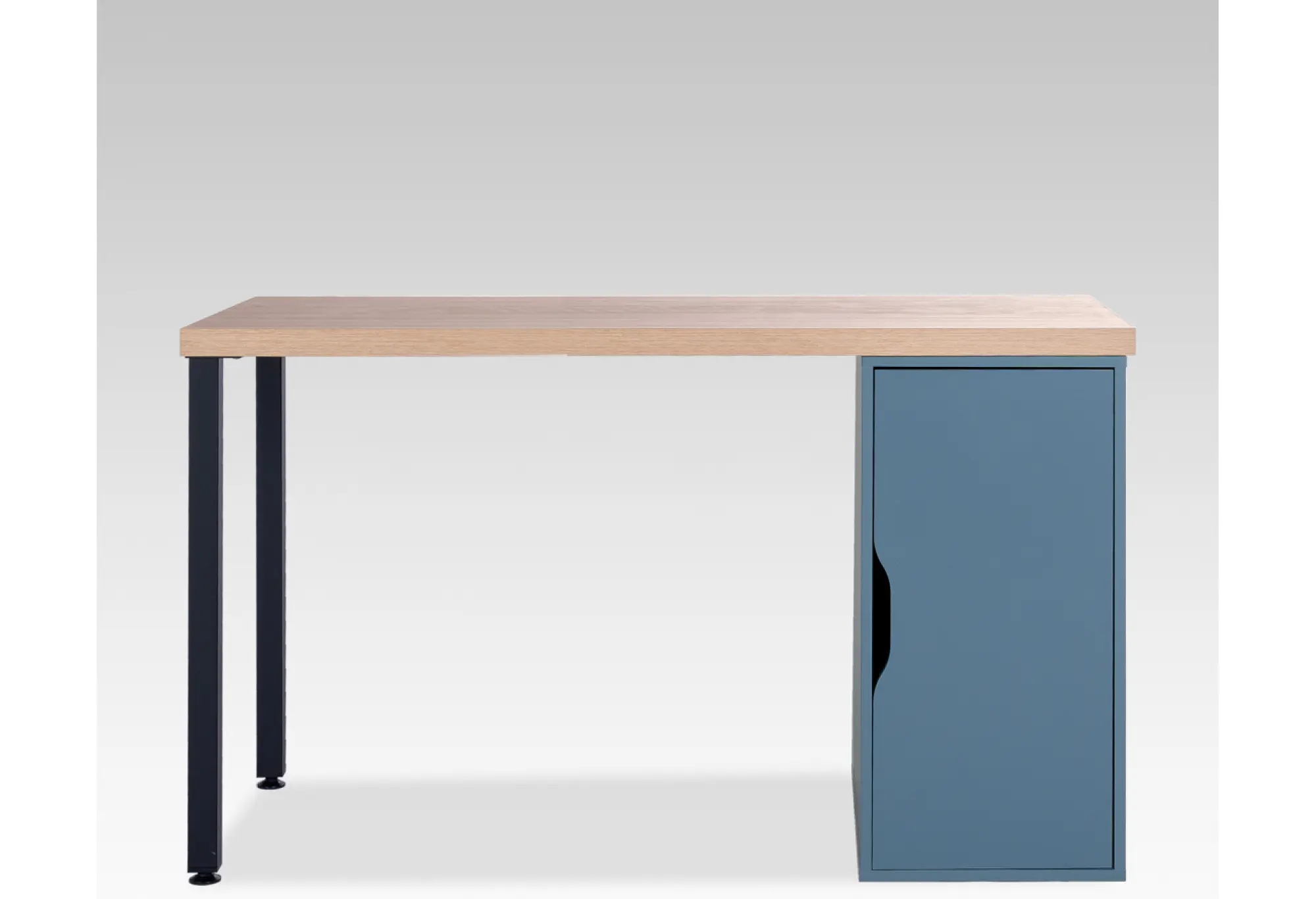 Опора в виде черных металлических ножек с одной стороны и закрытой тумбы в серо-бирюзовом цвете с другой обеспечивает устойчивость и визуальный баланс. Контрастная цветовая комбинация делает стол выразительным, но не перегружает пространство, органично вписываясь как в минималистичные, так и в более динамичные интерьеры.