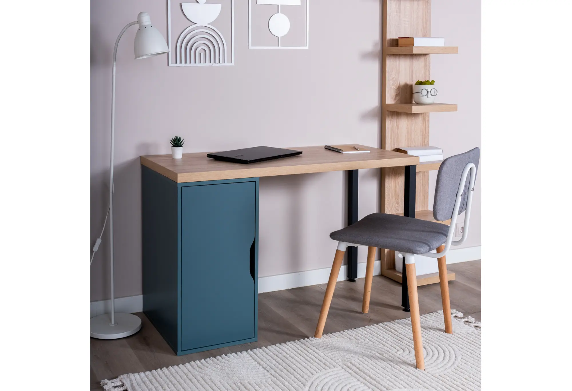 Лаконичный письменный стол для современного интерьера рабочего кабинета, детской или домашнего офиса. Столешница из ЛДСП в оттенке «дуб беленый» создает визуальное ощущение легкости и тепла, при этом устойчива к повседневным нагрузкам — письму, работе за ноутбуком, учебным занятиям.