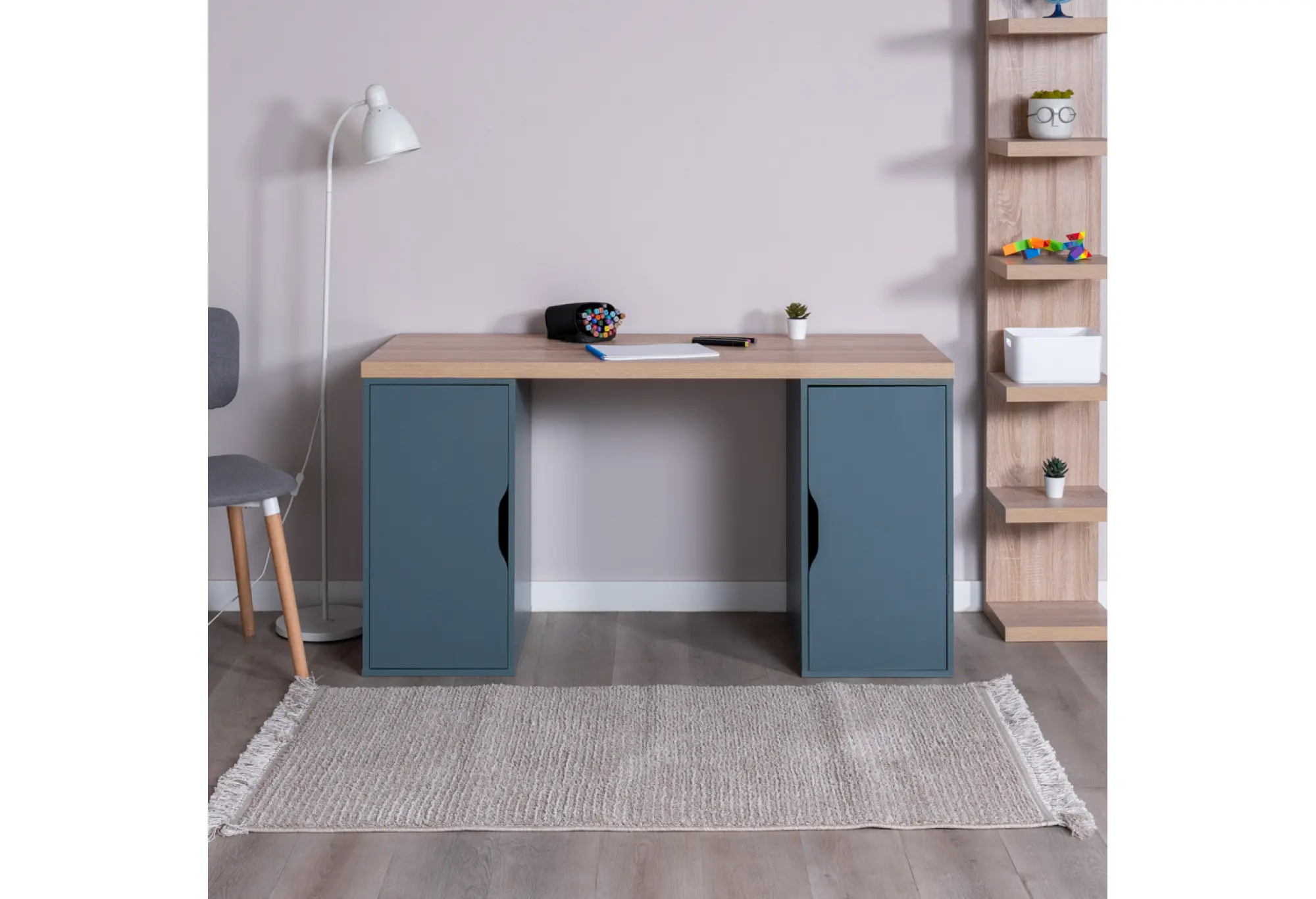Корпус выполнен из ДСП и тамбурат – это обеспечивает надежность конструкции и устойчивость к повседневным нагрузкам. Светлый оттенок дуба на столешнице визуально “облегчает” мебель, а серо-бирюзовые опоры придают столу современный и сдержанный характер, который уместен как в домашнем кабинете, так и в подростковой комнате или современном офисе.