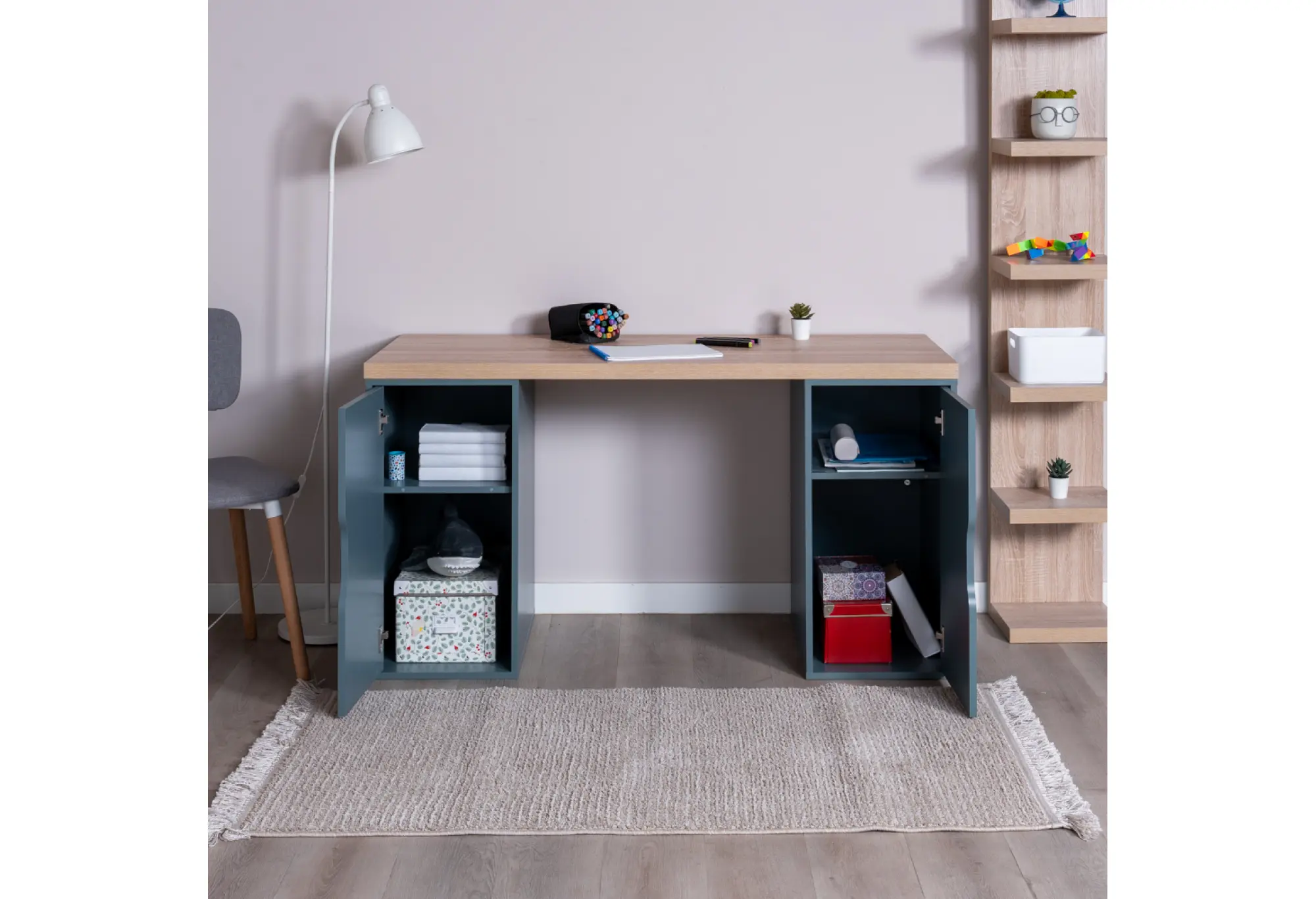 S01583 ИНГАР 2/ДВ/ДВ стол письменный 140x75x55, дуб беленый/серо-бирюзовый
