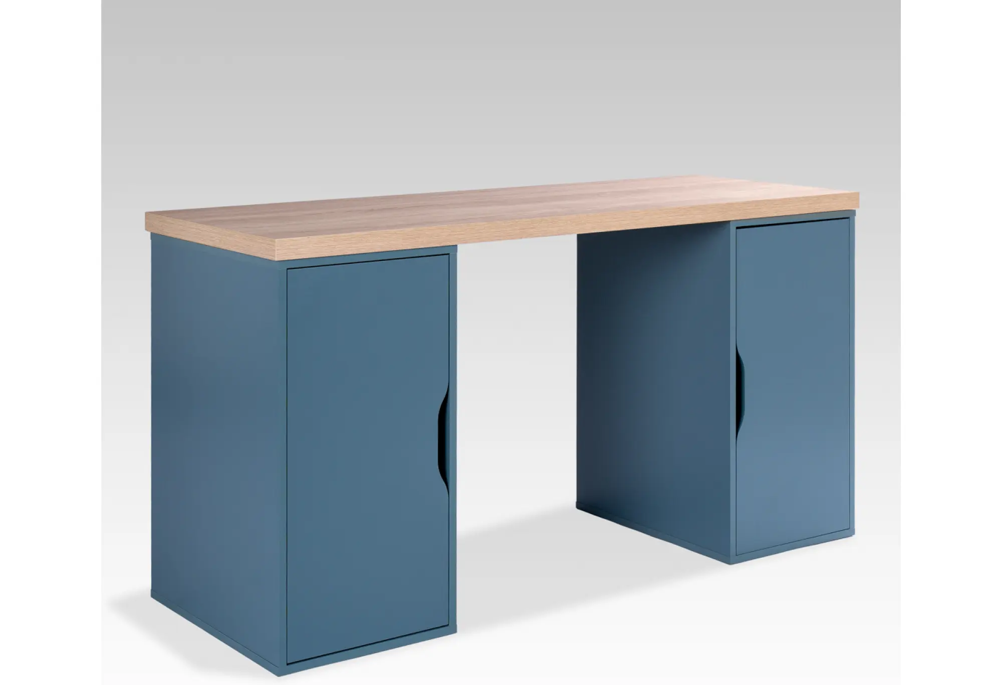 Две боковые тумбы с распашными дверцами создают закрытое пространство для хранения. Внутри удобно разместить бумаги, оргтехнику, книги или личные вещи, поддерживая порядок на рабочей поверхности. Вертикальные выемки вместо ручек делают фасады более безопасными и удобными в использовании, а также упрощают уход за поверхностью.