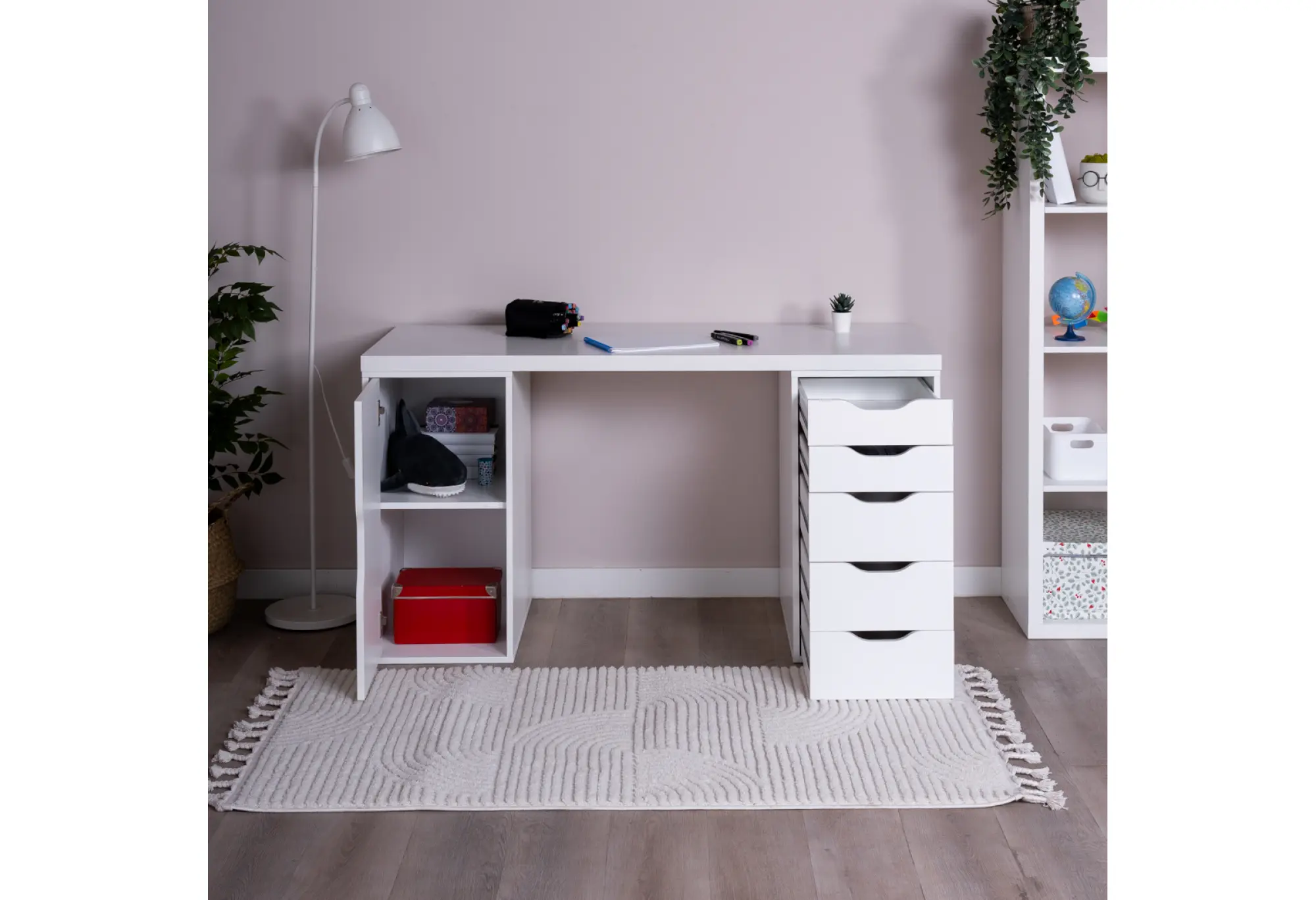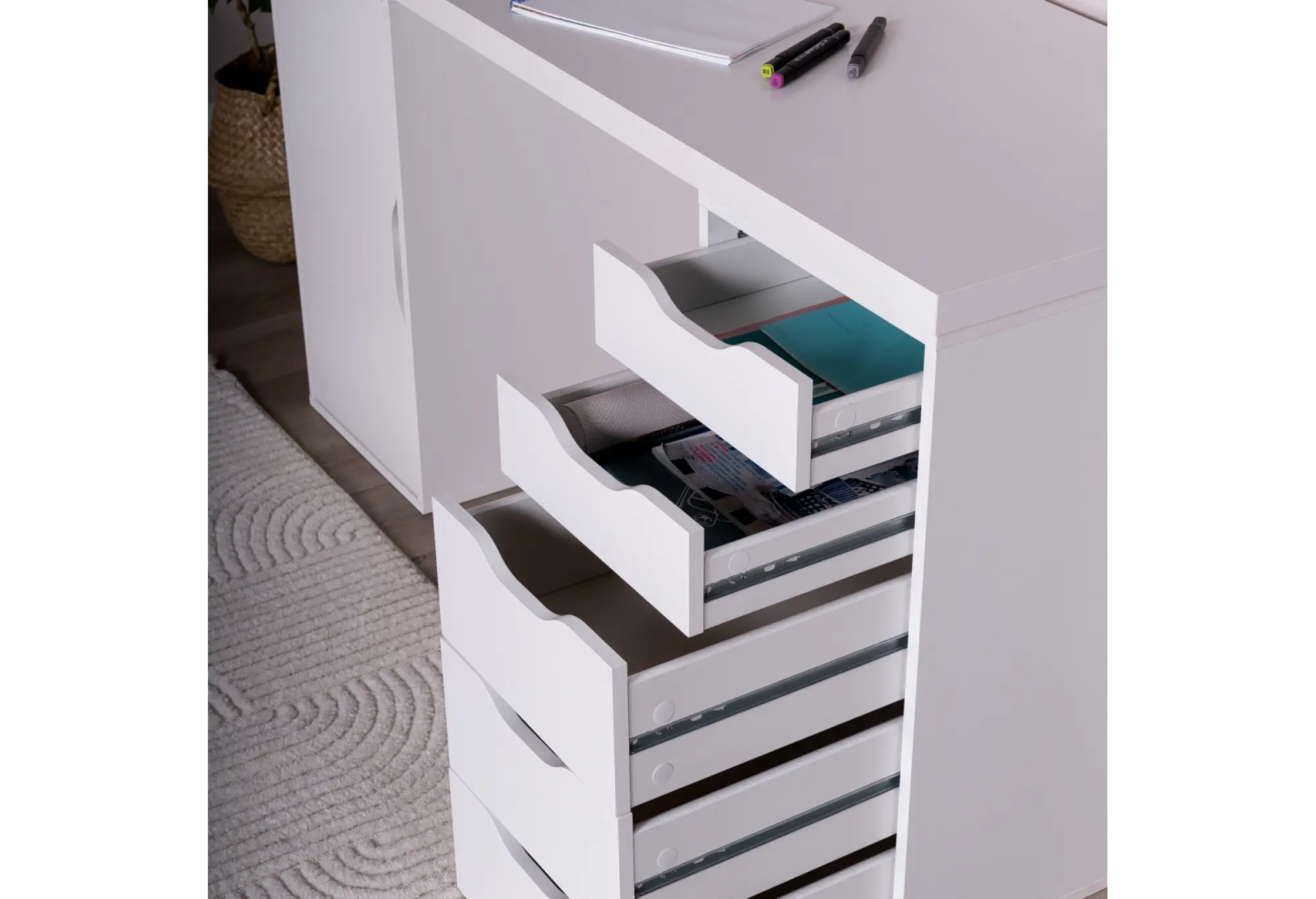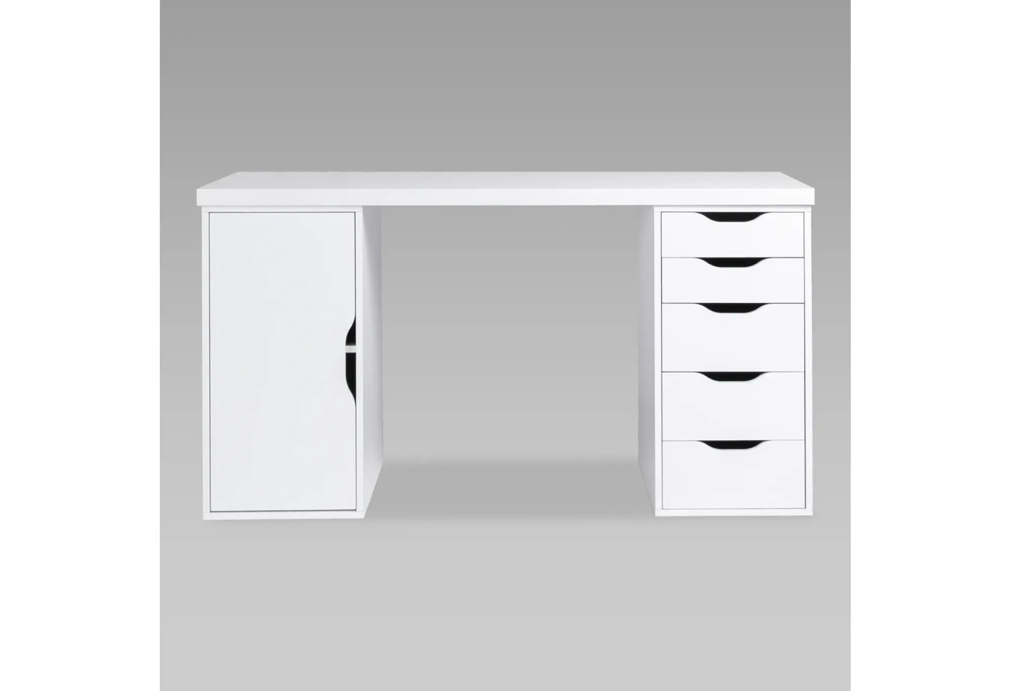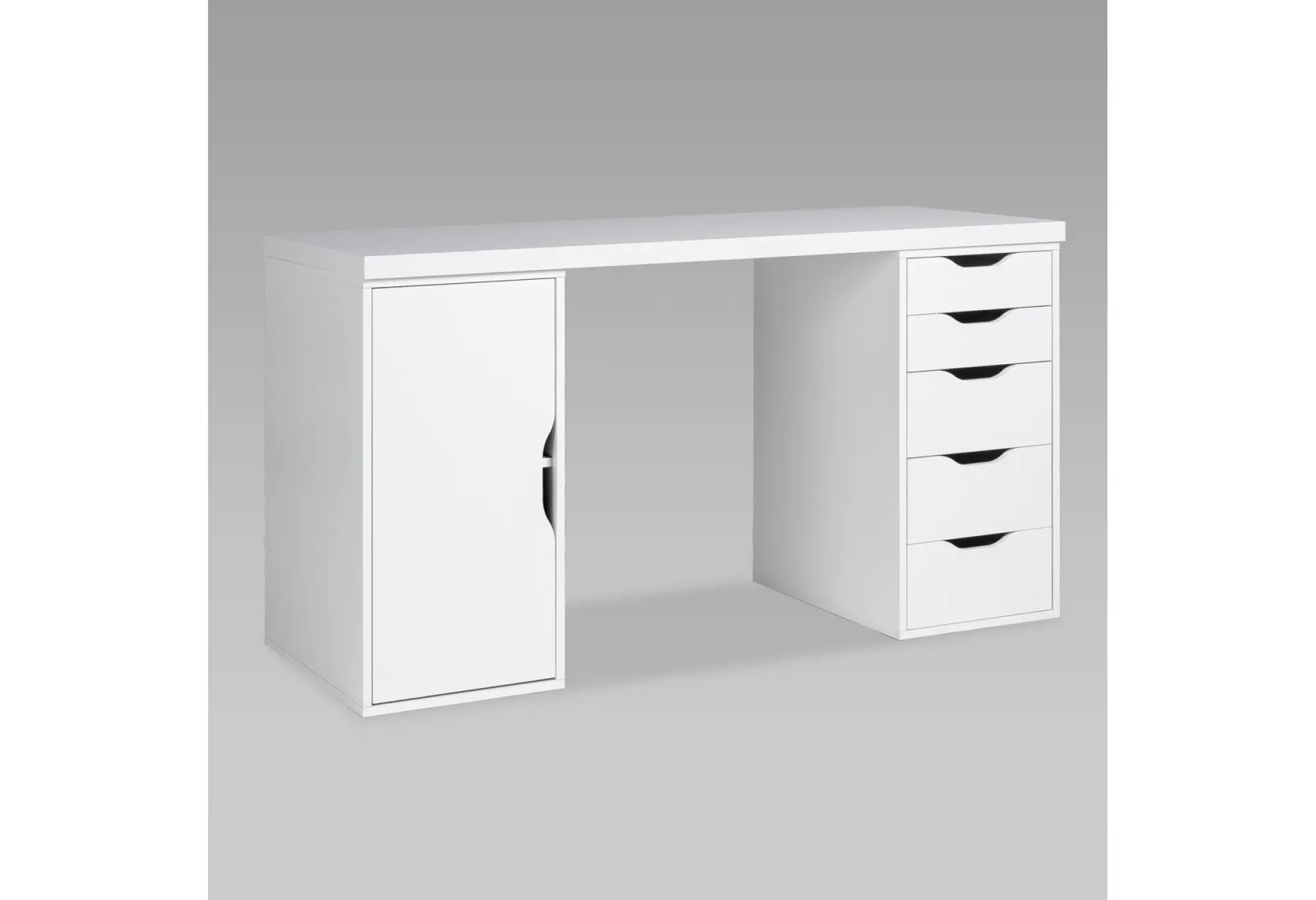 Справа расположены пять выдвижных ящиков, в которых удобно хранить мелкие предметы, бумагу, гаджеты и личные вещи, освобождая столешницу от лишних предметов. Слева — отделение с дверцей для более габаритных папок, коробок или техники. Фасады без выступающих ручек с вырезами под захват подчеркивают современный, спокойный дизайн и делают стол визуально легким.