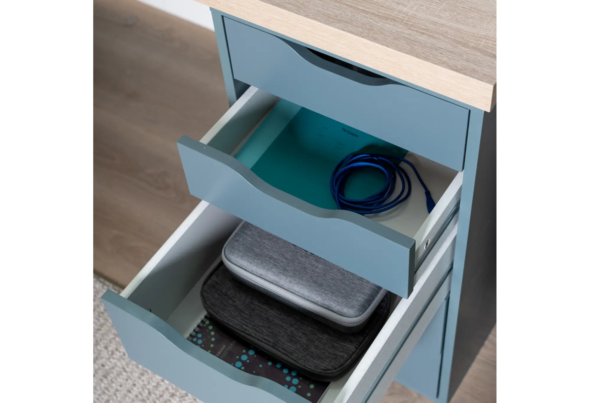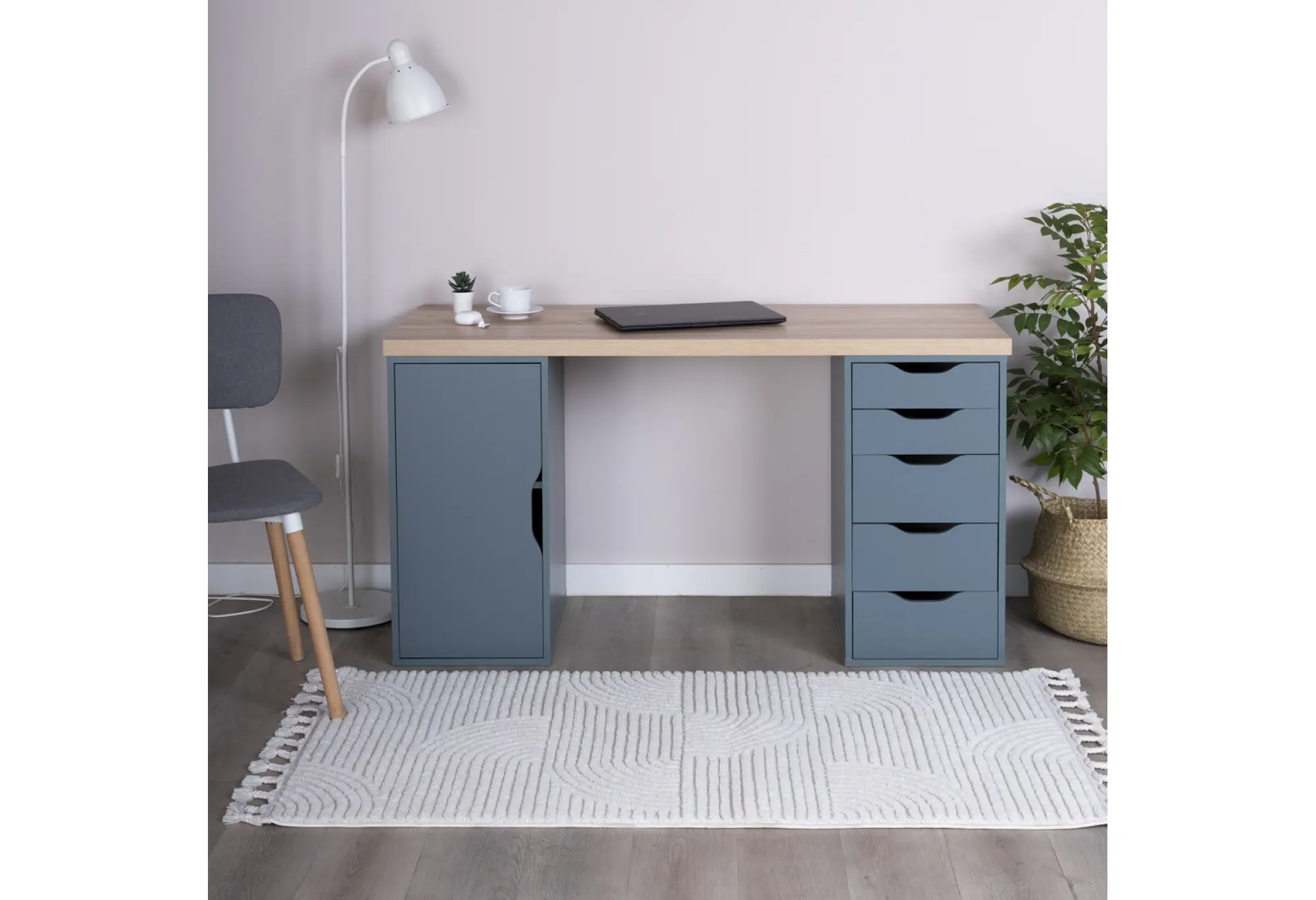 Корпус из ДСП и тамбурата обеспечивает устойчивость и достаточную надежность при повседневной эксплуатации. Благодаря универсальному сочетанию светлого дуба и серо-бирюзовых элементов стол вписывается в современные интерьеры, подойдет для рабочего кабинета, подростковой комнаты или домашнего офиса.