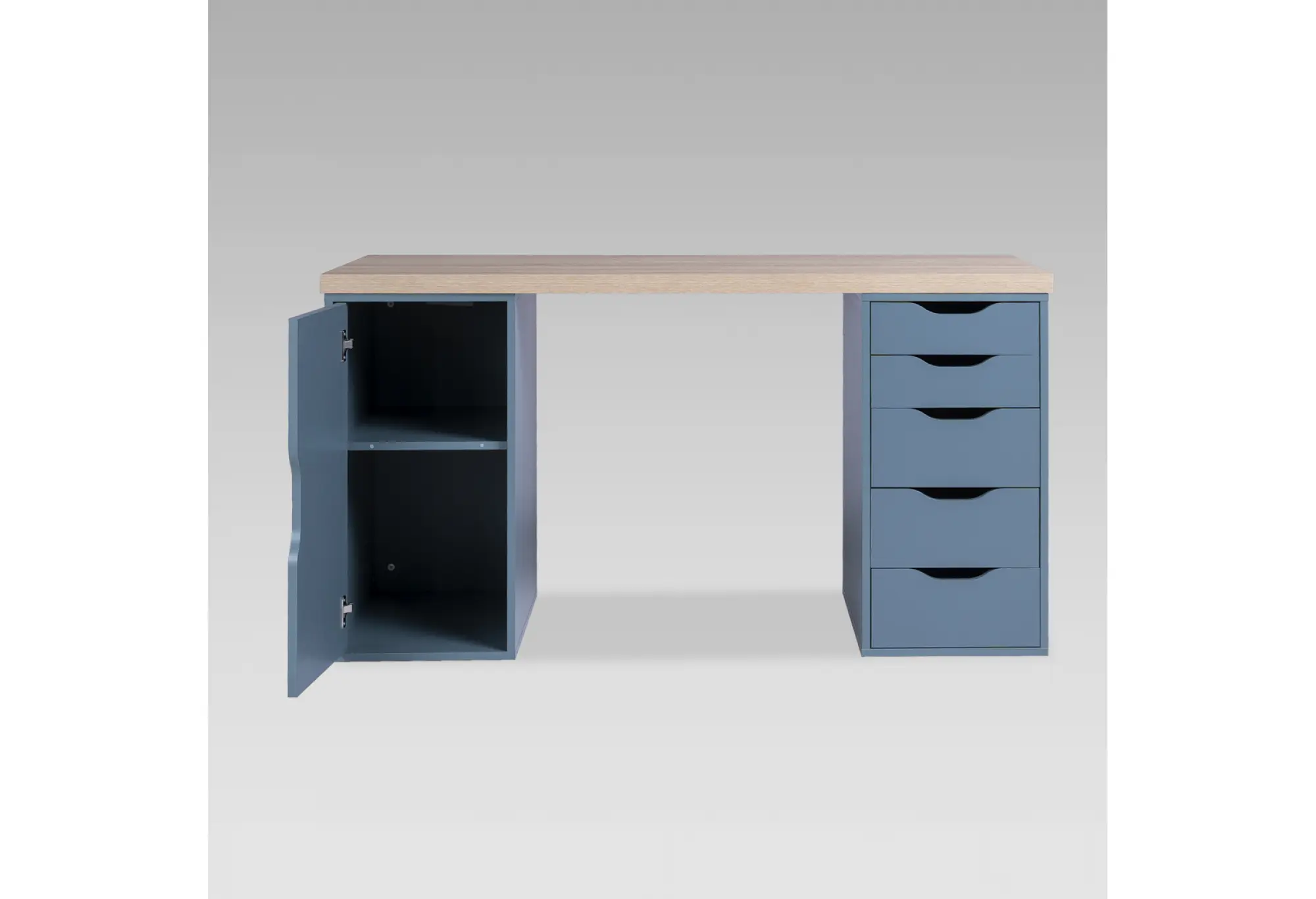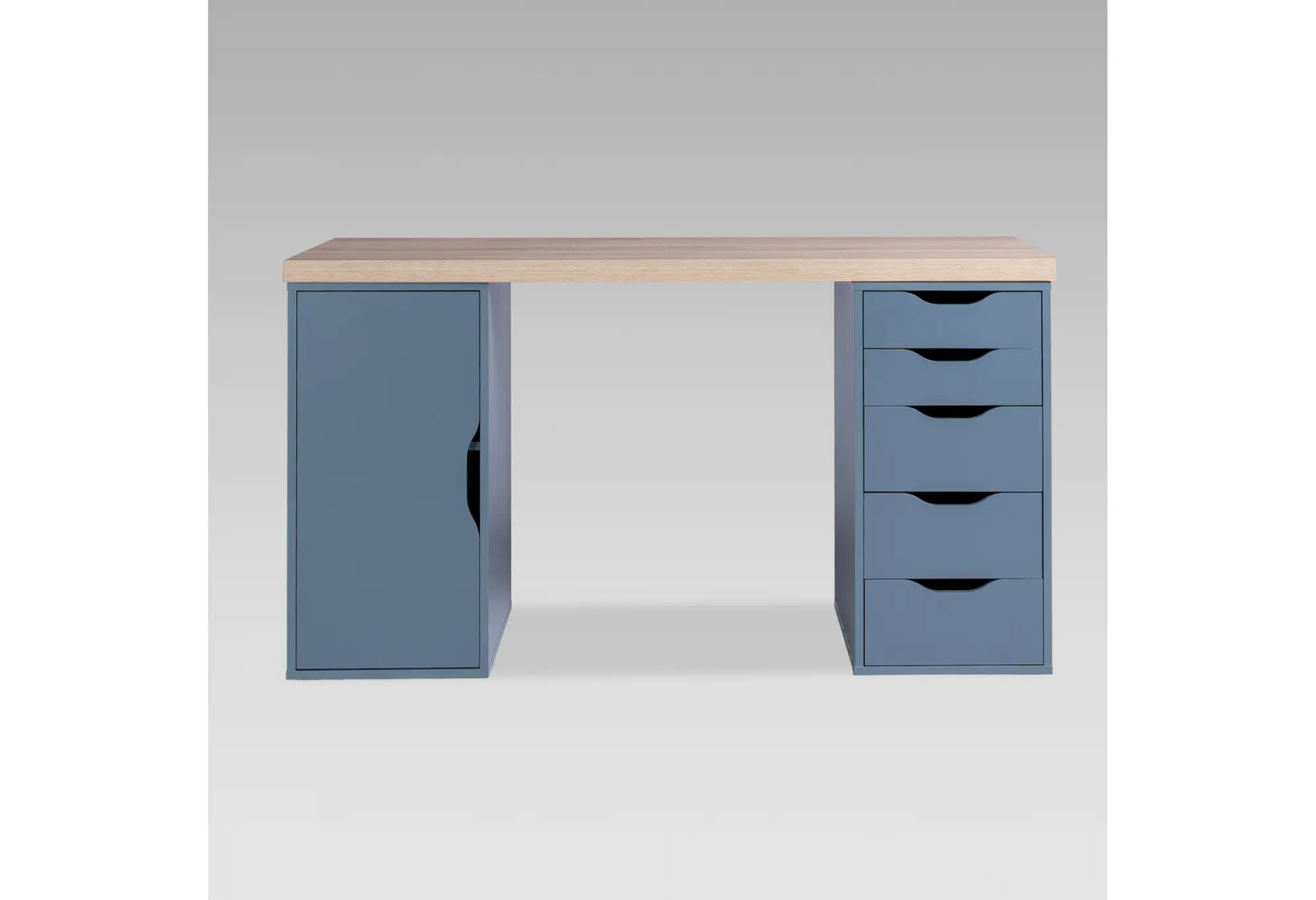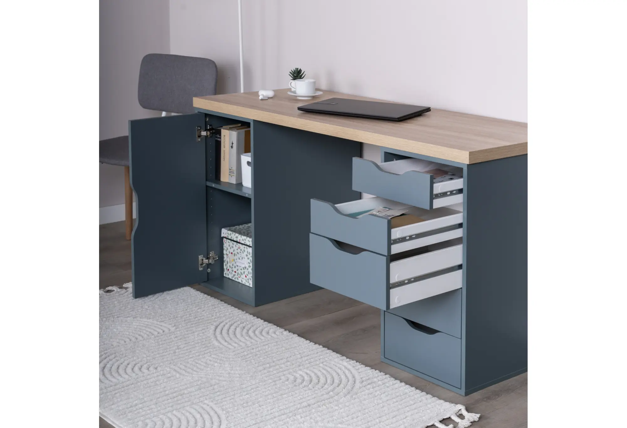 Конструкция стола продумана для повседневной работы и учебы. С одной стороны расположены четыре выдвижных ящика, с другой – закрытое отделение с дверцей. Это помогает поддерживать порядок на столешнице, распределяя мелкие предметы, бумаги и папки по своим местам. Фасады без выступающих ручек с аккуратными вырезами для захвата делают внешний вид лаконичным и снижают риск случайных зацепов.