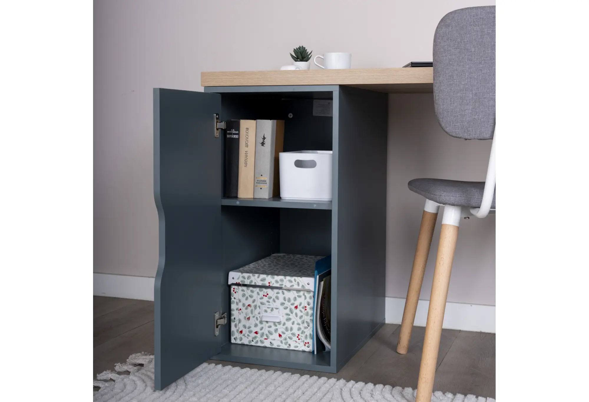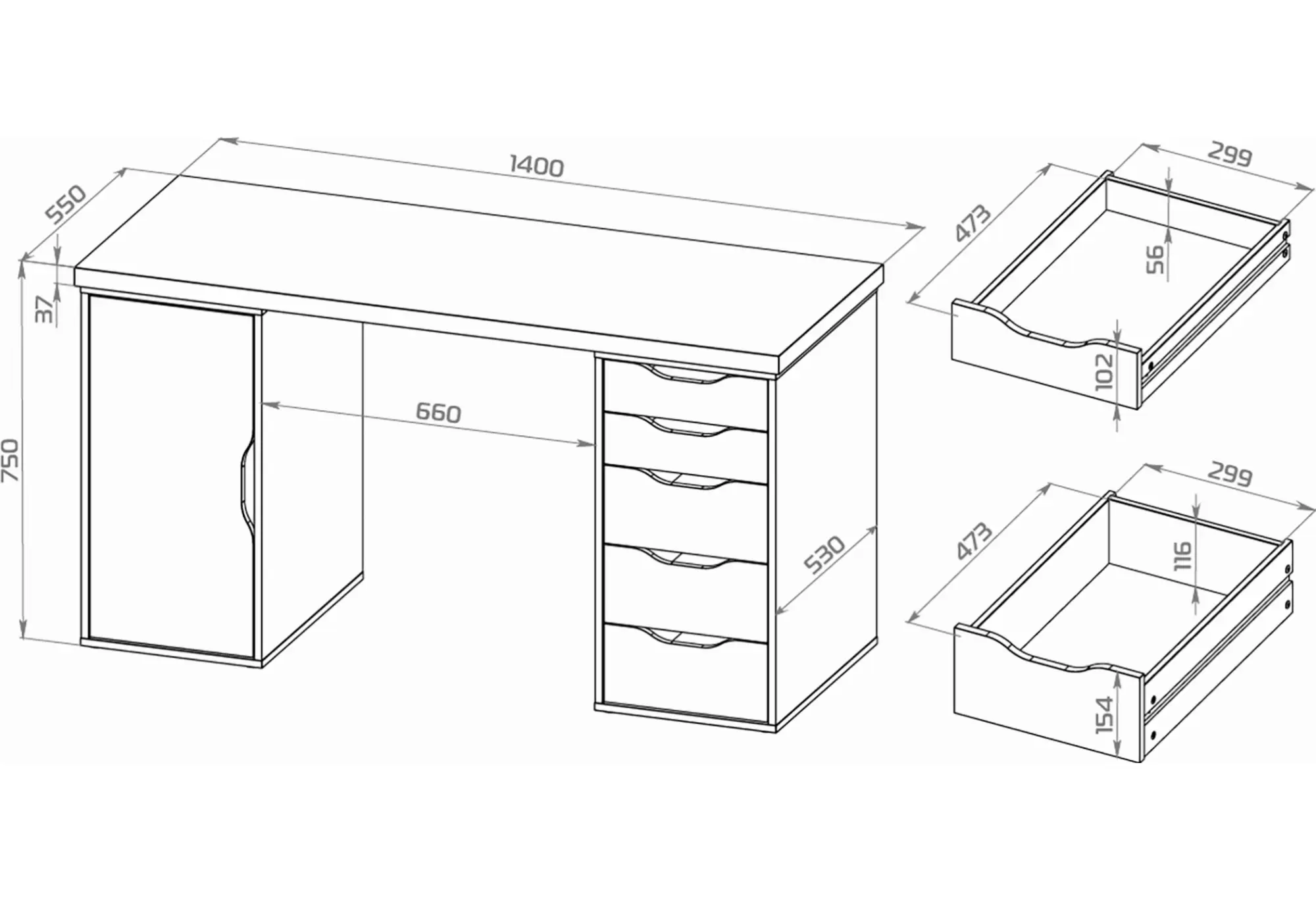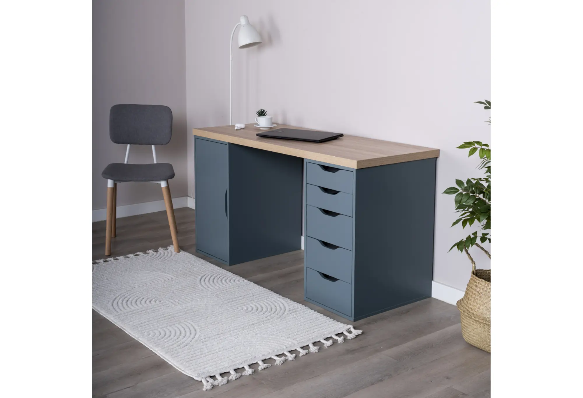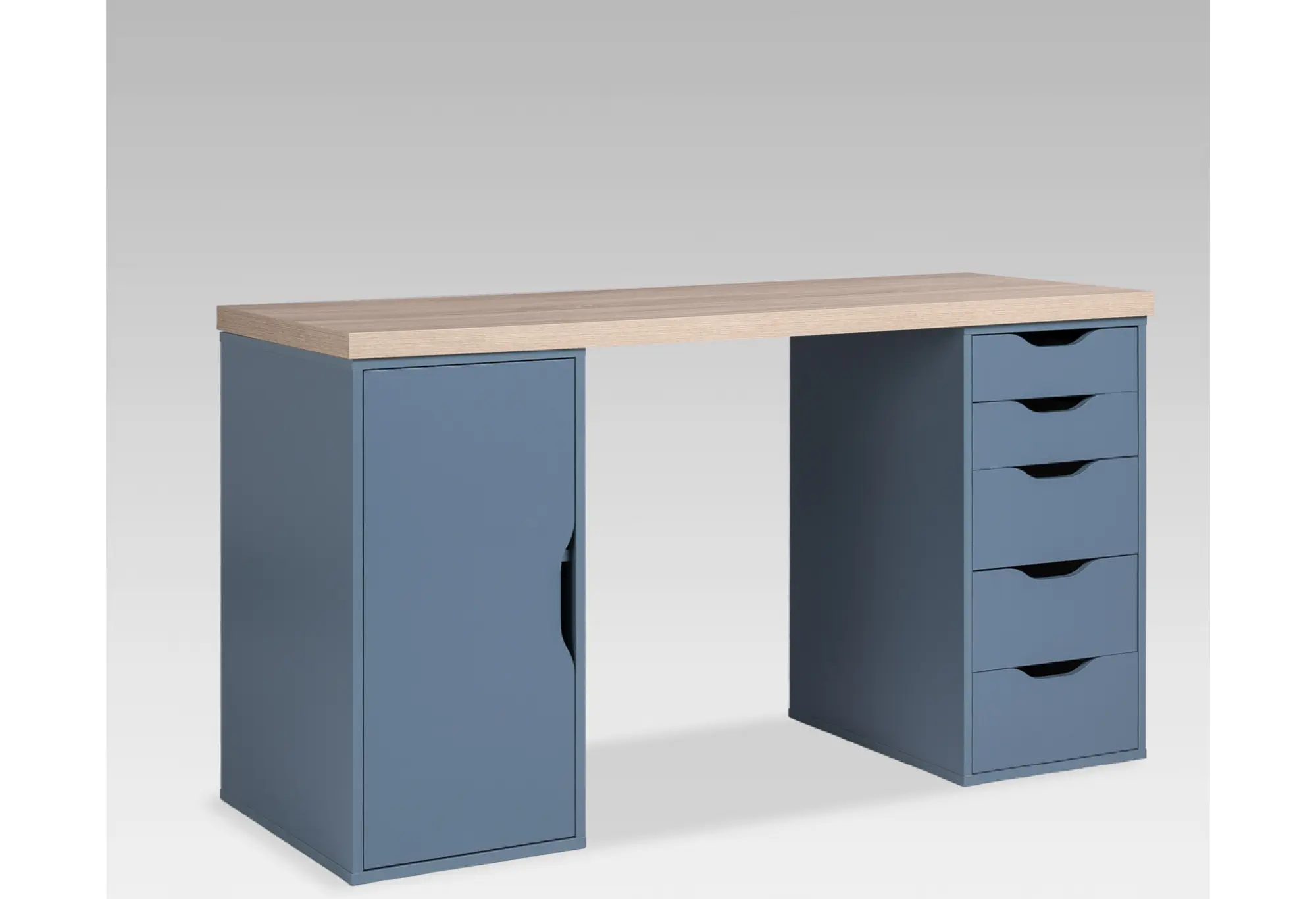 Конструкция стола продумана для повседневной работы и учебы. С одной стороны расположены четыре выдвижных ящика, с другой – закрытое отделение с дверцей. Это помогает поддерживать порядок на столешнице, распределяя мелкие предметы, бумаги и папки по своим местам. Фасады без выступающих ручек с аккуратными вырезами для захвата делают внешний вид лаконичным и снижают риск случайных зацепов.