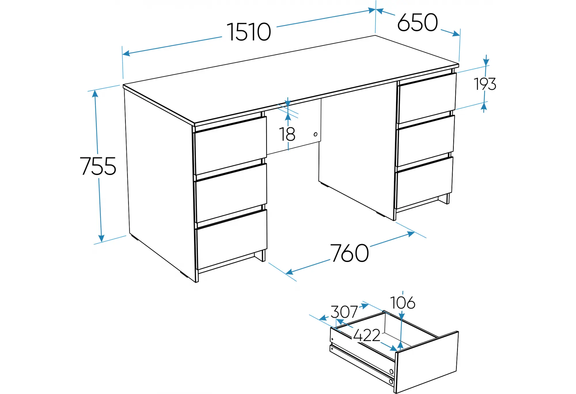 Две тумбы с тремя выдвижными ящиками каждая обеспечивают удобную систему хранения, можно разложить бумаги, офисные мелочи и личные вещи по категориям и держать всё под рукой. Наружные выдвижные ящики открываются плавно и обеспечивают хороший доступ к содержимому по всей глубине.