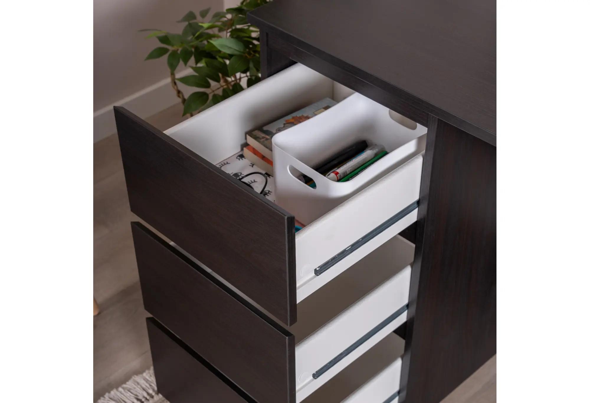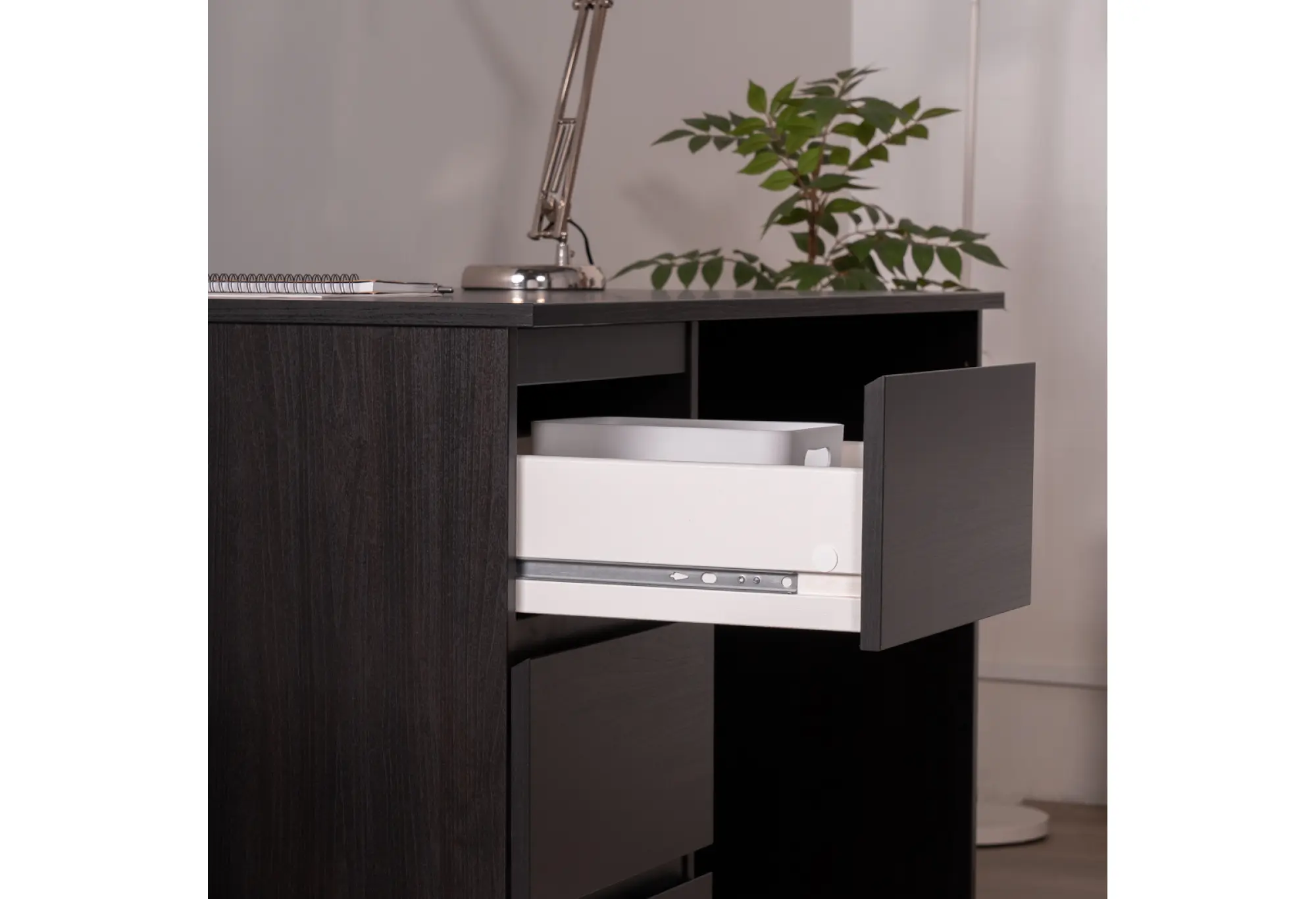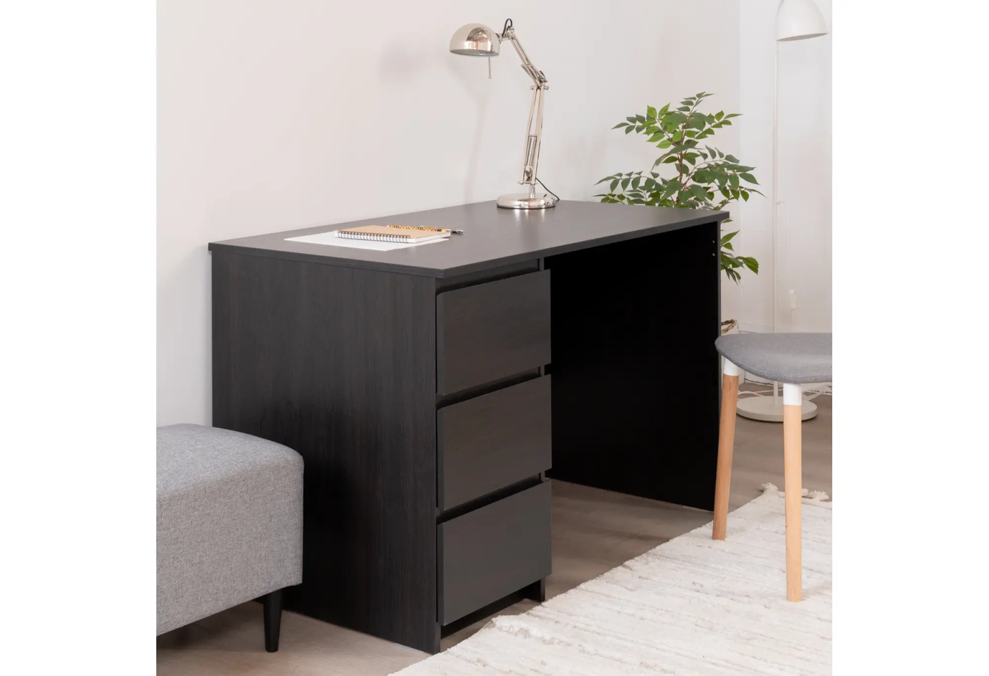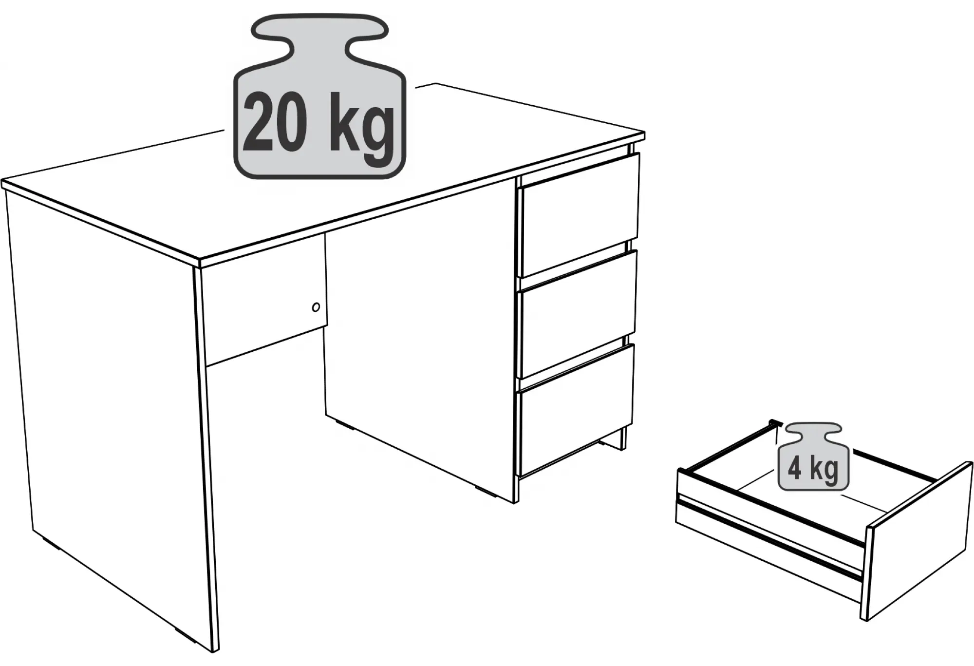 Тумба с тремя наружными выдвижными ящиками создает удобную систему хранения. Ящики подходят для бумаги, папок формата А4 и офисных принадлежностей, помогая поддерживать порядок на рабочей поверхности. Тумбу можно разместить как справа, так и слева под столешницей, что делает стол удобным как для правшей, так и для левшей и позволяет адаптировать его под особенности планировки помещения.
