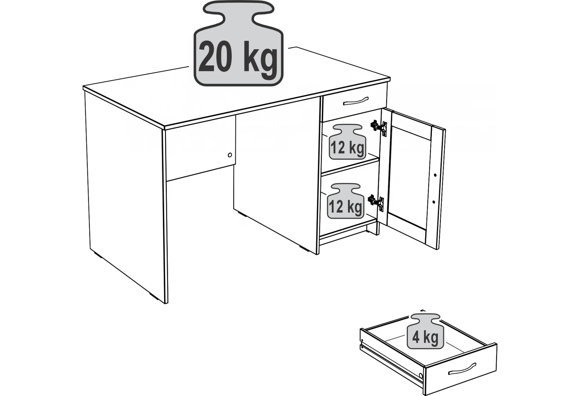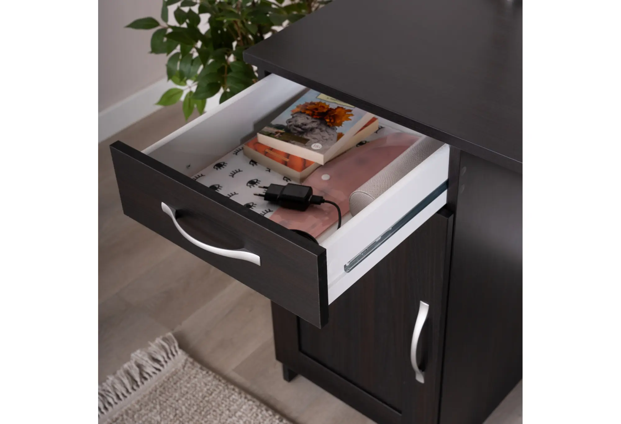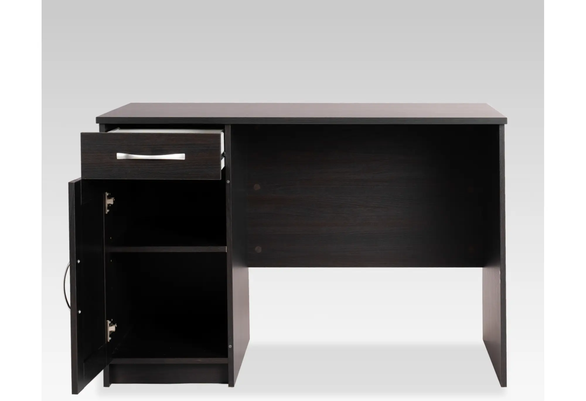 Практичная тумба с распашной дверцей и наружный выдвижной ящик помогают держать рабочее пространство в порядке - внутри удобно размещать папки, бумаги, расходные материалы и личные вещи. Конструктивная особенность стола позволяет установить тумбу с ящиком как справа, так и слева под столешницей, подстраивая рабочую зону под ваши привычки и особенности планировки.