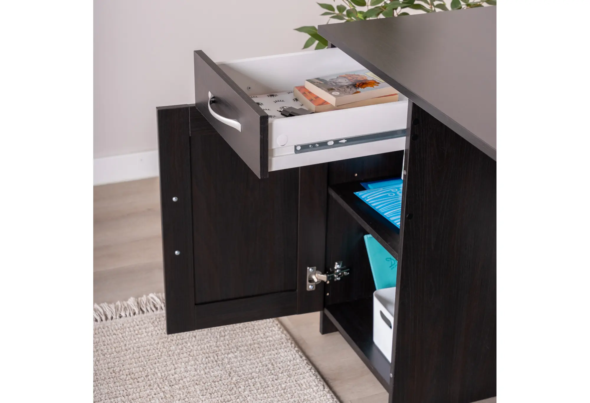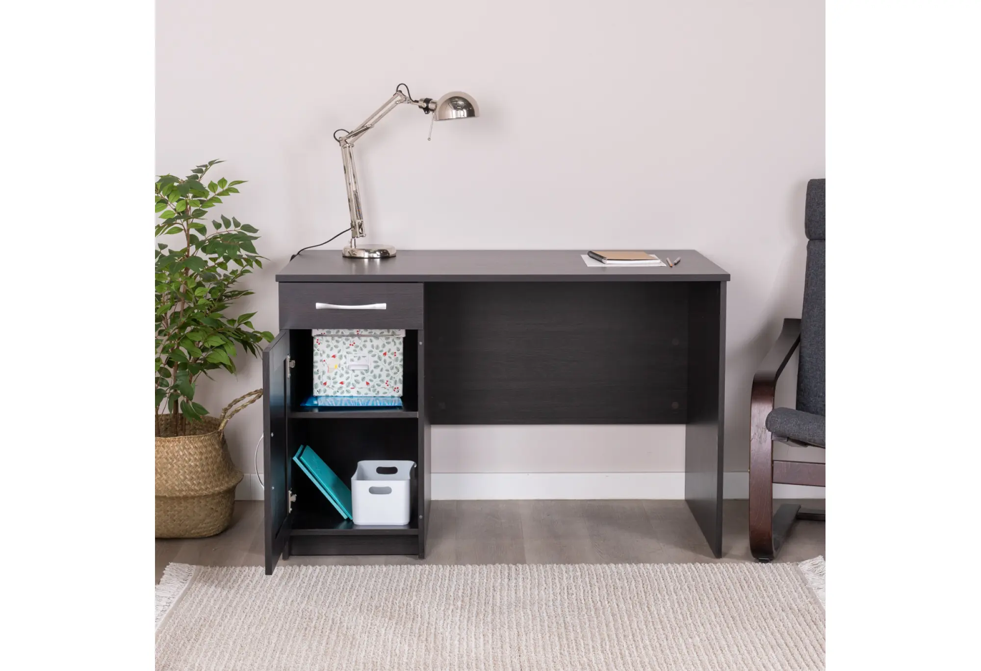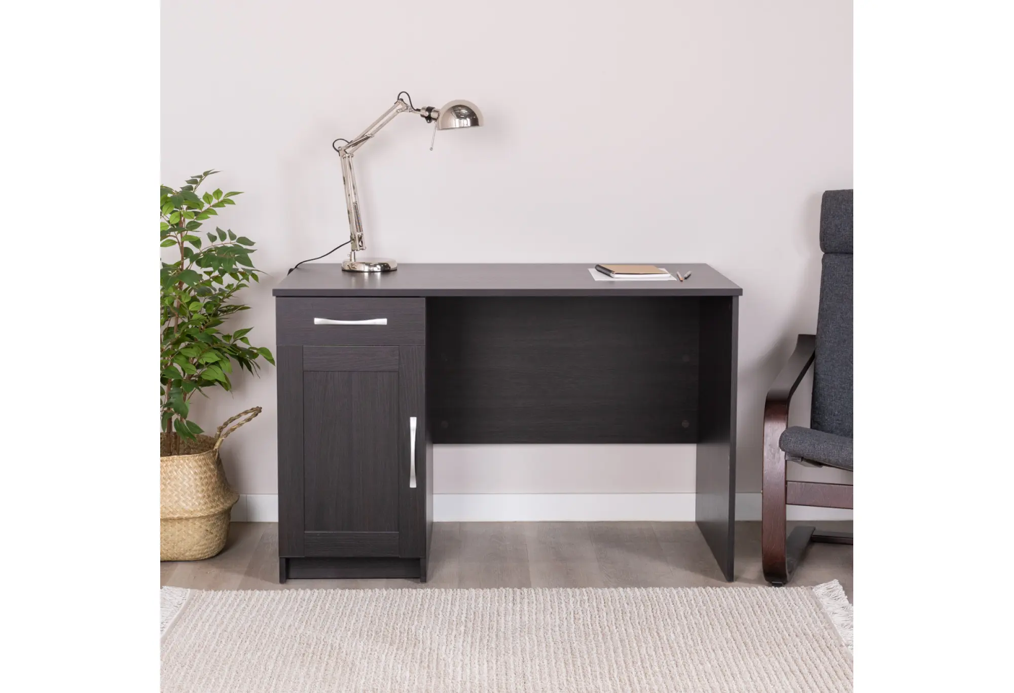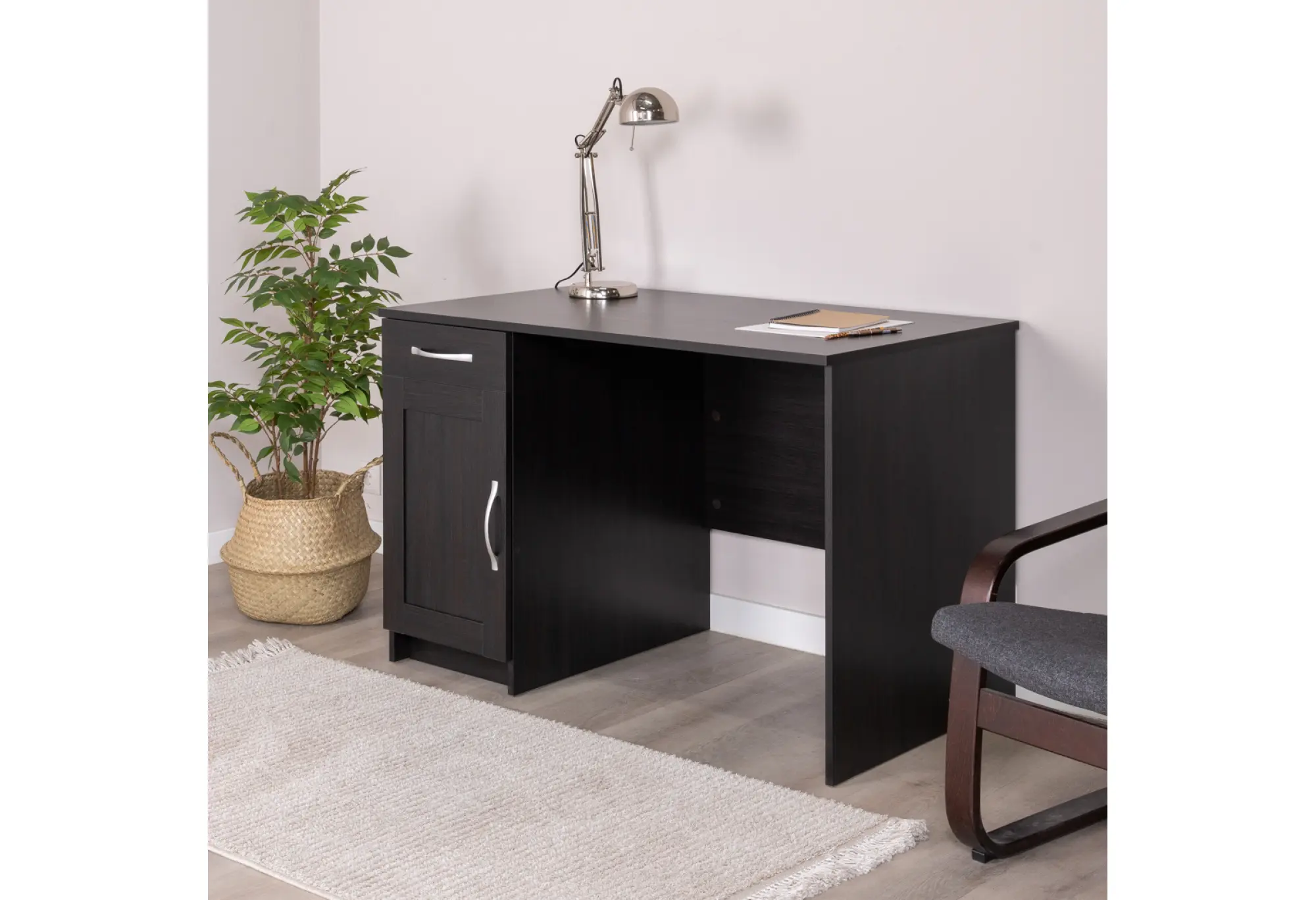 Практичная тумба с распашной дверцей и наружный выдвижной ящик помогают держать рабочее пространство в порядке - внутри удобно размещать папки, бумаги, расходные материалы и личные вещи. Конструктивная особенность стола позволяет установить тумбу с ящиком как справа, так и слева под столешницей, подстраивая рабочую зону под ваши привычки и особенности планировки.