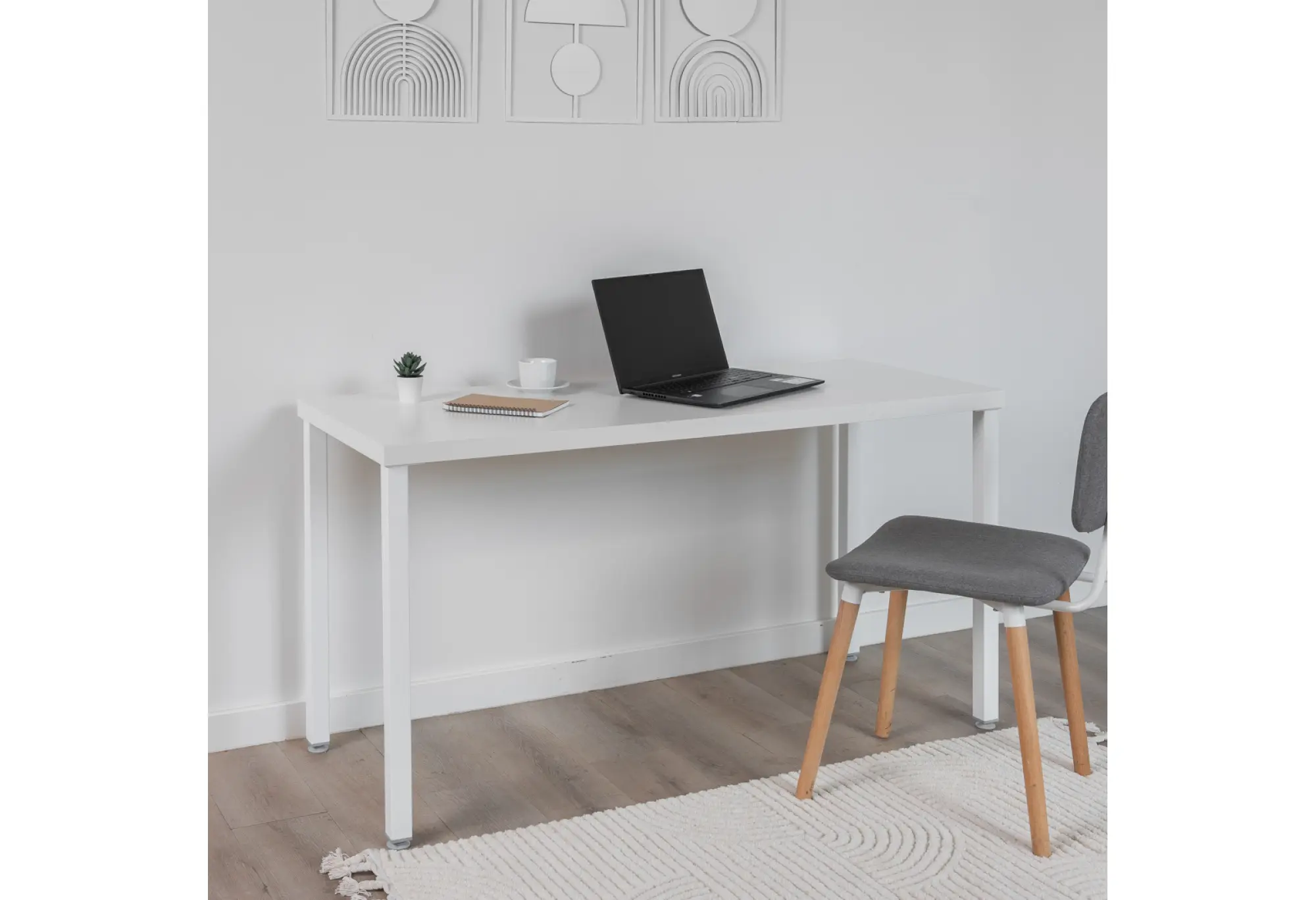 Металлические ножки окрашены в белый цвет, образуя с столешницей единый лаконичный силуэт. Регулируемые опоры ножек позволяют компенсировать неровности пола и обеспечить устойчивость стола без лишних усилий. Поверхности корпуса из ДСП декорированы бумагой и окрашены УФ-материалами, что делает их более устойчивыми к повседневным воздействиям и облегчает уход.
