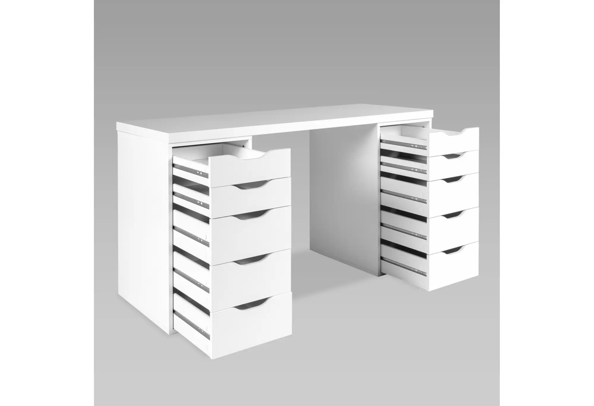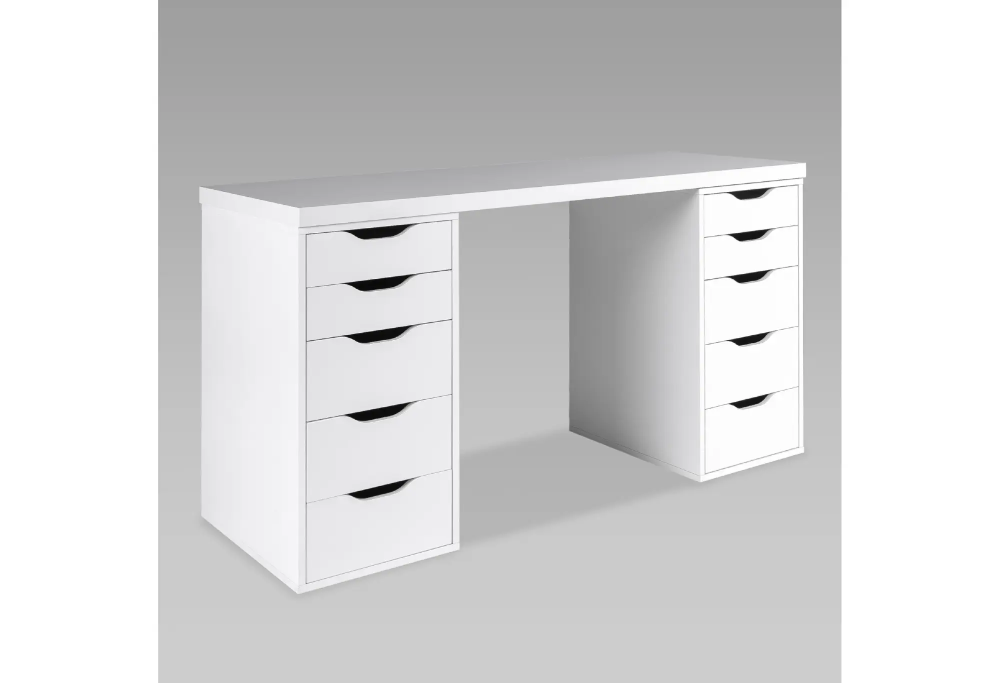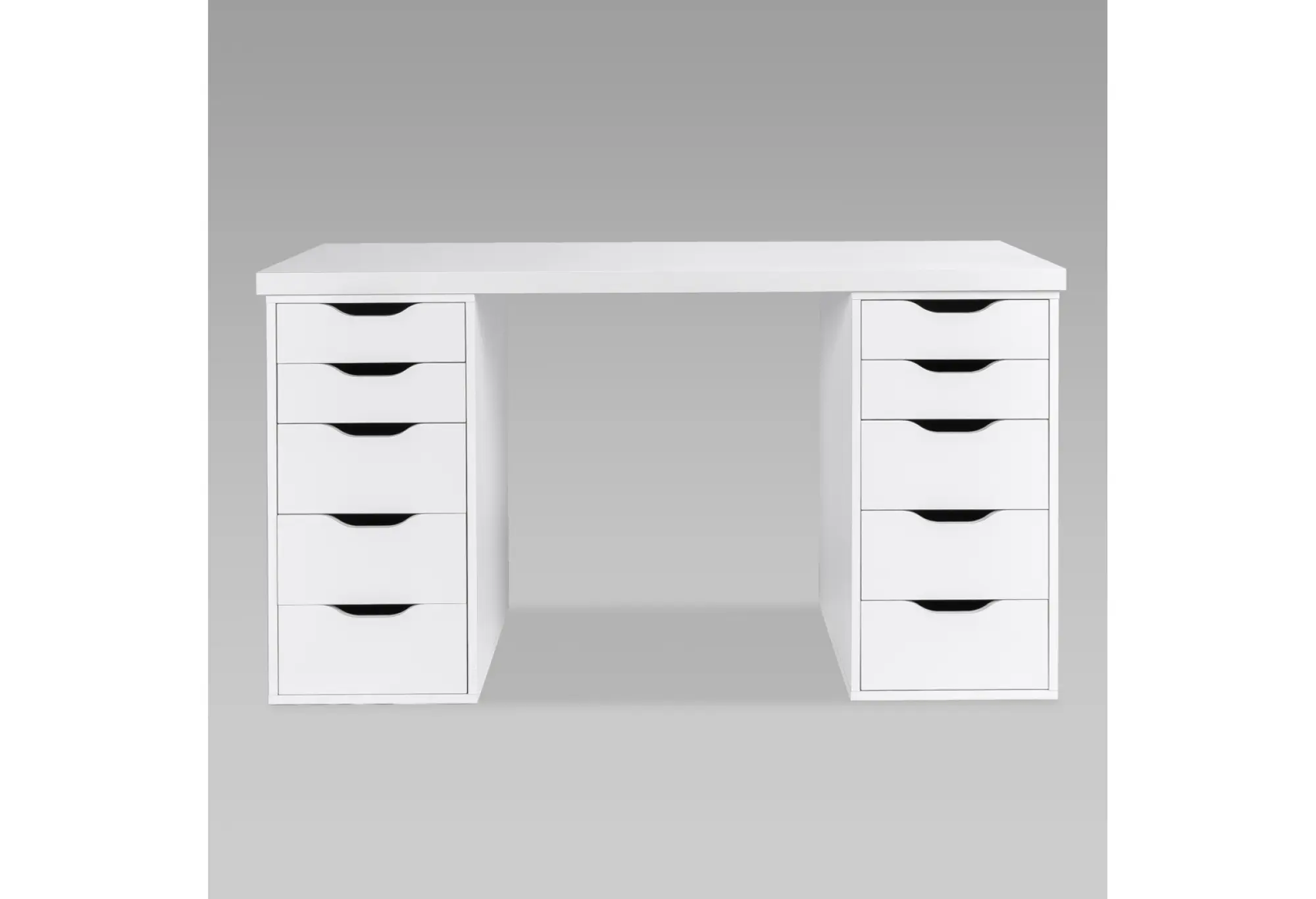 Стол письменный Ингар 2/55, 140x75x55, цвет Белый. Стол комплектуется столешницей и двумя тумбами под столешницу с пятью выдвижными ящиками в каждой тумбе. Конструкция столешницы - тамбурат (рамка из ДСП и HDF с сотовым заполнением) - популярная современная технология, активно внедряемая крупнейшими производителями для изготовления мебели по скандинавским стандартам. Конструкция тумб стола: ДСП, поверхность, декорированная бумага, окраска УФ материалами. Фасады ящиков без ручек, с вырезами для удобного выдвижения. Ящики переменной высоты позволяют использовать их для хранения разнообразных предметов. Преимущества: облегченная конструкция (тамбурат); высокая прочность, устойчивость; простая, быстрая сборка; эстетичный внешний вид. Гарантийный срок для жилых и общественных помещений 24 месяца.