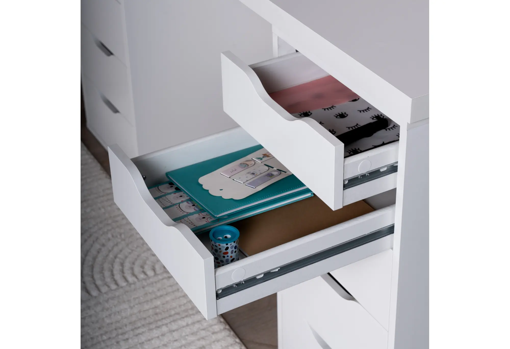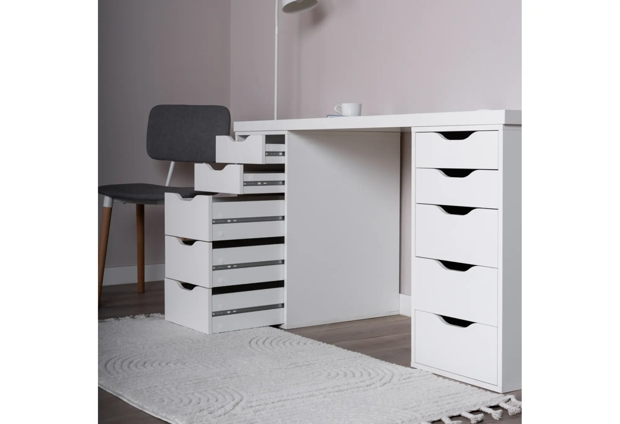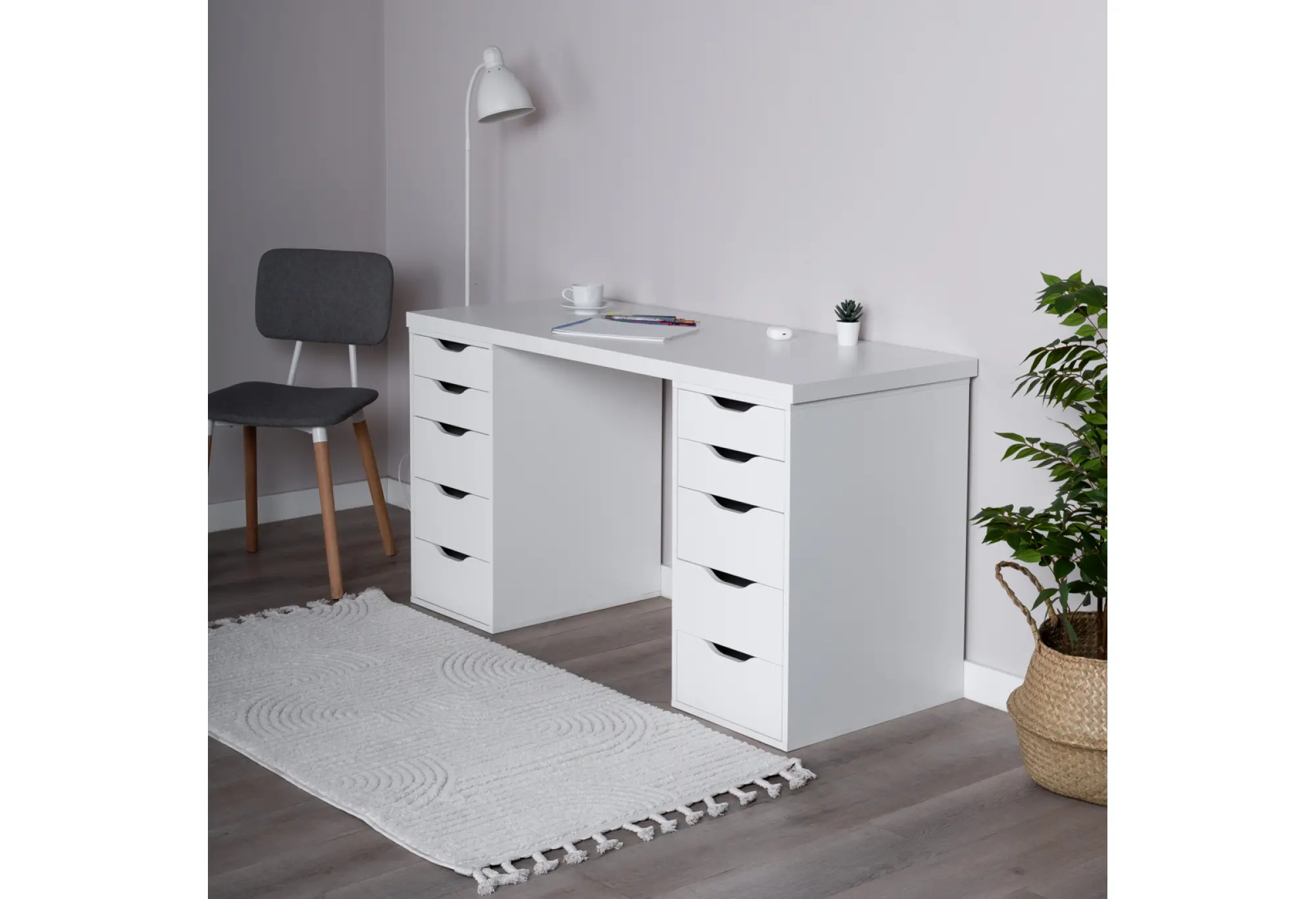 Стол письменный Ингар 2/55, 140x75x55, цвет Белый. Стол комплектуется столешницей и двумя тумбами под столешницу с пятью выдвижными ящиками в каждой тумбе. Конструкция столешницы - тамбурат (рамка из ДСП и HDF с сотовым заполнением) - популярная современная технология, активно внедряемая крупнейшими производителями для изготовления мебели по скандинавским стандартам. Конструкция тумб стола: ДСП, поверхность, декорированная бумага, окраска УФ материалами. Фасады ящиков без ручек, с вырезами для удобного выдвижения. Ящики переменной высоты позволяют использовать их для хранения разнообразных предметов. Преимущества: облегченная конструкция (тамбурат); высокая прочность, устойчивость; простая, быстрая сборка; эстетичный внешний вид. Гарантийный срок для жилых и общественных помещений 24 месяца.
