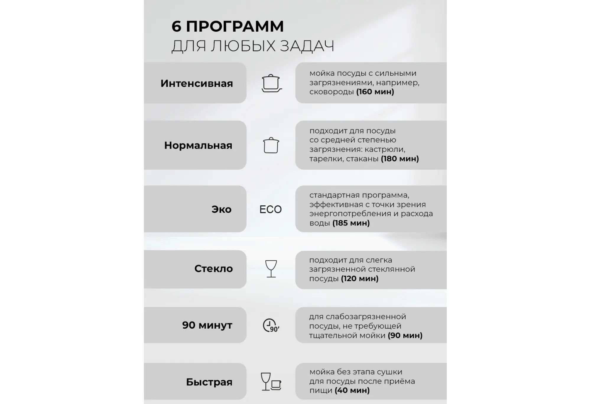 6 (нормальный, интенсивный, экономный, стекло, 90 минут, быстрый)