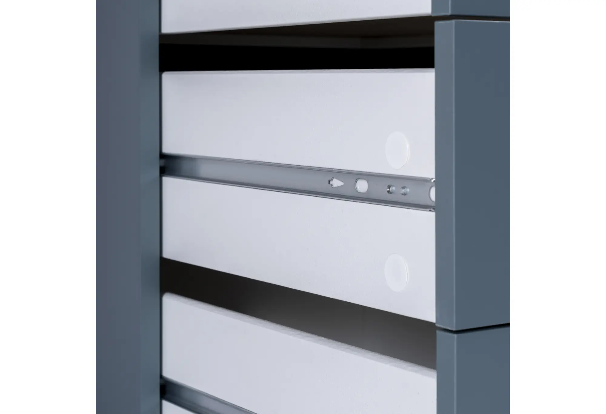 Фасады ящиков выполнены без выступающих ручек — открывание осуществляется за счет аккуратных вырезов. Это визуально облегчает конструкцию и уменьшает риск зацепиться за мебель в узком проходе. Ящики разной высоты удобно использовать для хранения текстиля, белья, документов, аксессуаров или мелких предметов - верхние — для небольших вещей, нижние — для более объемных.