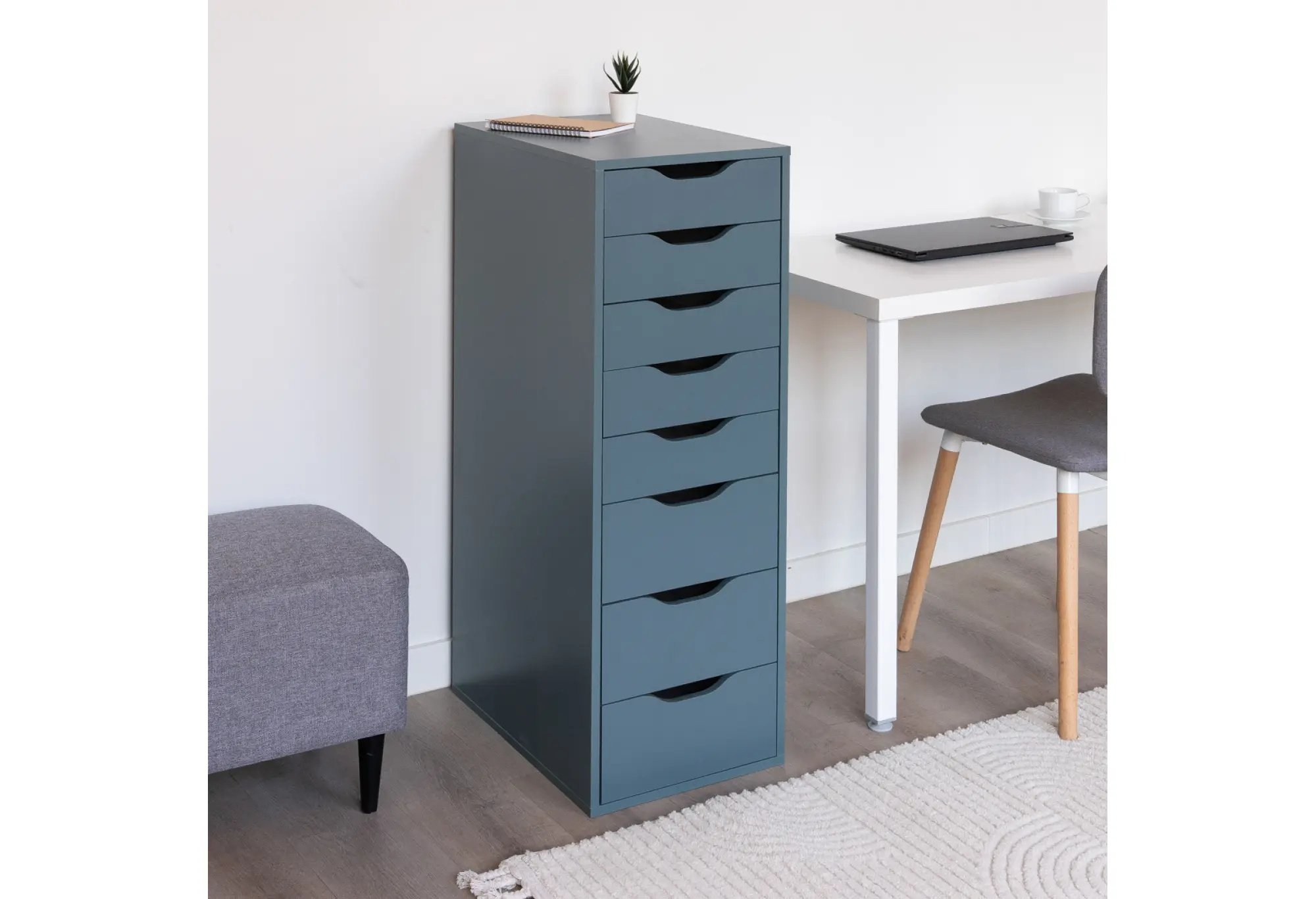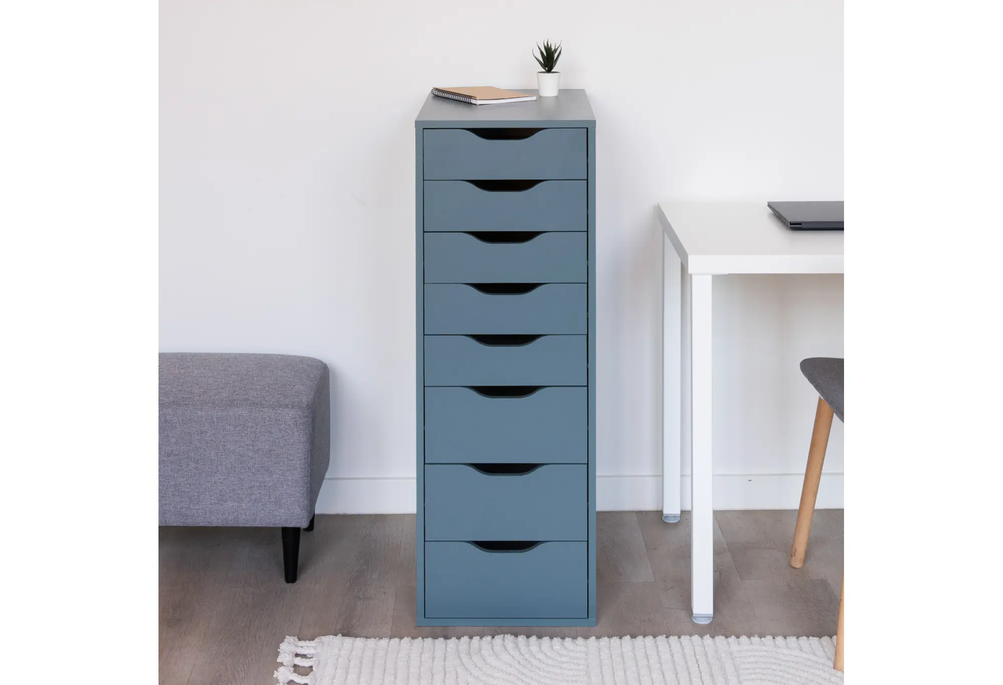 Высокий и узкий комод «Ингар 8» в серо-бирюзовом цвете — удобное решение для хранения в небольшой комнате или узком пространстве. При ширине 360 мм и высоте 1020 мм он занимает минимум места, обеспечивая при этом восемь выдвижных ящиков для разных типов вещей.
