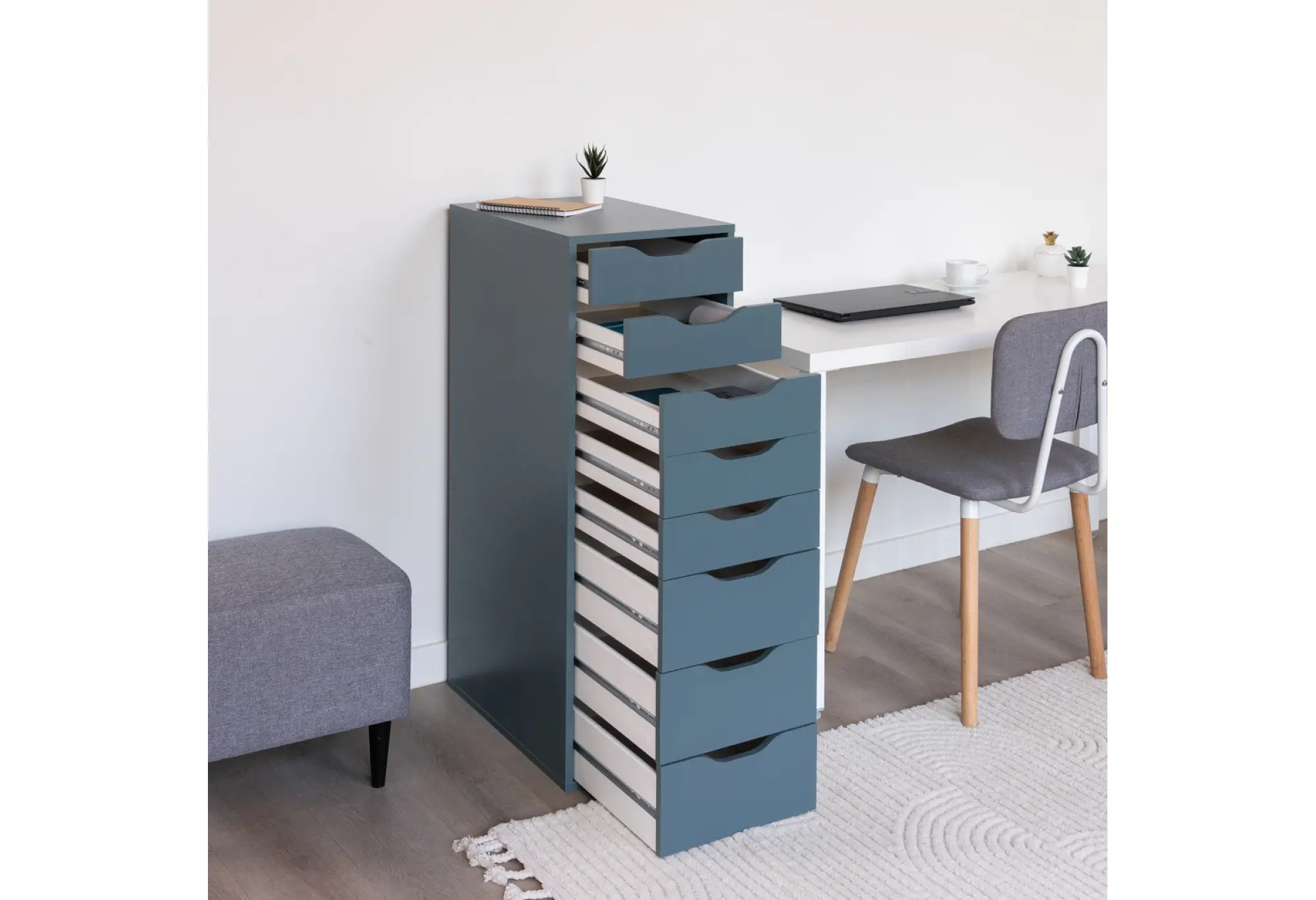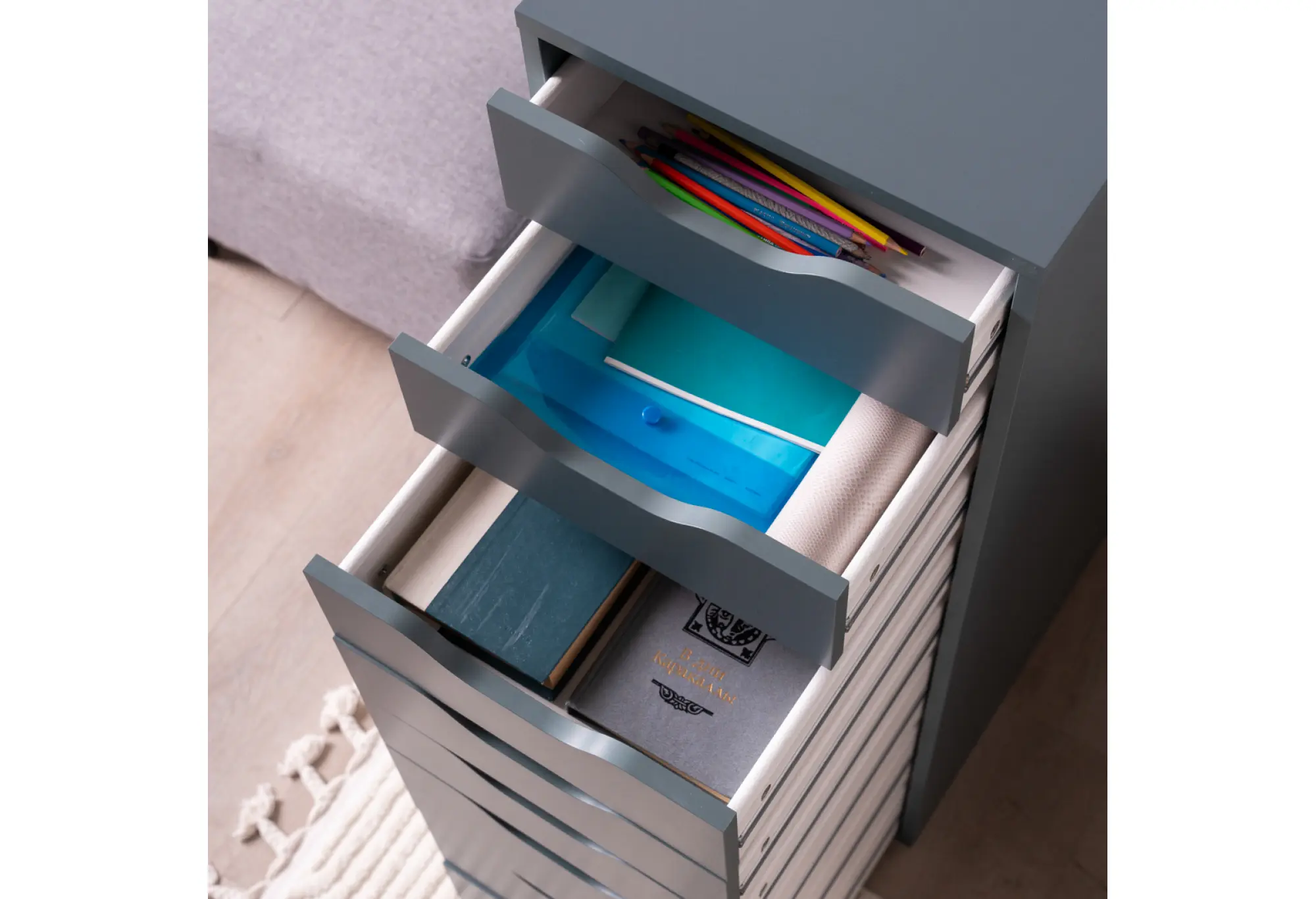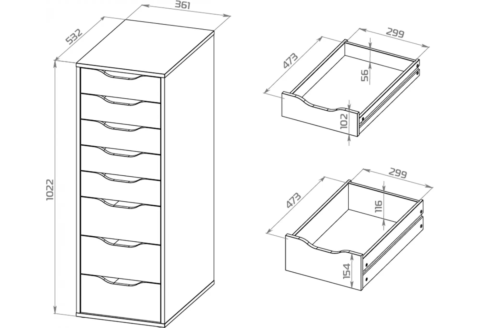- Восемь выдвижных ящиков переменной высоты