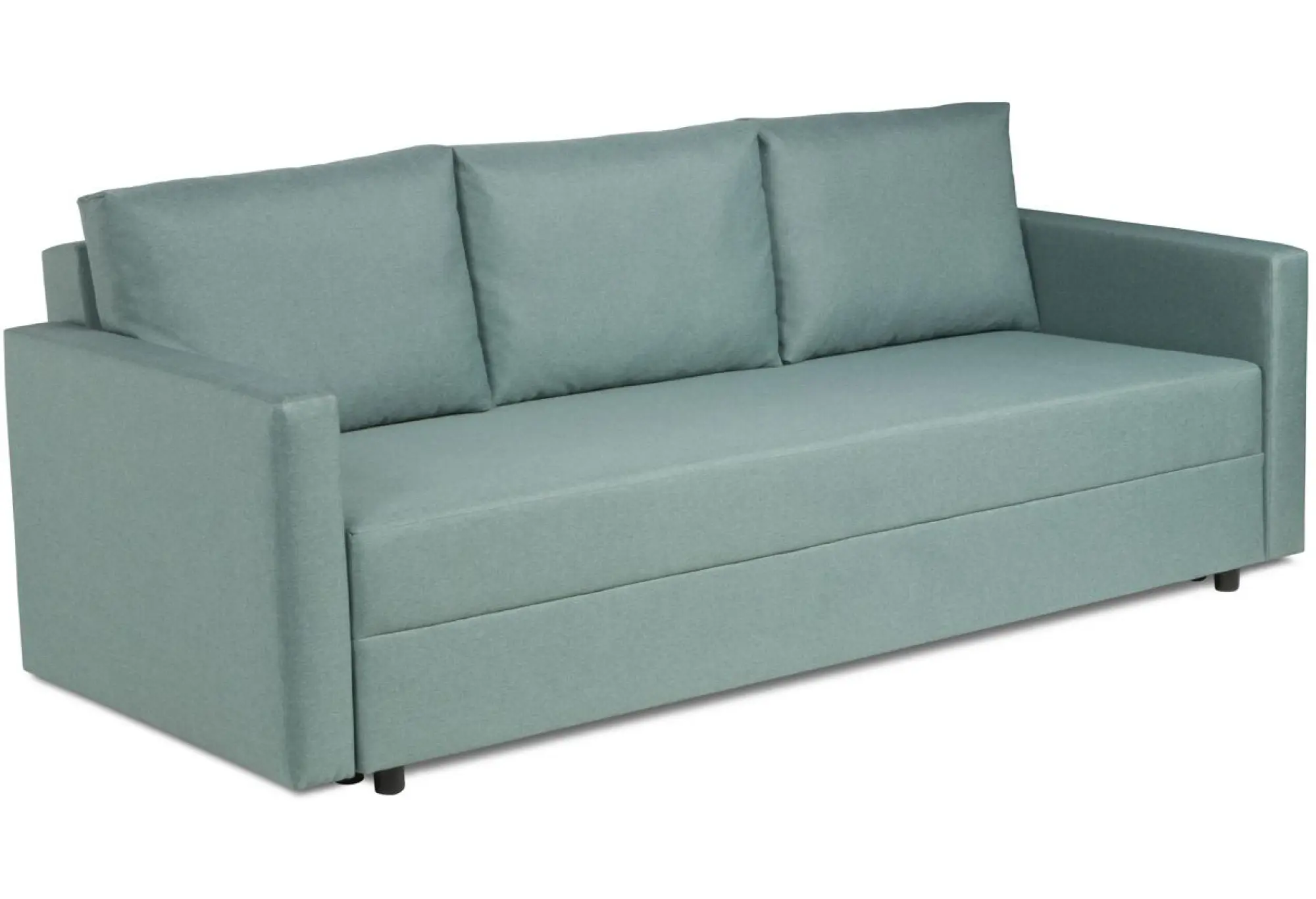 Мятно-серый диван-кровать в скандинавском стиле станет лаконичным акцентом современной гостиной или спальни. Прямые линии корпуса, узкие подлокотники и три объемные подушки создают сдержанный и аккуратный внешний вид, который легко сочетается как со светлой, так и с более насыщенной отделкой стен и текстиля.
