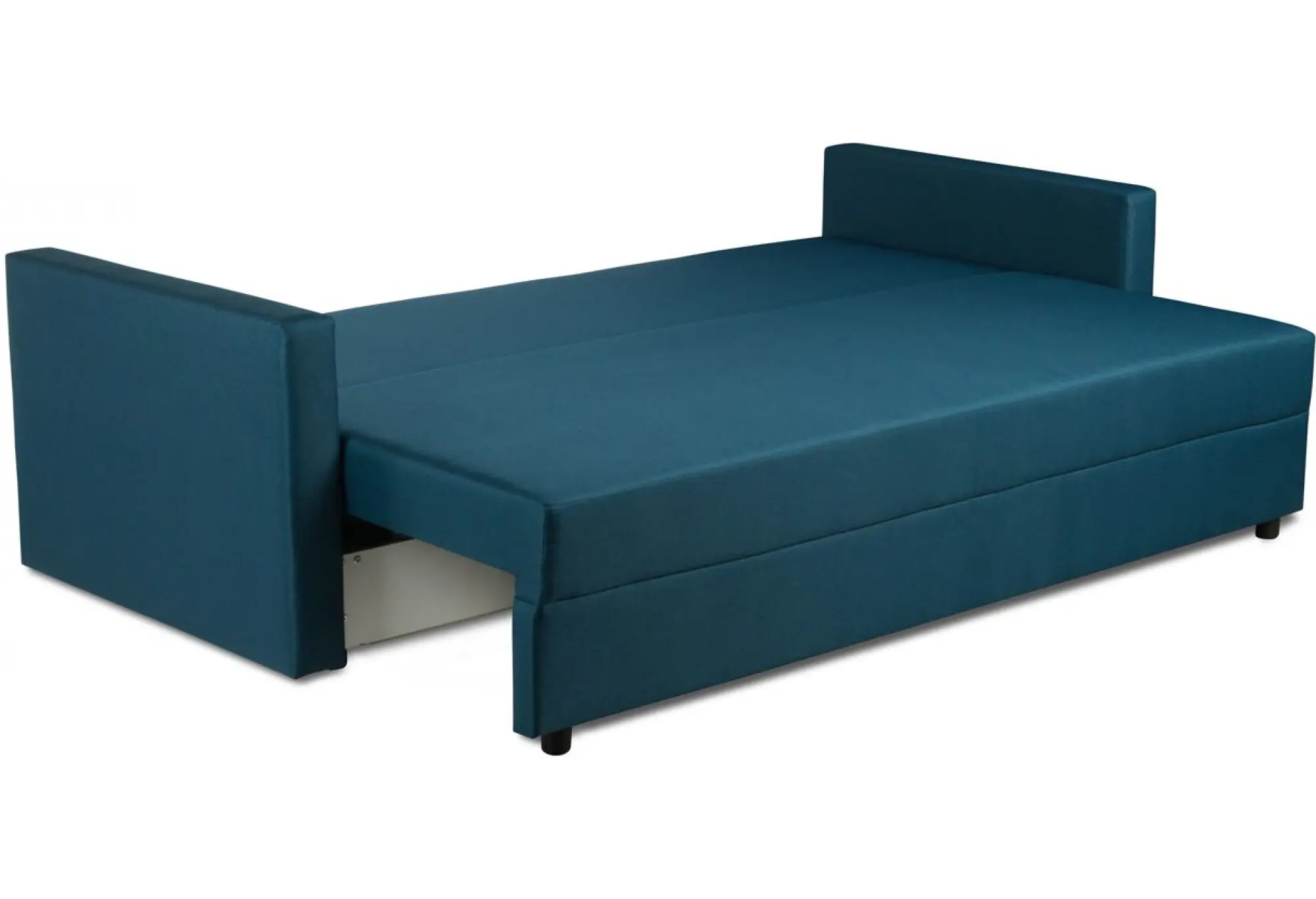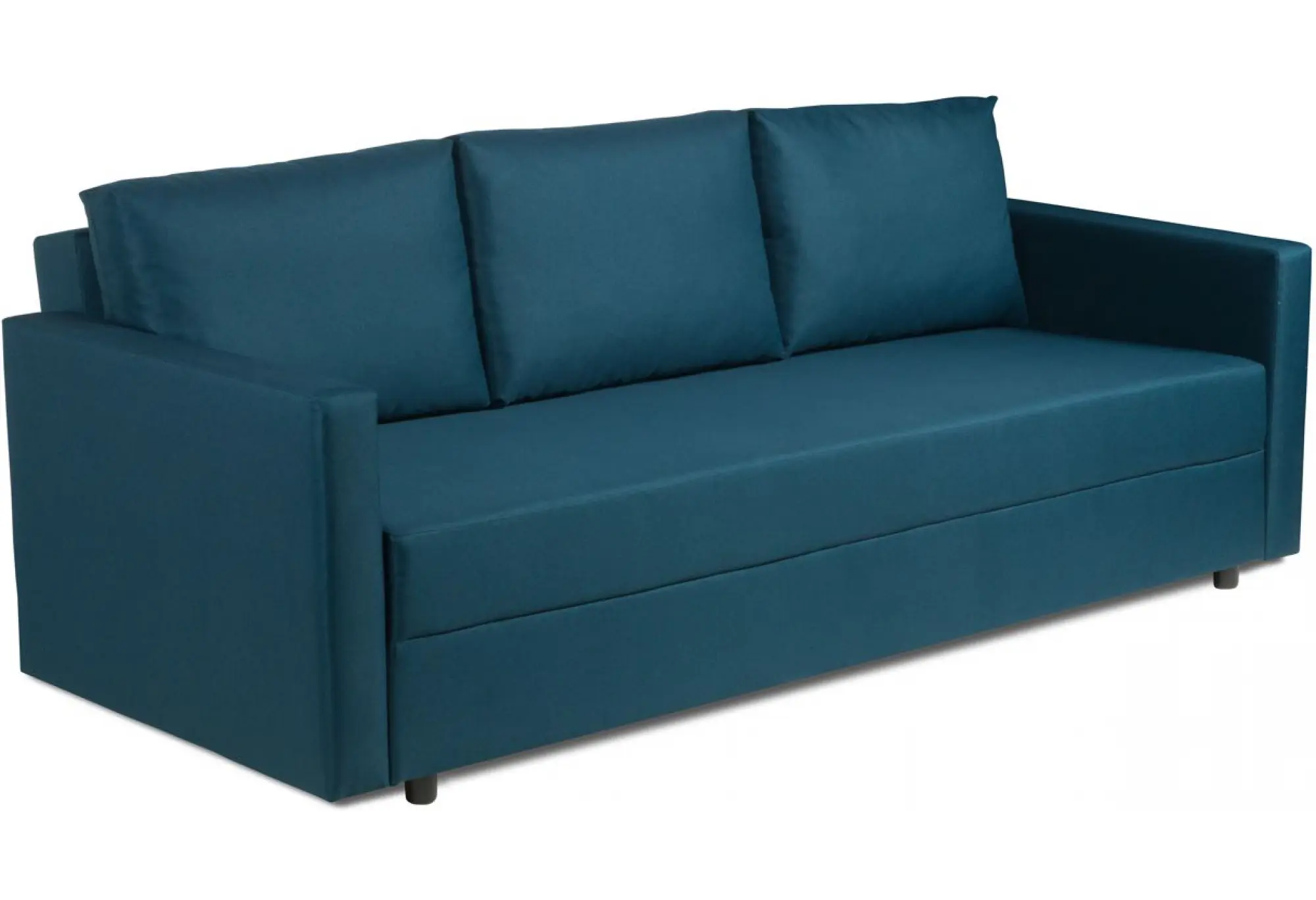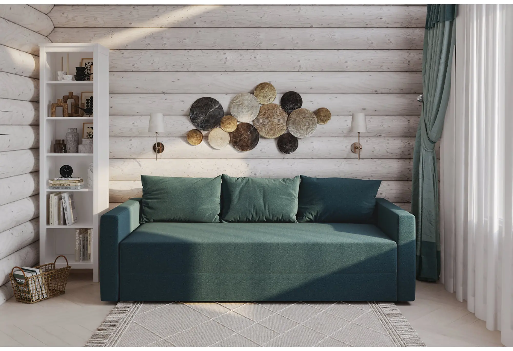 Диван-кровать Тойво в сине-зелёной рогожке — практичное решение для современной квартиры. Лаконичные прямые линии и скандинавский характер делают его уместным и в минималистичном интерьере, и в более уютной домашней обстановке. Глубокий сине-зелёный оттенок добавляет комнате выразительный акцент, не перегружая пространство.