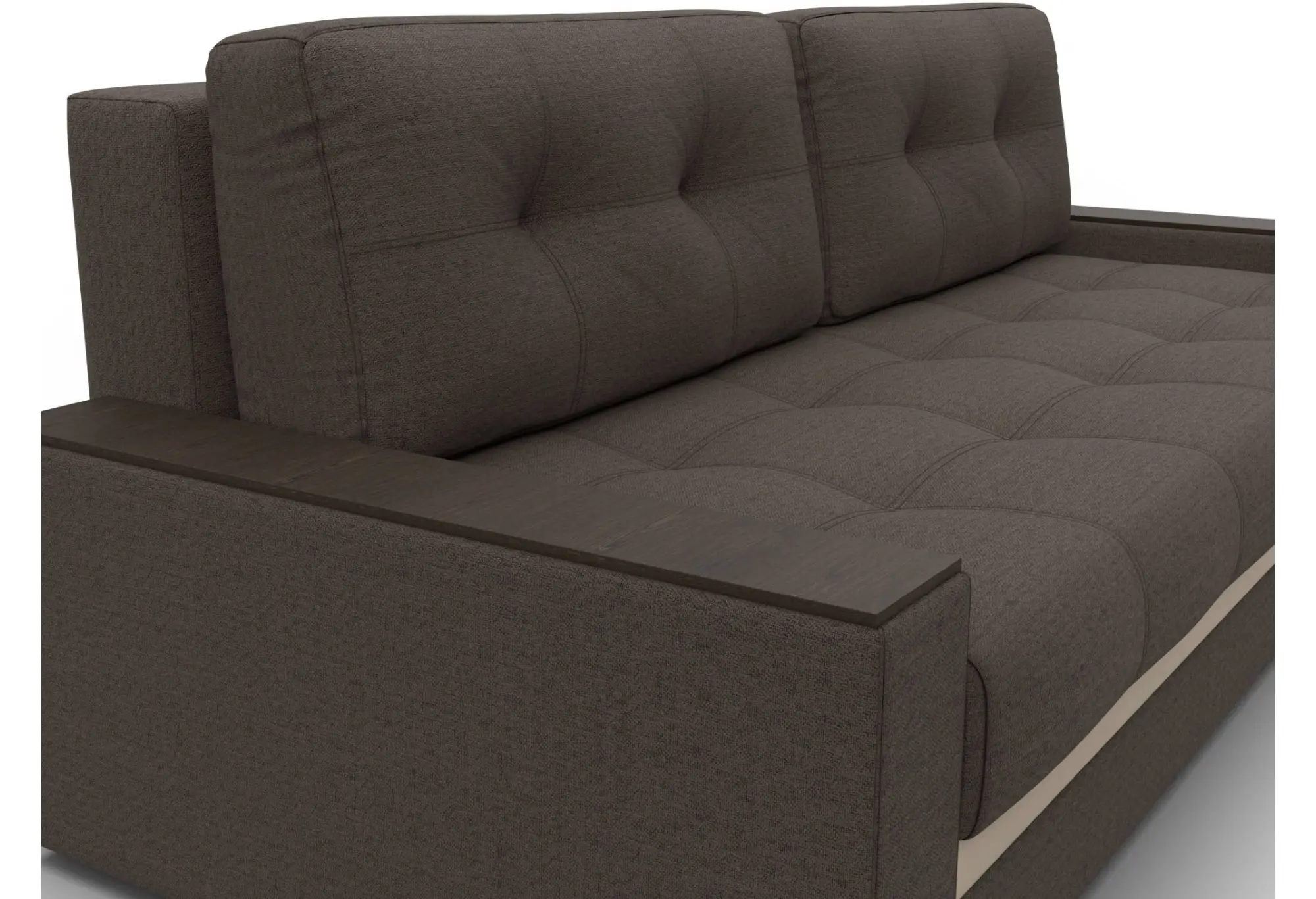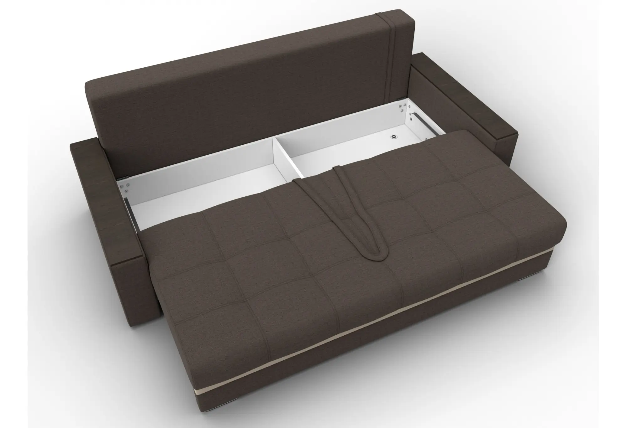 Удобный механизм «еврокнижка» превращает диван в просторную кровать, обеспечивая комфортный сон для двоих. Под сиденьем расположены две большие ниши для хранения белья, что делает его еще более практичным. Благодаря наличию широких подлокотников и двух спинных подушек, диван идеально подходит как для отдыха, так и для работы.