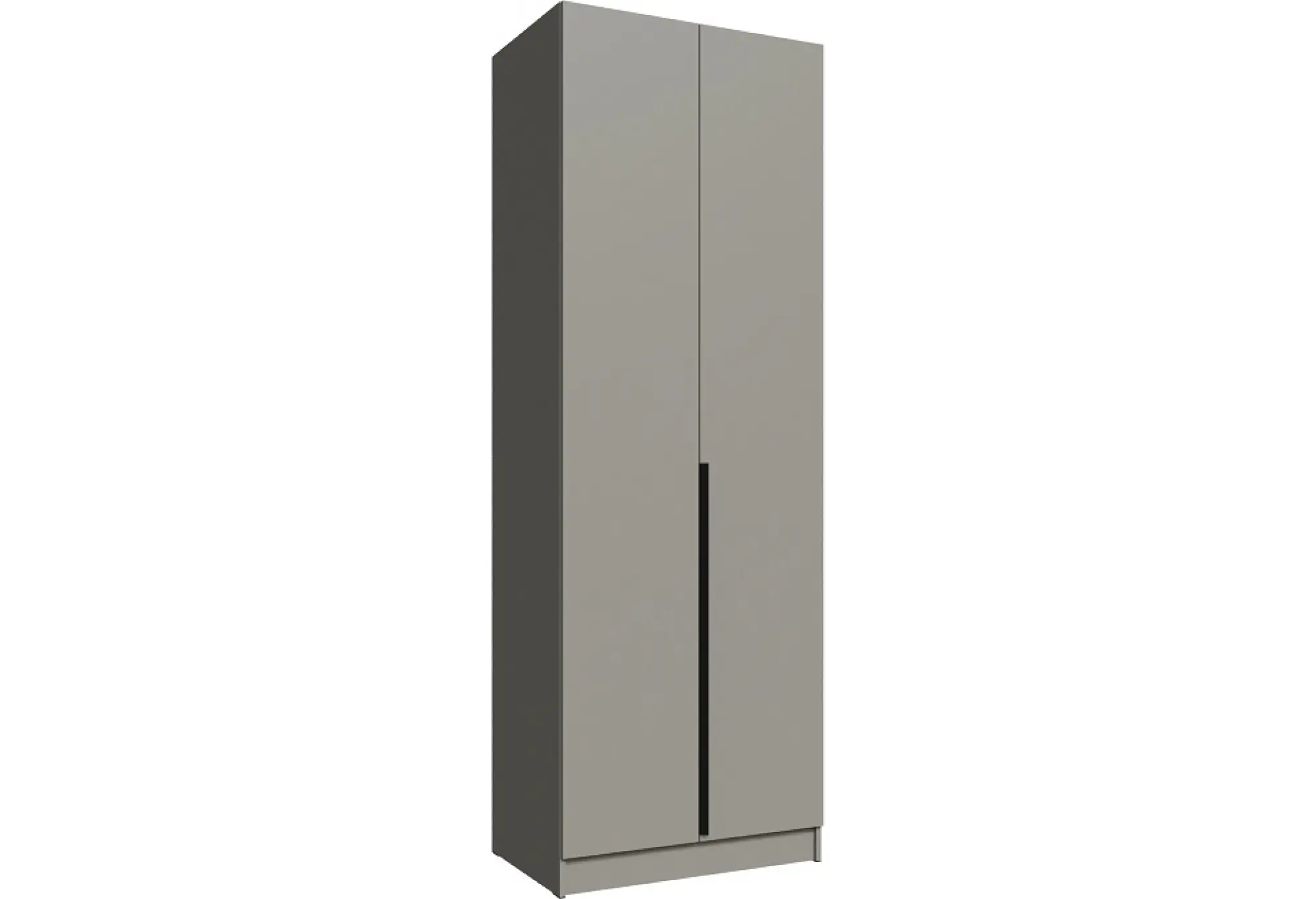 Фасады оснащены петлями «BRILON» без доводчиков — надёжная фурнитура обеспечивает стабильное открывание и закрывание дверей. Вертикальные металлические ручки чёрного цвета подчёркивают строгий геометричный силуэт шкафа и придают ему более современный характер. Пластиковые опоры-подпятники чёрного цвета защищают пол от царапин и облегчают выравнивание шкафа по уровню.
