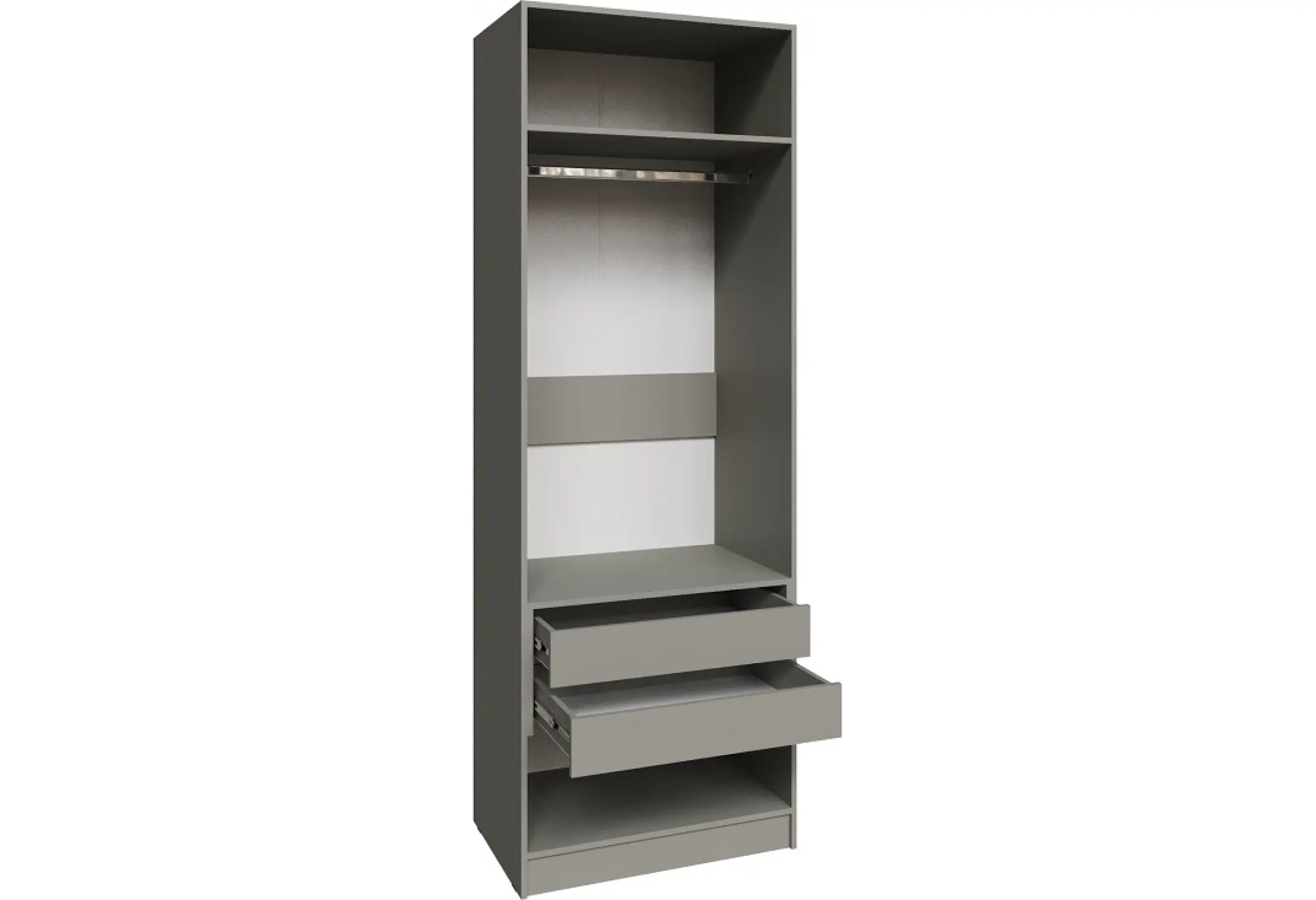 Внутри шкафа предусмотрена штанга для плечиков и ящики, которые удобно использовать для белья, аксессуаров и мелких предметов. Такое сочетание наполнения делает хранение более организованным - повседневные вещи и одежда на вешалках остаются на виду, а личные мелочи скрыты в выдвижных секциях.