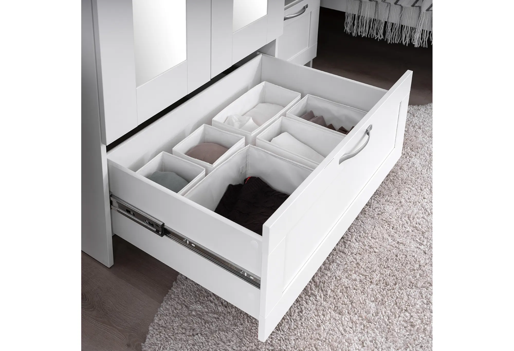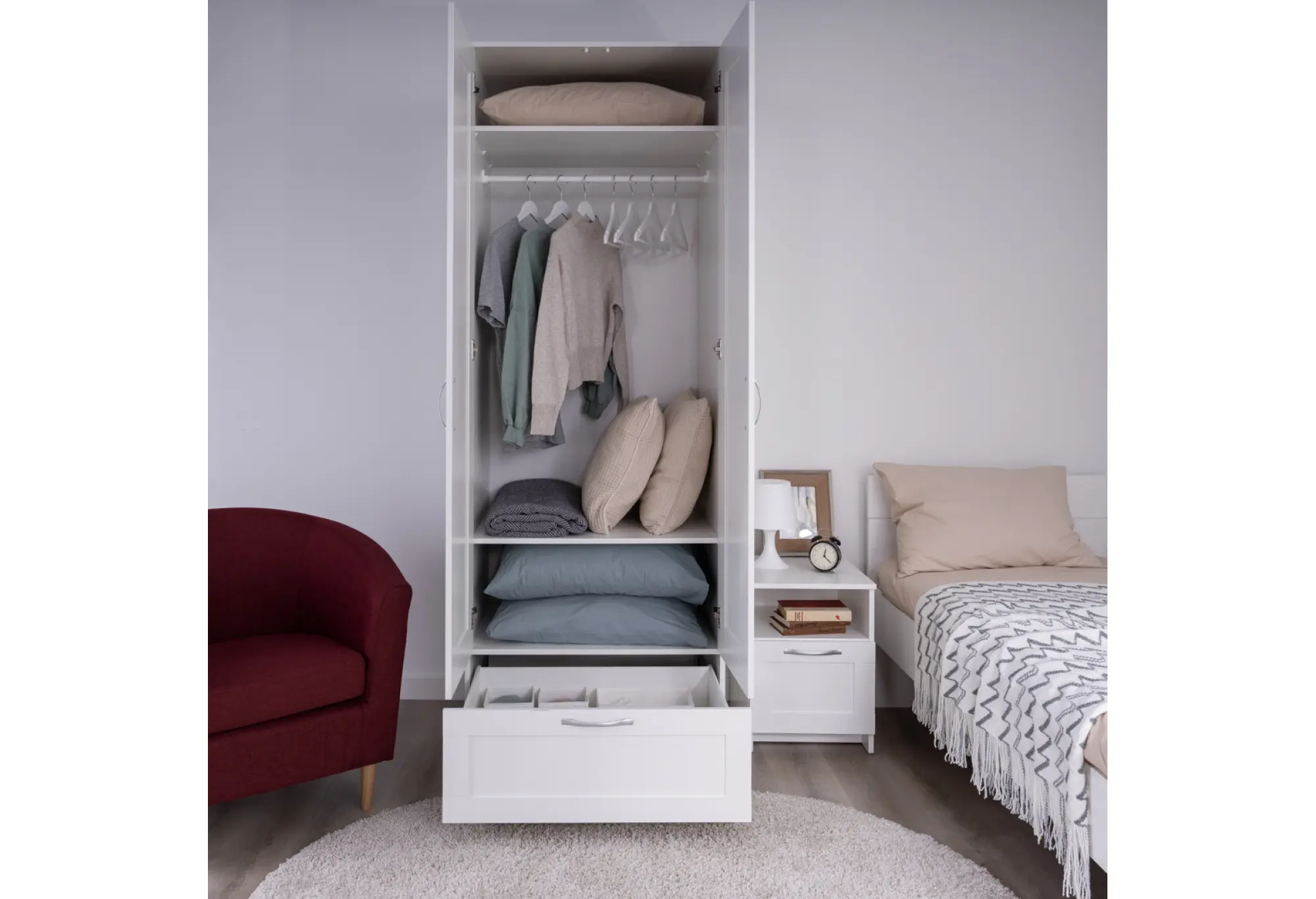 В нижней части расположен выдвижной ящик на всю ширину шкафа. Он подходит для хранения белья, аксессуаров, домашних текстильных принадлежностей или сезонных мелочей, которые важно держать под рукой. Фурнитура подобрана в спокойном, нейтральном дизайне, удобна для ежедневного открывания и закрывания.