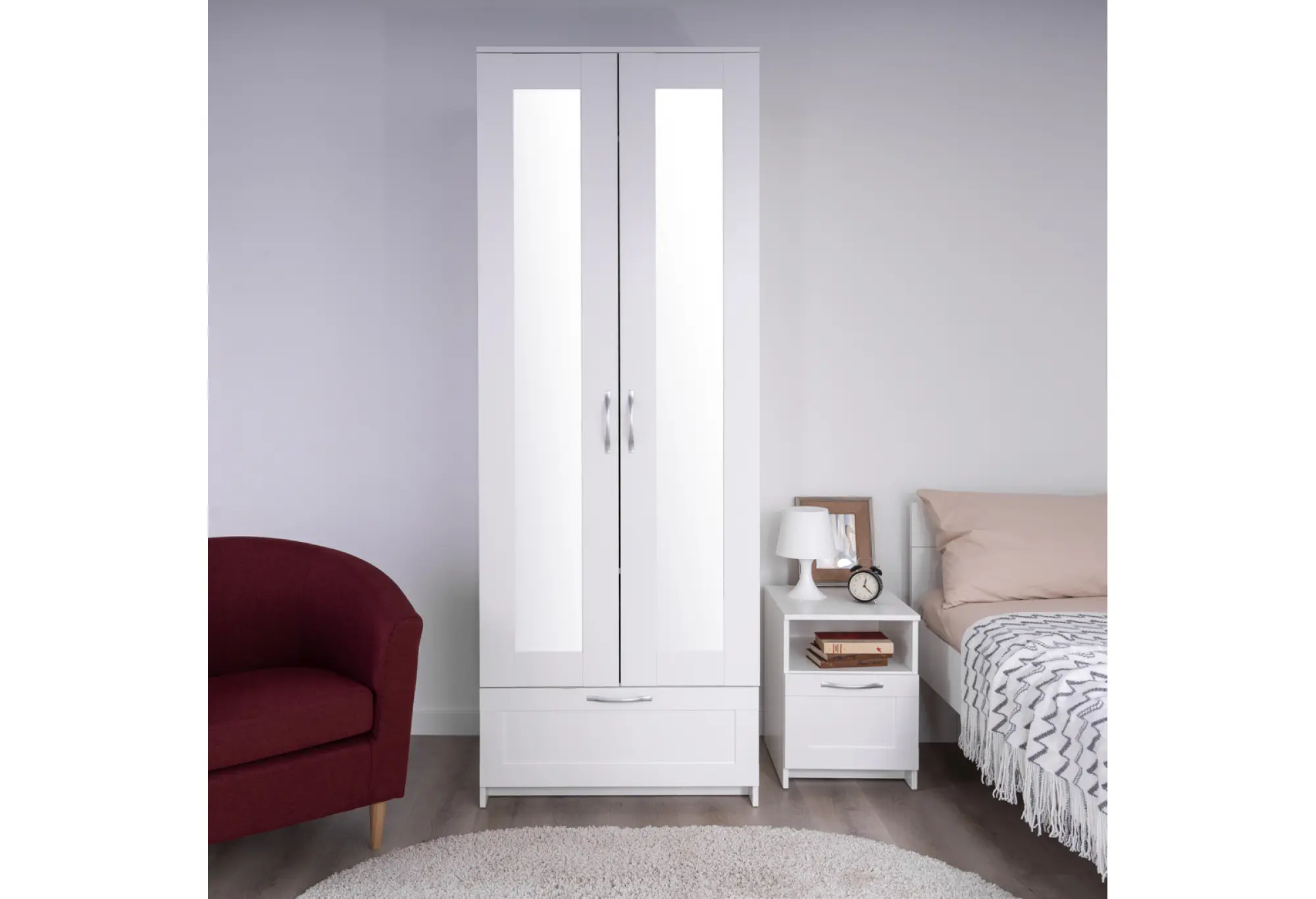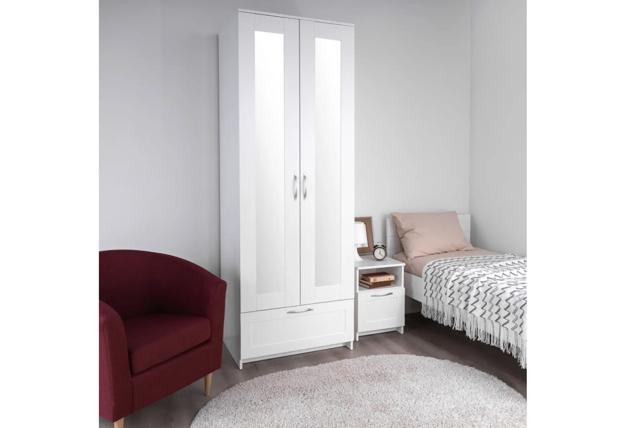 Две распашные двери оборудованы вертикальными зеркалами практически на всю высоту фасада. Это удобно для ежедневного использования - можно оценить образ в полный рост, не занимая дополнительное место под отдельное зеркало. За дверьми предусмотрено внутреннее пространство для одежды — его можно использовать для развешивания вещей на плечиках и размещения сложенных предметов гардероба (конкретное наполнение зависит от выбранной комплектации серии).