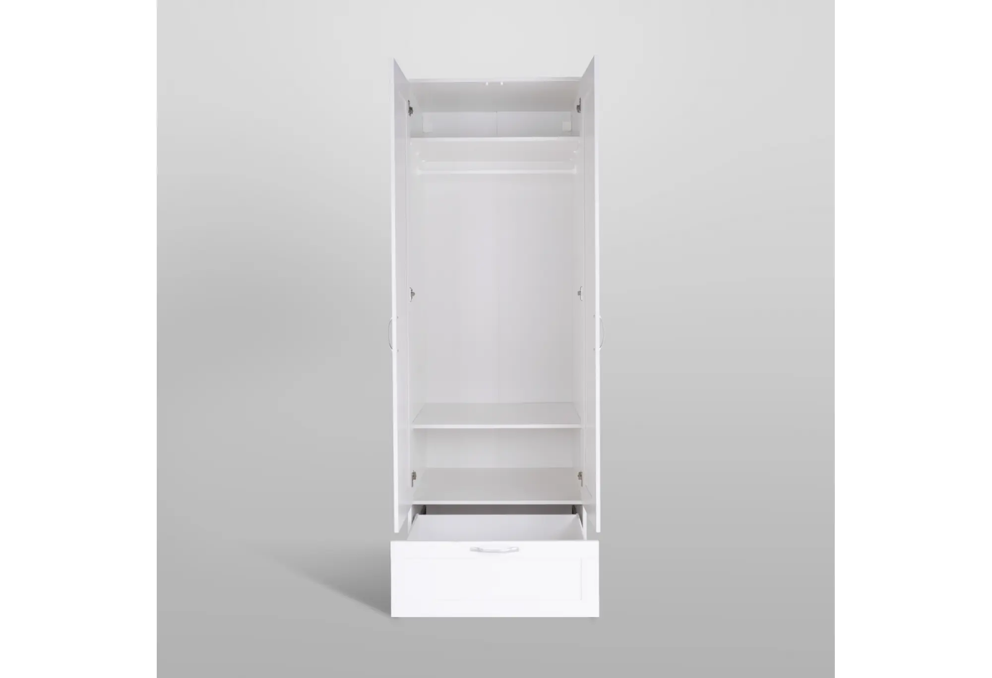 Двухдверный шкаф СИРИУС в белом цвете — функциональное решение для хранения одежды в спальне, прихожей или гардеробной. Корпус выполнен из кашированного ДСП толщиной 16 мм, что обеспечивает устойчивость конструкции и аккуратный внешний вид. Лаконичный белый цвет визуально «облегчает» мебель и позволяет шкафу органично вписаться как в светлый, так и в контрастный интерьер.