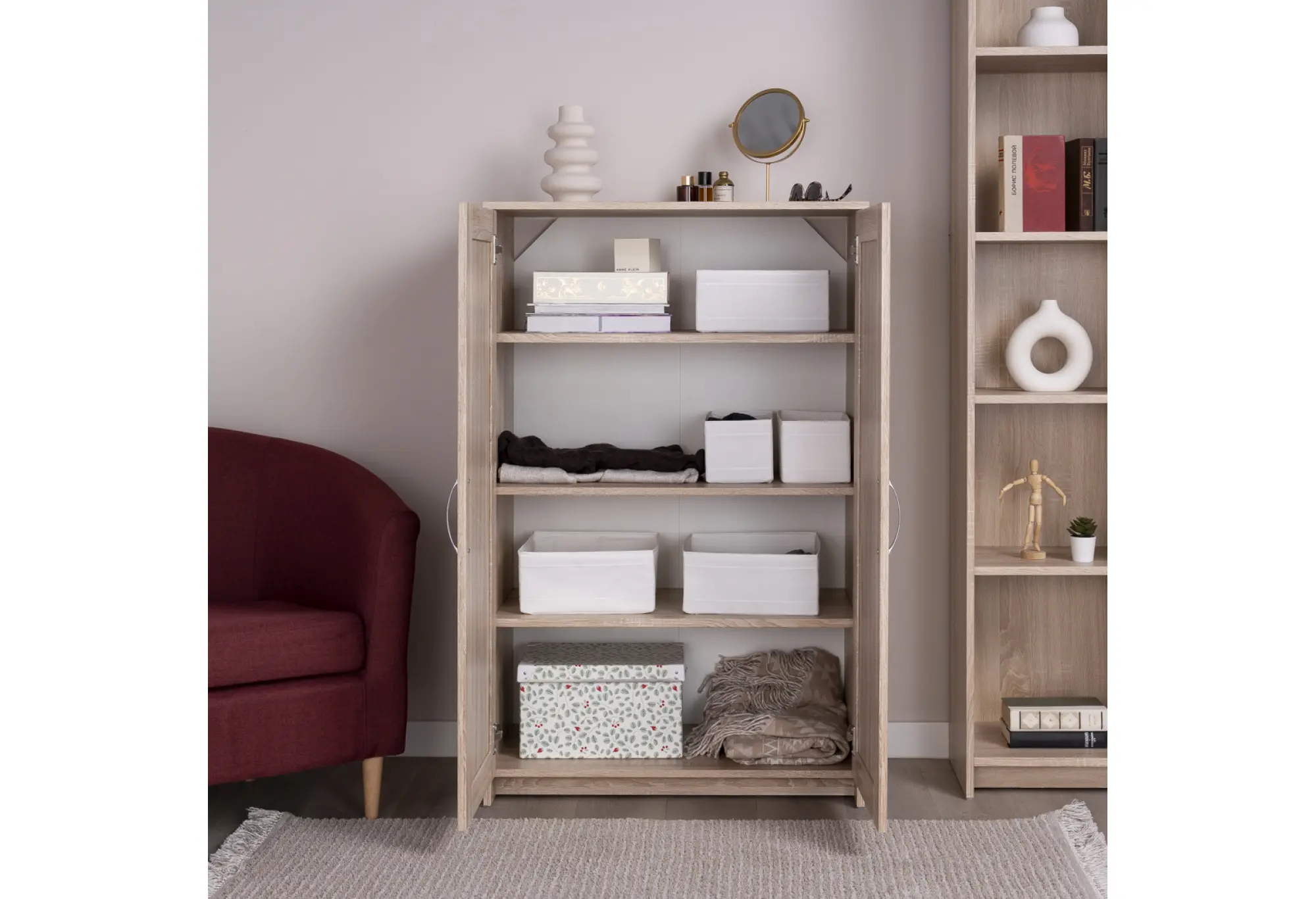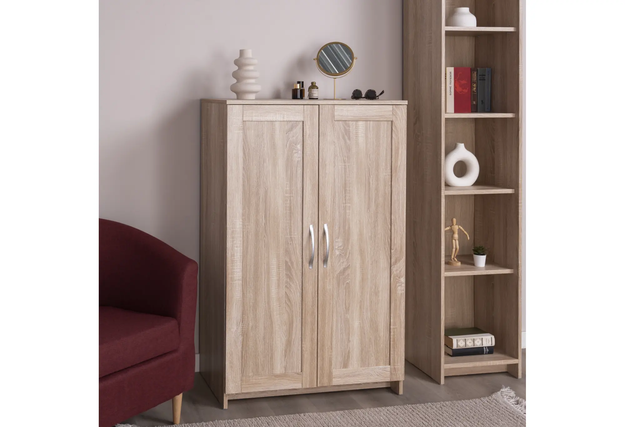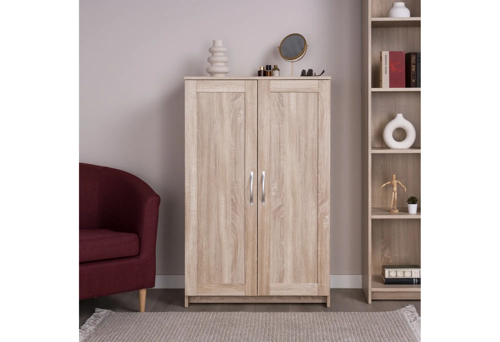 Габариты 782×412×1234 мм позволяют размещать тумбу вдоль стены, не загромождая пространство, при этом высота создает достаточный внутренний объем для вещей. Две распашные двери оборудованы удобными вертикальными ручками нейтрального оттенка, которые визуально не перегружают фасад. Конструкция предполагает крепление тумбы к стене, что повышает безопасность эксплуатации и устойчивость, особенно при размещении в проходных зонах или общественных помещениях.