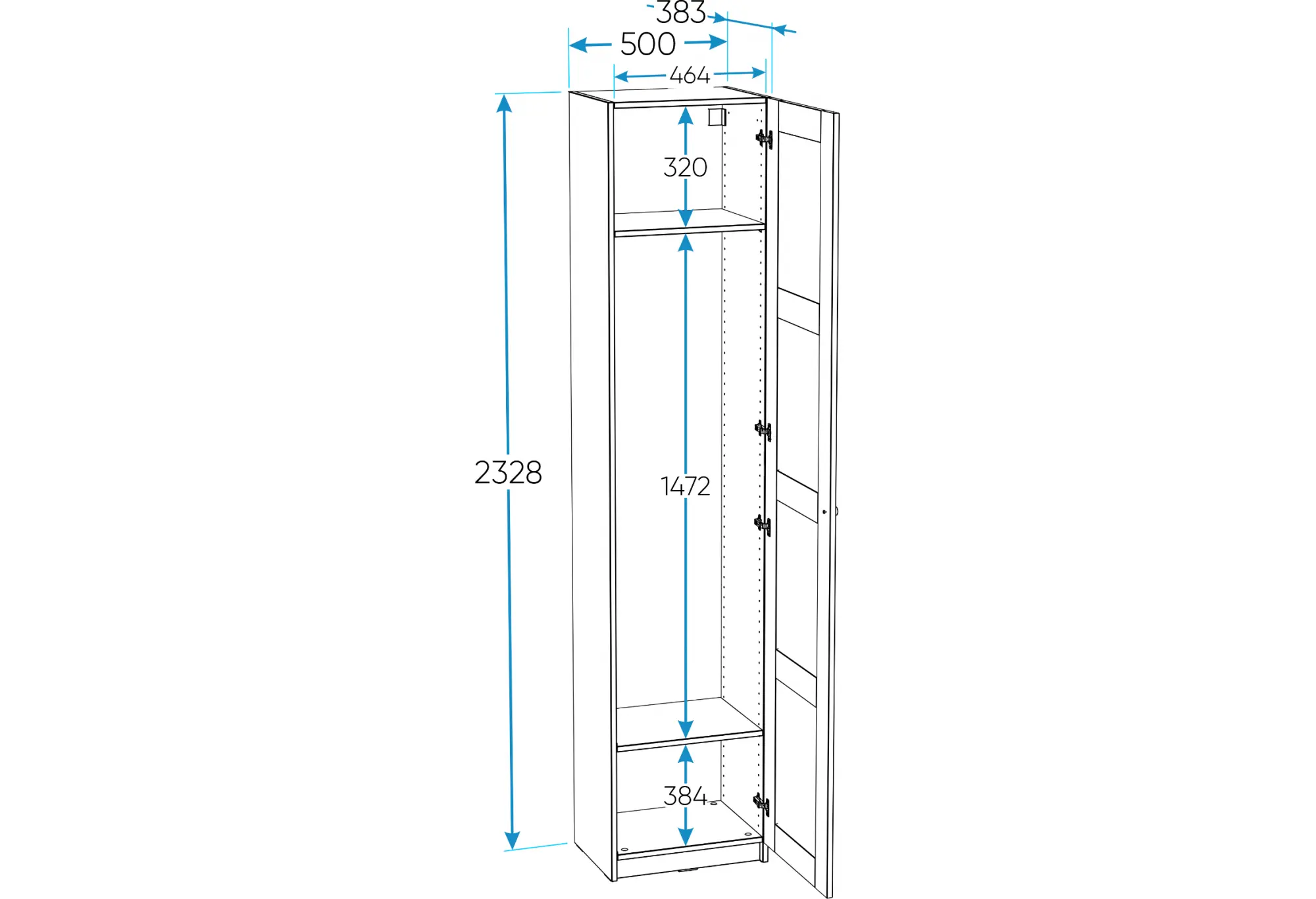 Узкий однодверный шкаф МАКС в белом цвете — практичное решение для хранения одежды в жилых и общественных помещениях. Корпус изготовлен из кашированного ДСП толщиной 18 мм, что обеспечивает необходимую жесткость конструкции при компактной ширине 500 мм и глубине 383 мм. Высота 2328 мм позволяет задействовать вертикальное пространство, не занимая лишнего места по ширине, что удобно для узких коридоров, небольших комнат или офисных зон.