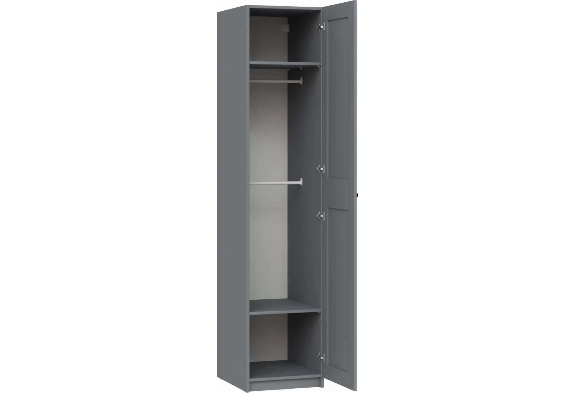 Однодверный шкаф МАКС в лаконичном сером цвете разработан для компактного и удобного хранения одежды в жилых и общественных помещениях. Благодаря ширине 50 см он легко вписывается в небольшие ниши, узкие коридоры и гардеробные зоны, не загромождая пространство. Нейтральный серый оттенок гармонирует с современными интерьерами и хорошо сочетается с другой мебелью в офисах, учебных и жилых пространствах.
