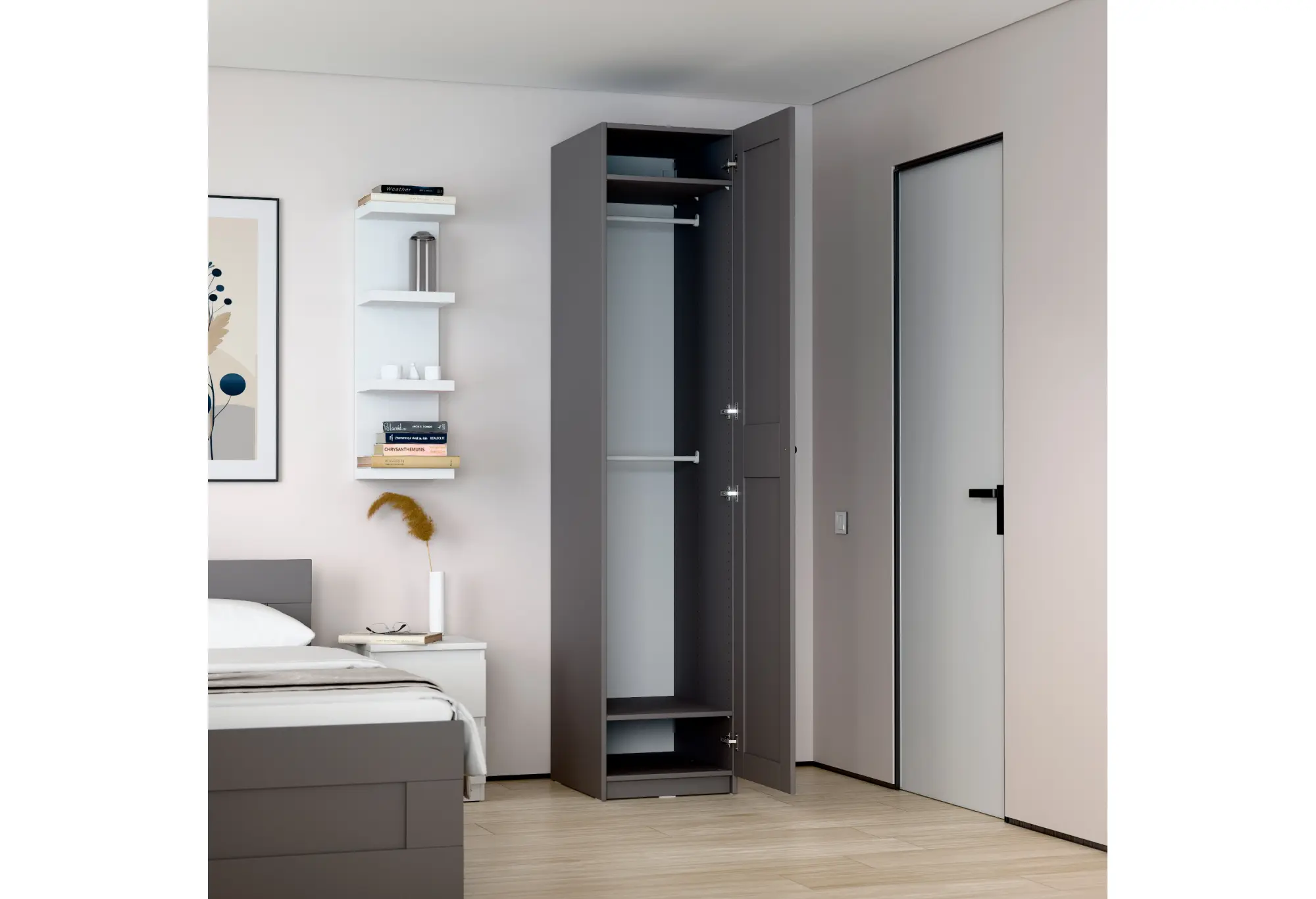 Корпус шкафа выполнен из кашированного ДСП толщиной 18 мм, что обеспечивает необходимую жесткость конструкции и устойчивость к повседневной эксплуатации. Внутри предусмотрены две полки и штанга для вешалок, что позволяет удобно разместить как одежду на плечиках, так и сложенные вещи, аксессуары или коробки для хранения. Такое деление внутреннего пространства делает шкаф функциональным при минимальных габаритах.