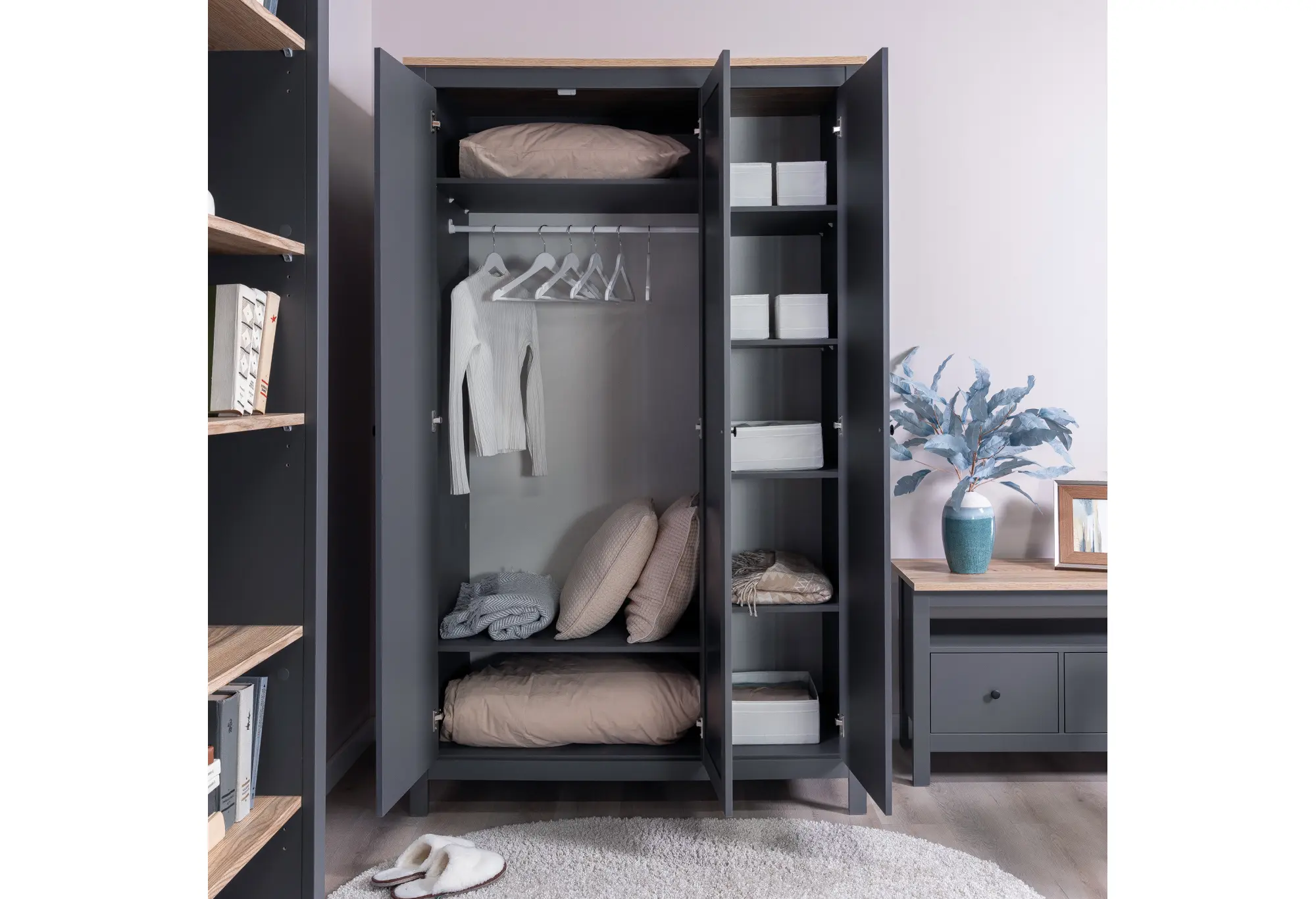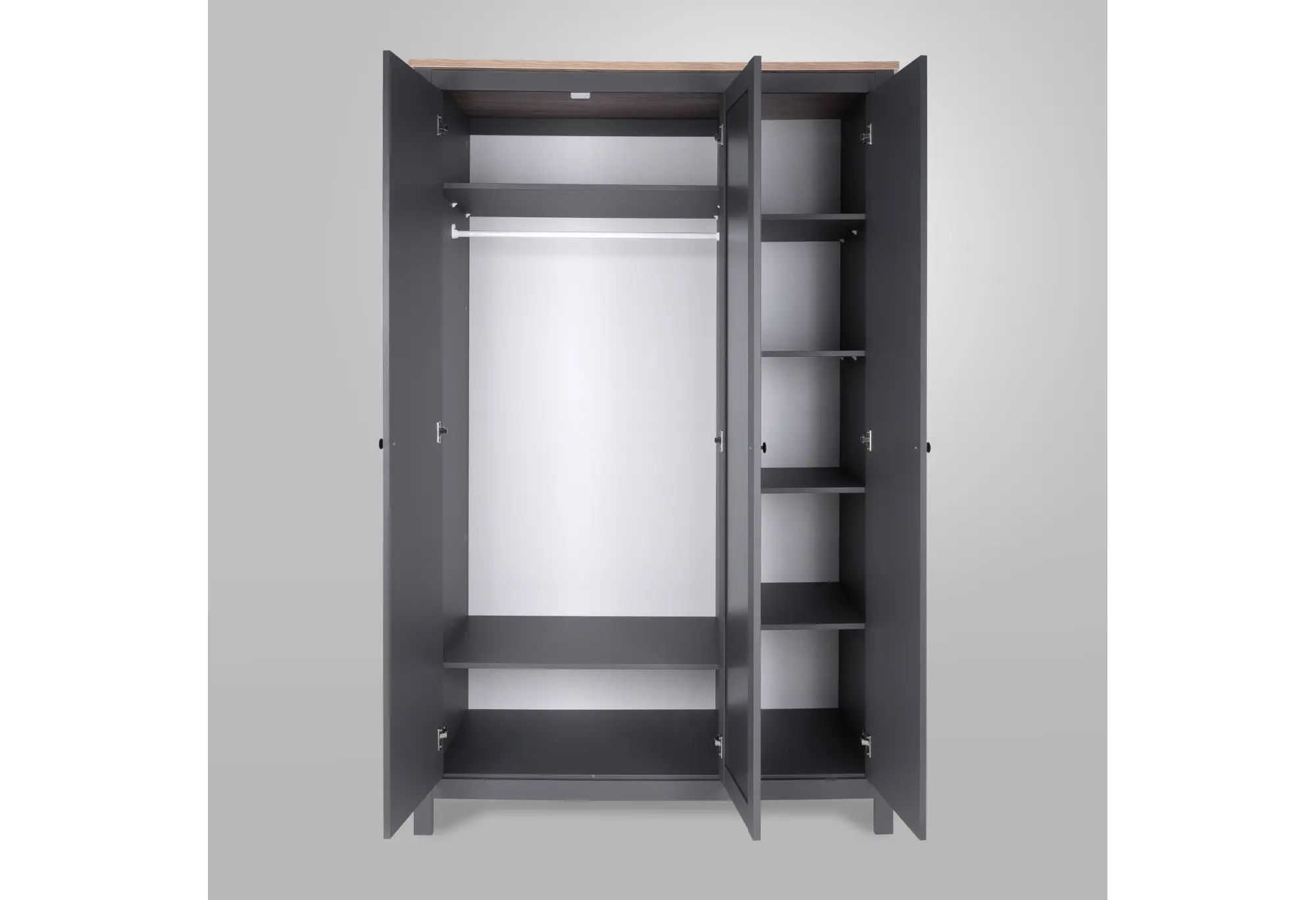 Трёхдверный шкаф «САГА» в цвете серый/ясень — функциональное решение для тех, кто ценит порядок и сдержанный современный дизайн. Корпус из ДСП обеспечивает стабильную геометрию и прочность конструкции, а сочетание глубокого серого цвета с верхней панелью под ясень делает шкаф визуально аккуратным и неброским, легко вписывающимся и в светлый, и в более контрастный интерьер.