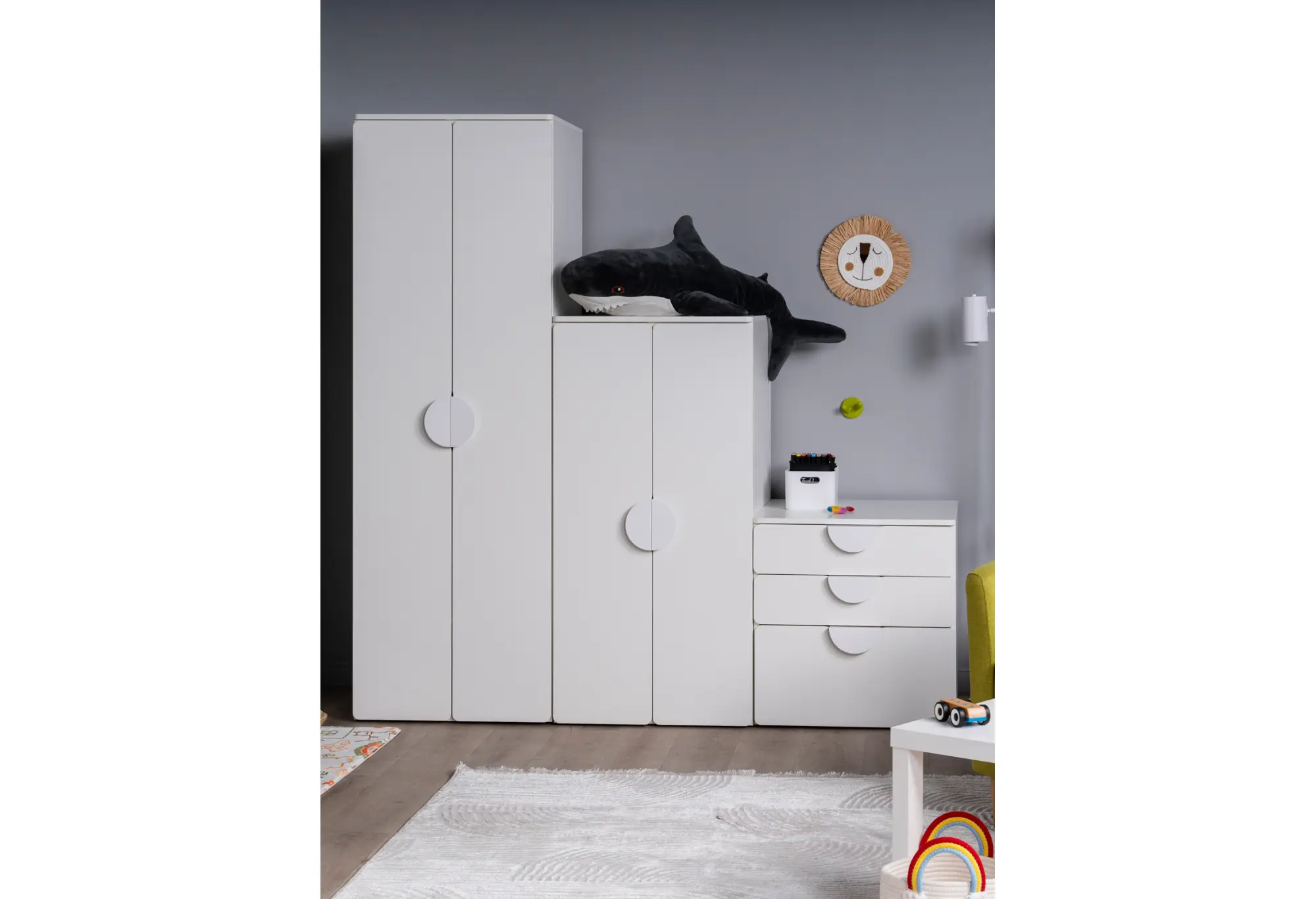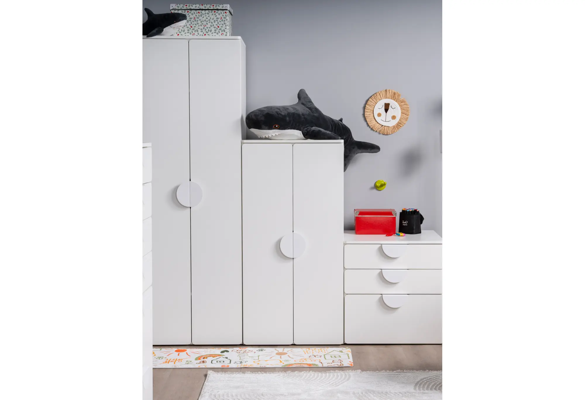 Гладкие фасады без лишнего декора поддерживают современный минималистичный стиль и облегчают уход, поверхность просто протереть влажной салфеткой. Круглая ручка обеспечивает удобное открывание дверей и добавляет аккуратный акцент к строгой геометрии шкафа.