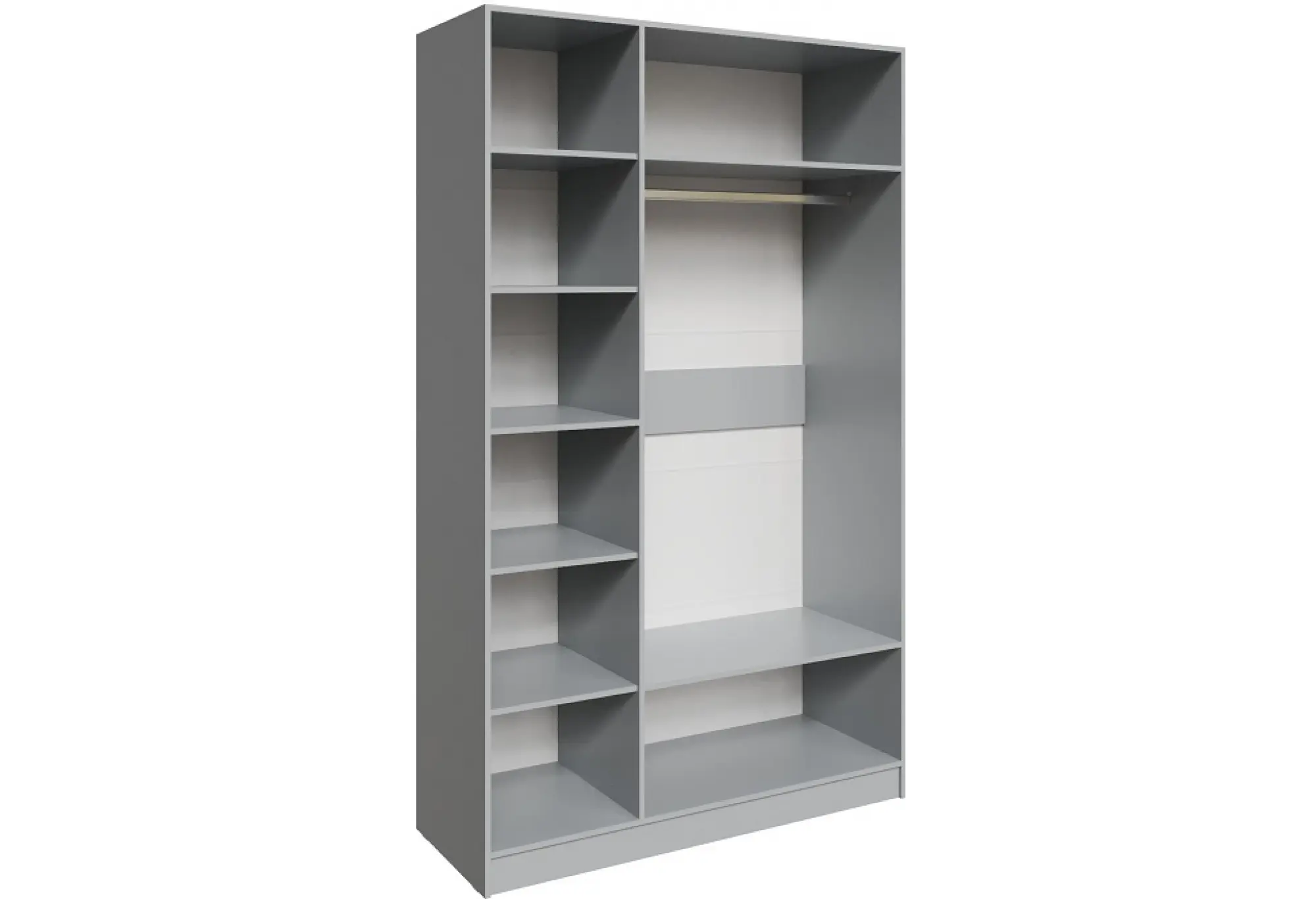 Корпус и фасады выполнены из ЛДСП Kronospan с кромкой 0,4 мм, что обеспечивает стабильную геометрию и аккуратный внешний вид торцевых поверхностей. Внутреннее наполнение сочетает штангу для одежды на вешалках и полки для сложенных вещей, аксессуаров и текстиля. Такое деление пространства позволяет организовать базовый гардероб без излишней сложности. Конструктивная смена наполнения не предусмотрена, поэтому шкаф изначально ориентирован на универсальное использование.