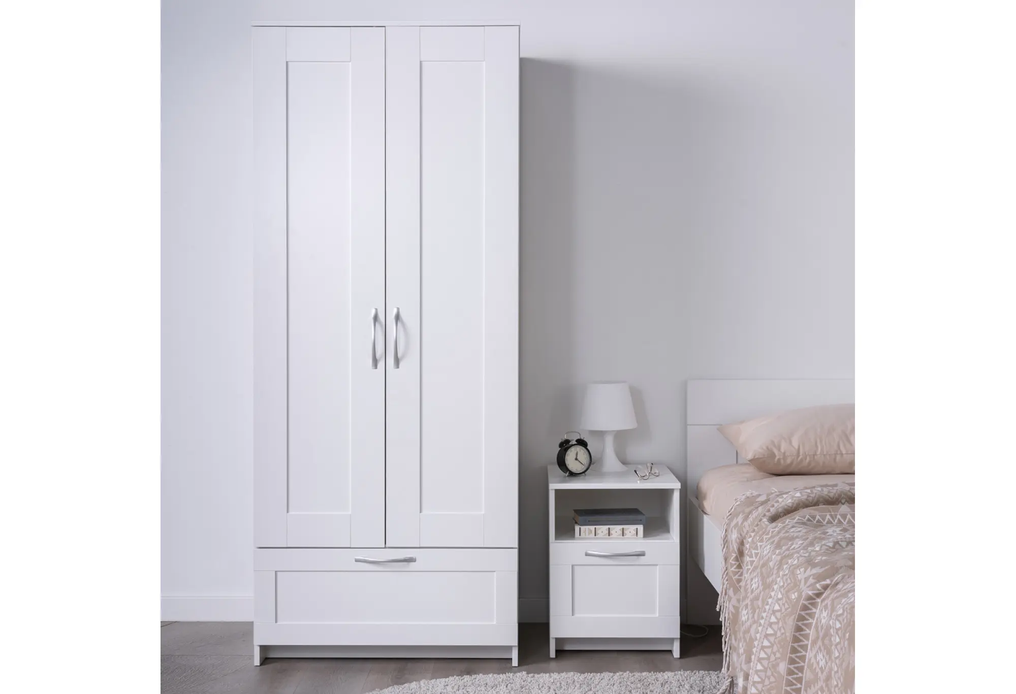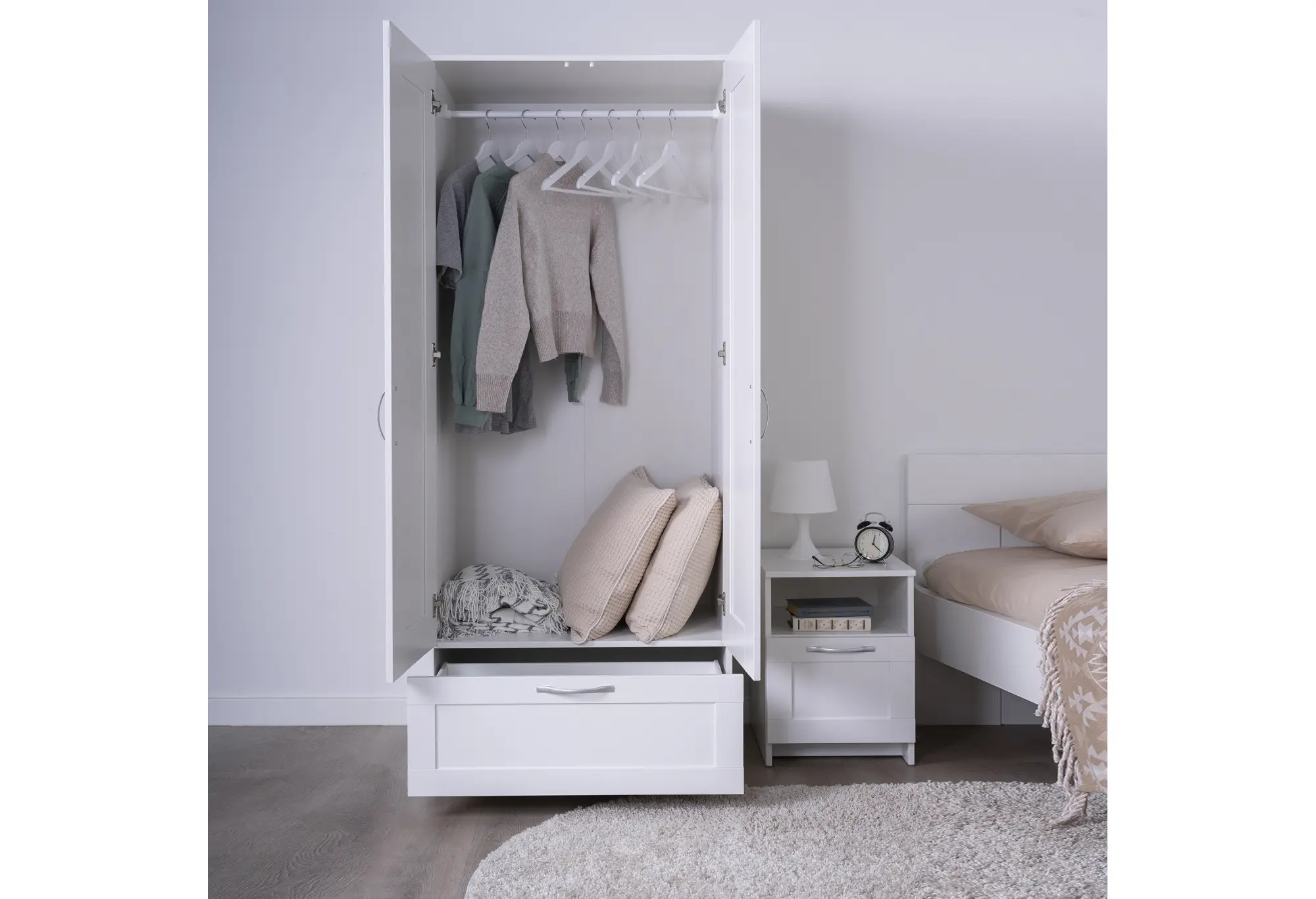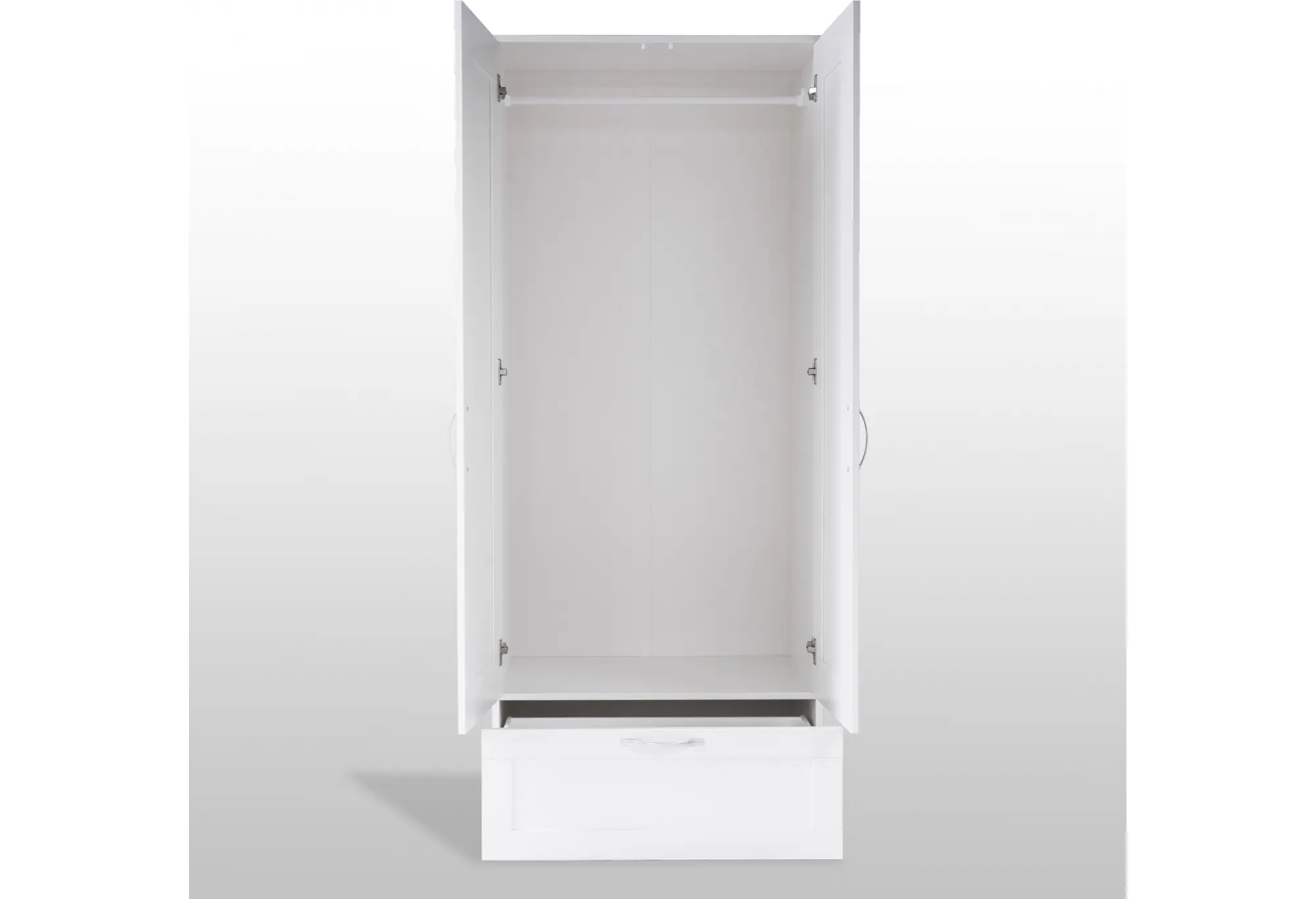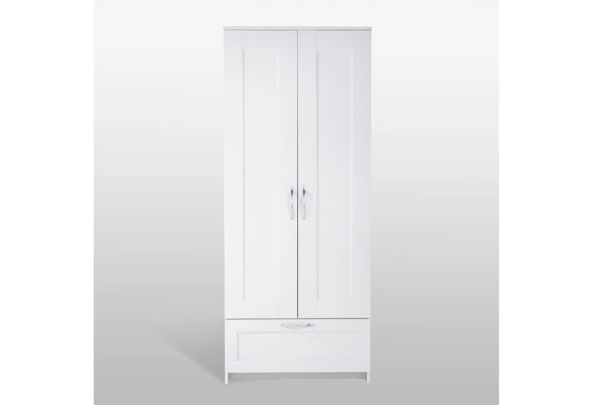 Шкаф оснащен двумя дверцами и одним вместительным ящиком на шариковых направляющих, что гарантирует плавное и бесшумное открывание. Внутреннее пространство организовано удобно — штанга для одежды позволяет аккуратно хранить вещи, освобождая место для других нужных предметов.
