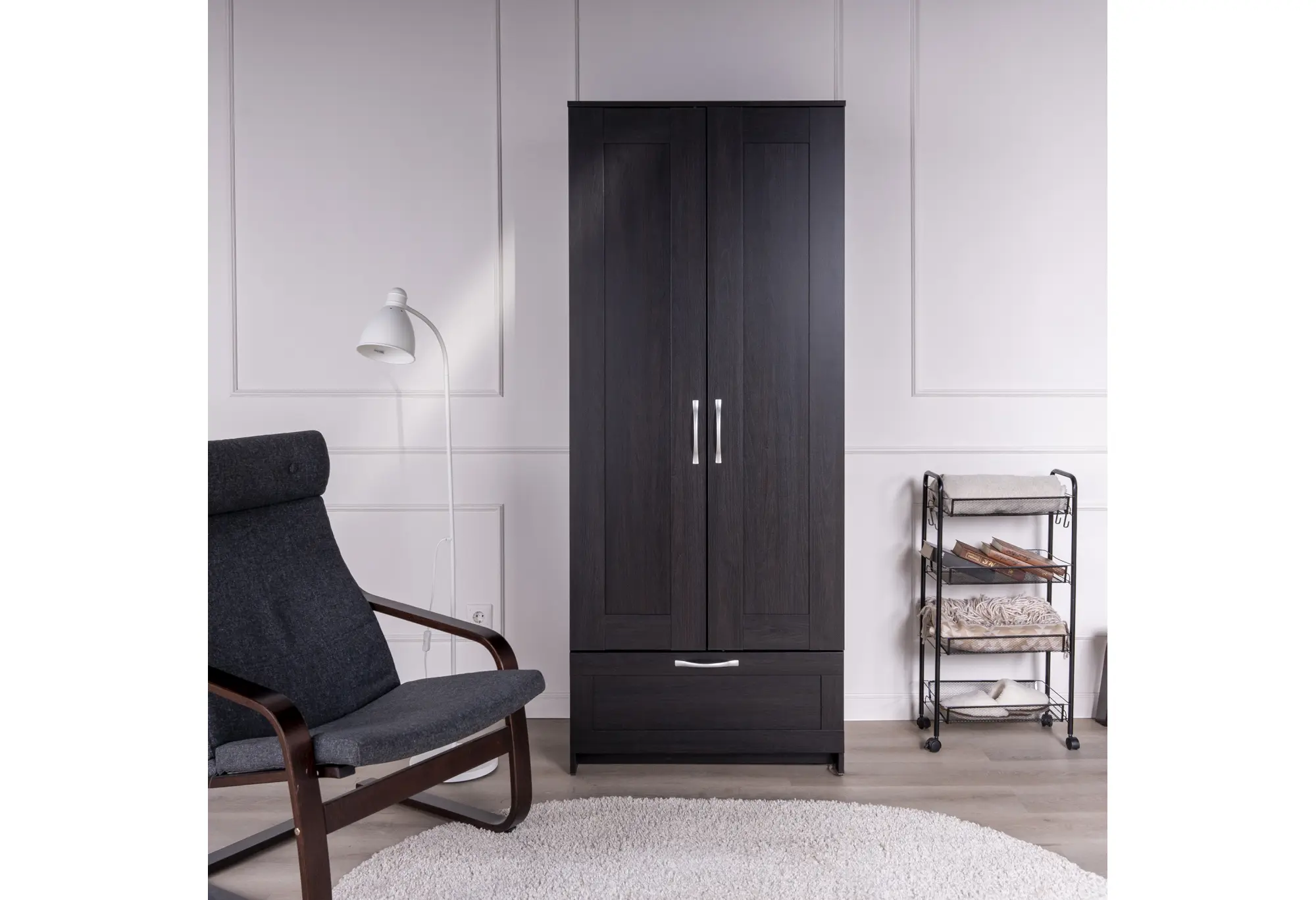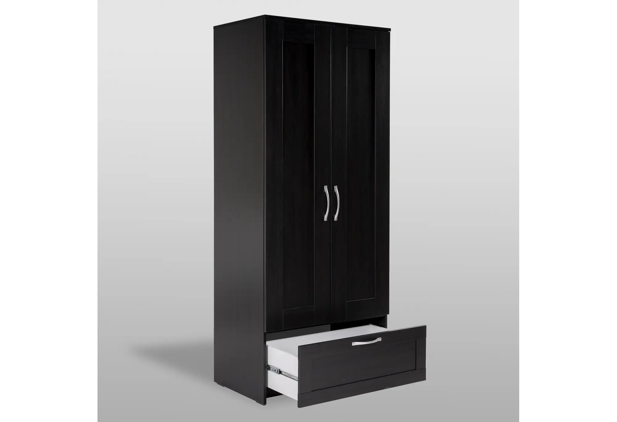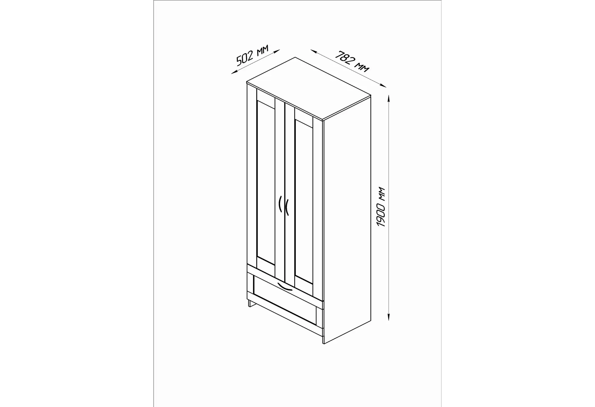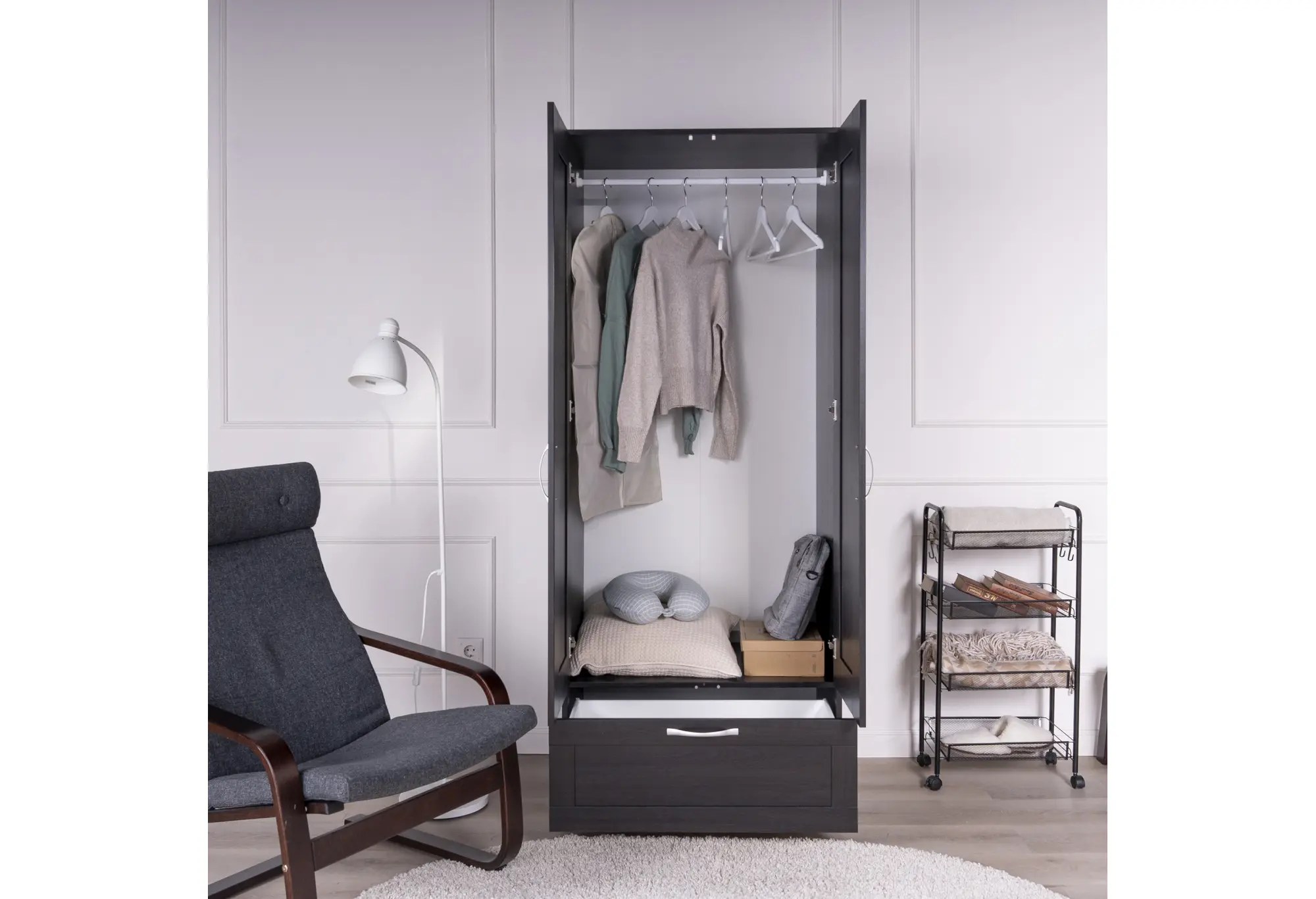Две распашные двери скрывают отделение со штангой для плечиков — здесь удобно разместить рубашки, платья, куртки и верхнюю одежду без заломов. Внизу расположен выдвижной ящик на шариковых направляющих, рассчитанный на нагрузку до 8 кг. Он подходит для белья, аксессуаров, домашнего текстиля или других повседневных вещей, к которым важен быстрый доступ.