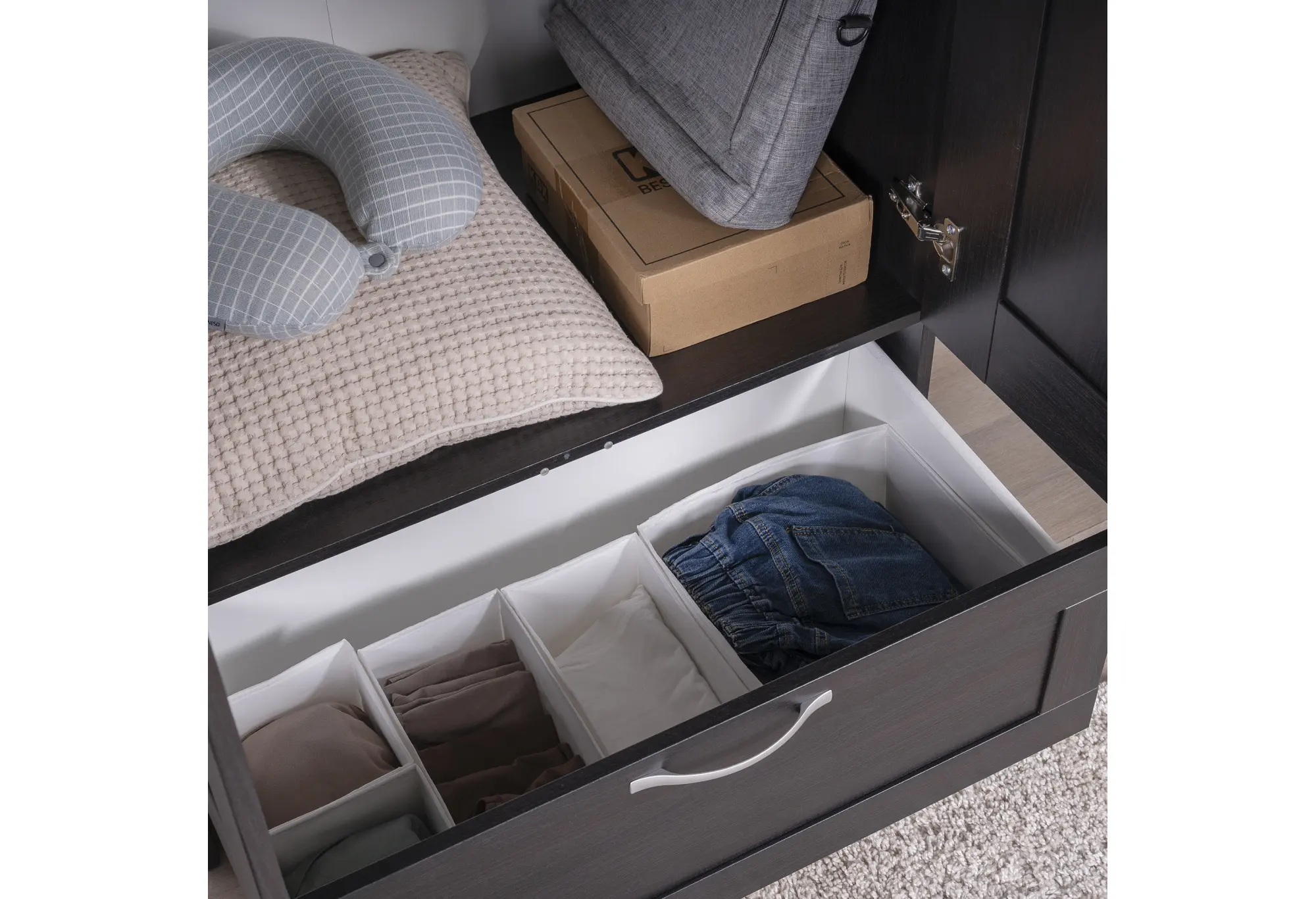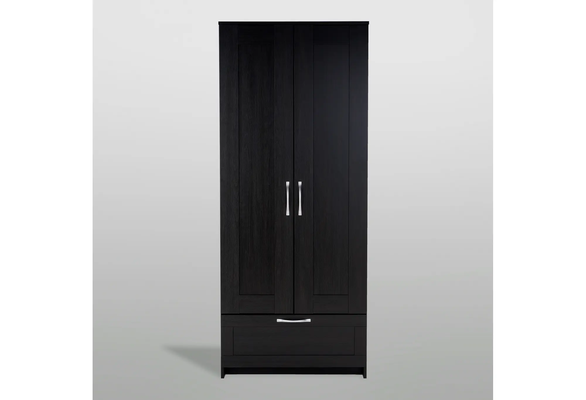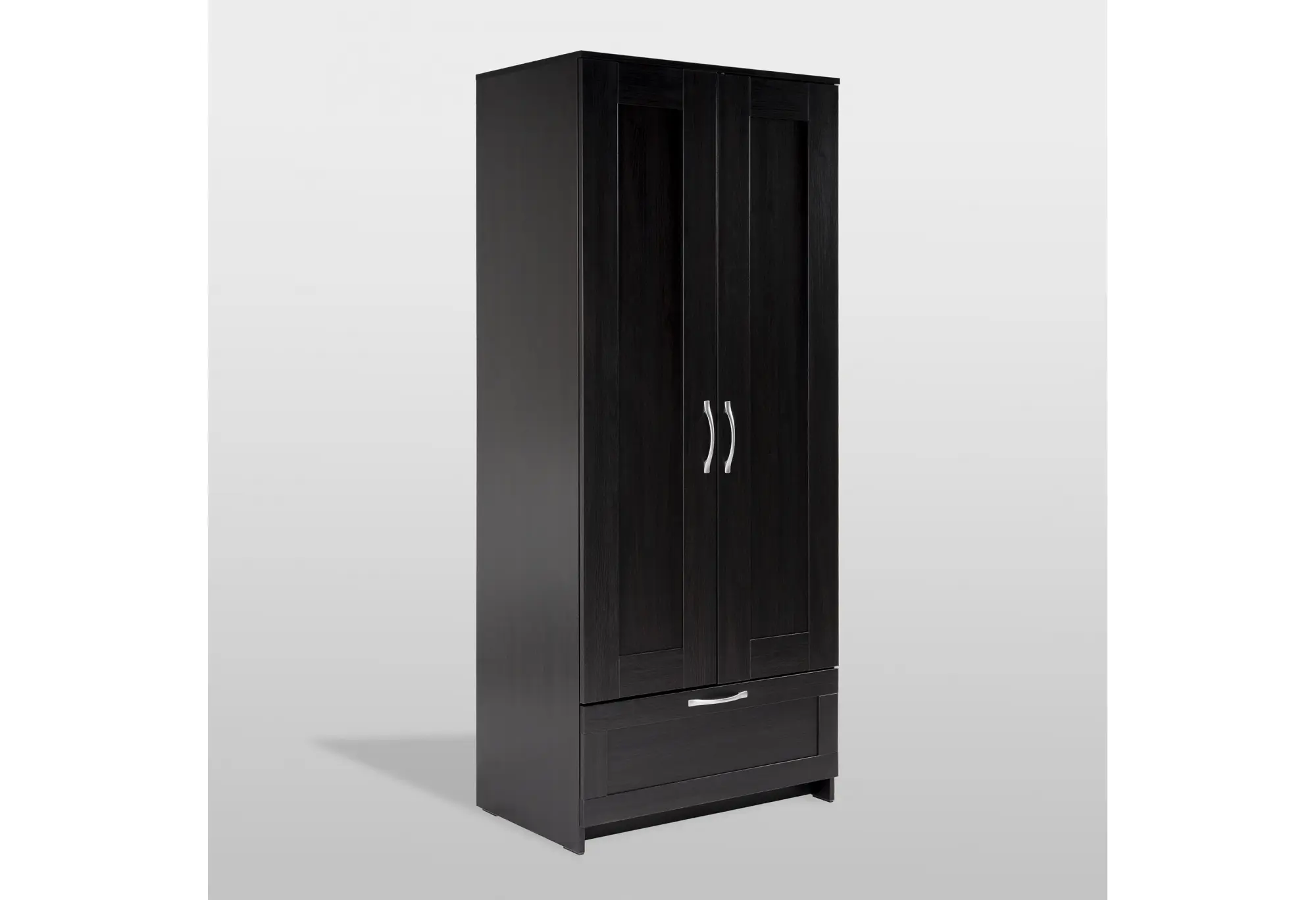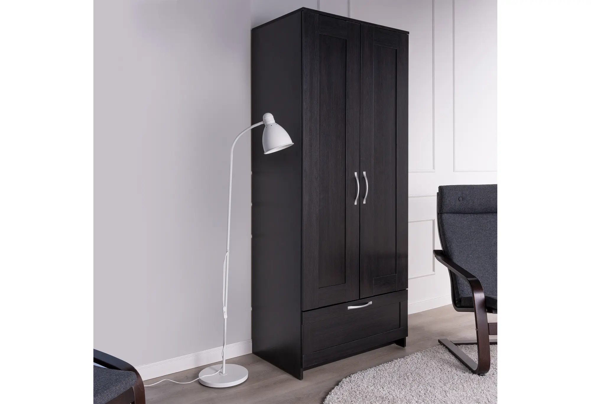 Две распашные двери скрывают отделение со штангой для плечиков — здесь удобно разместить рубашки, платья, куртки и верхнюю одежду без заломов. Внизу расположен выдвижной ящик на шариковых направляющих, рассчитанный на нагрузку до 8 кг. Он подходит для белья, аксессуаров, домашнего текстиля или других повседневных вещей, к которым важен быстрый доступ.