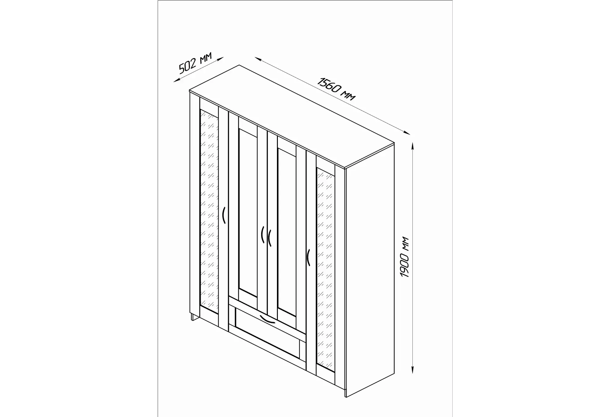 Четыре распашные двери скрывают отделения для хранения. Можно разместить повседневные вещи, сезонную одежду и объемные предметы. Два вертикальных зеркала на фасадах визуально увеличивают комнату и позволяют оценить образ в полный рост, не занимая место под отдельное зеркало.