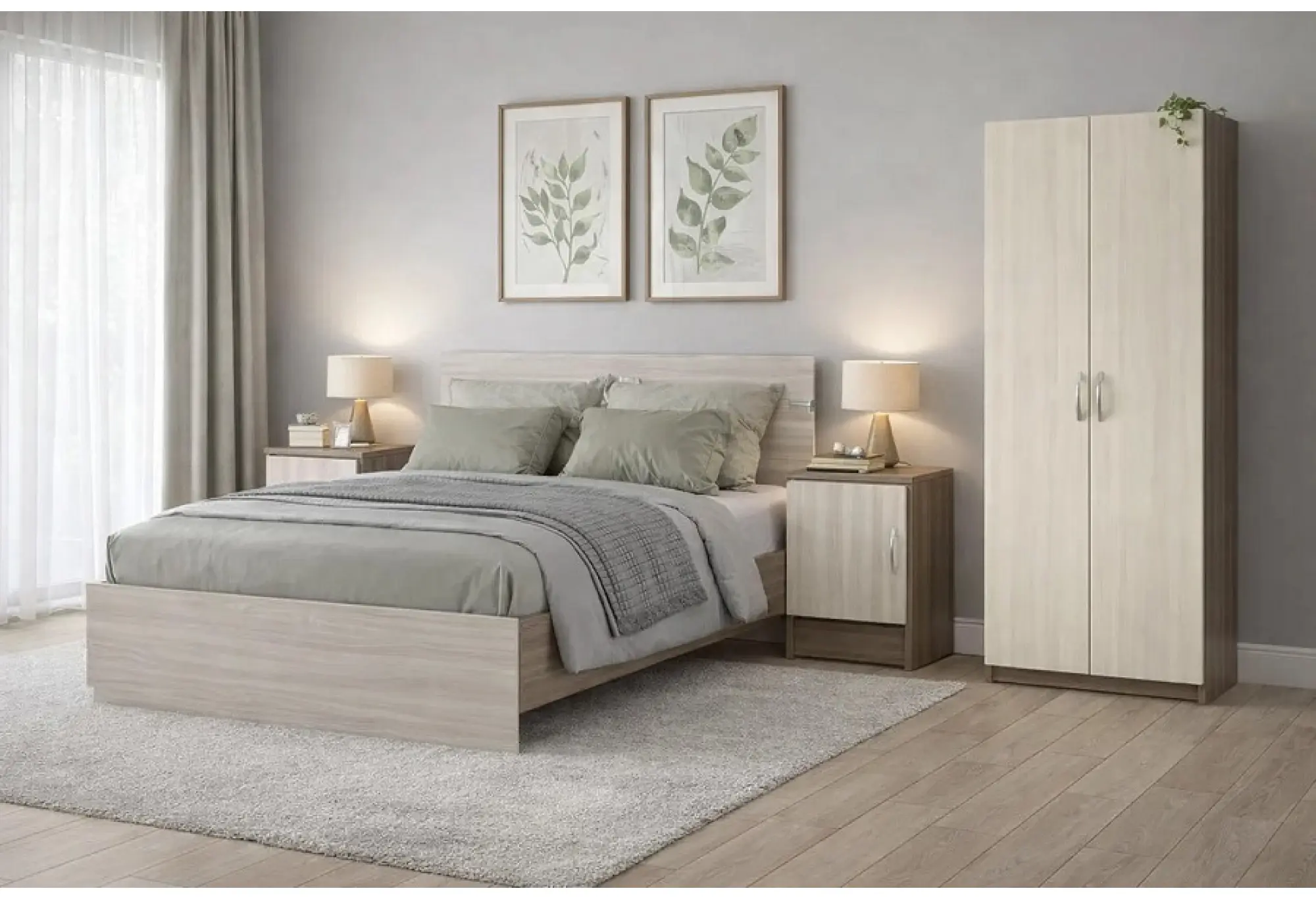 Кровать рассчитана на стандартный матрас 1400 × 2000 мм, который можно подобрать по своим предпочтениям по жесткости и наполнению, так как матрас в комплект не входит. Прикроватные тумбы обеспечат удобное хранение нужных мелочей под рукой, а шкаф позволит рационально разместить одежду и личные вещи, поддерживая порядок в комнате.