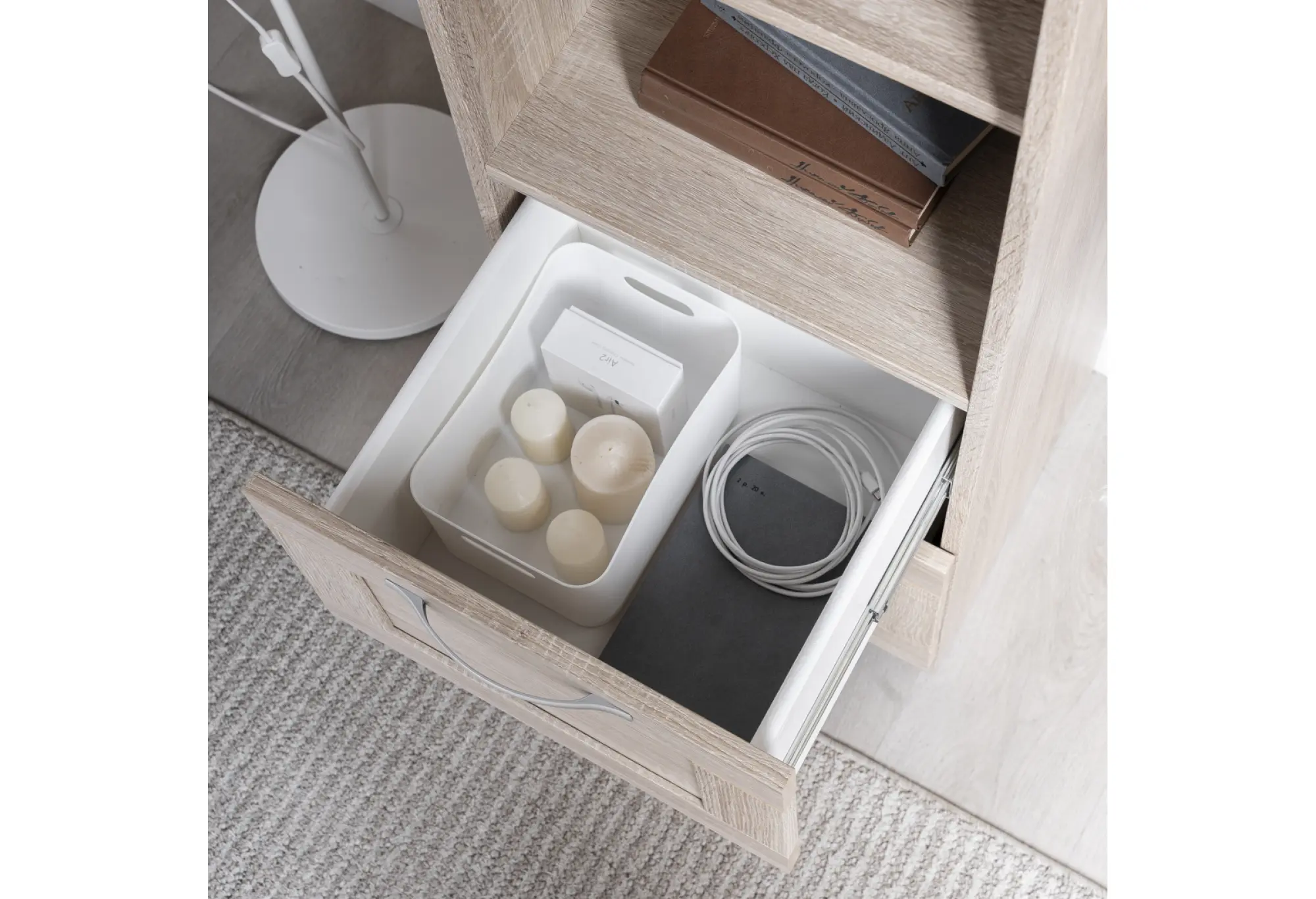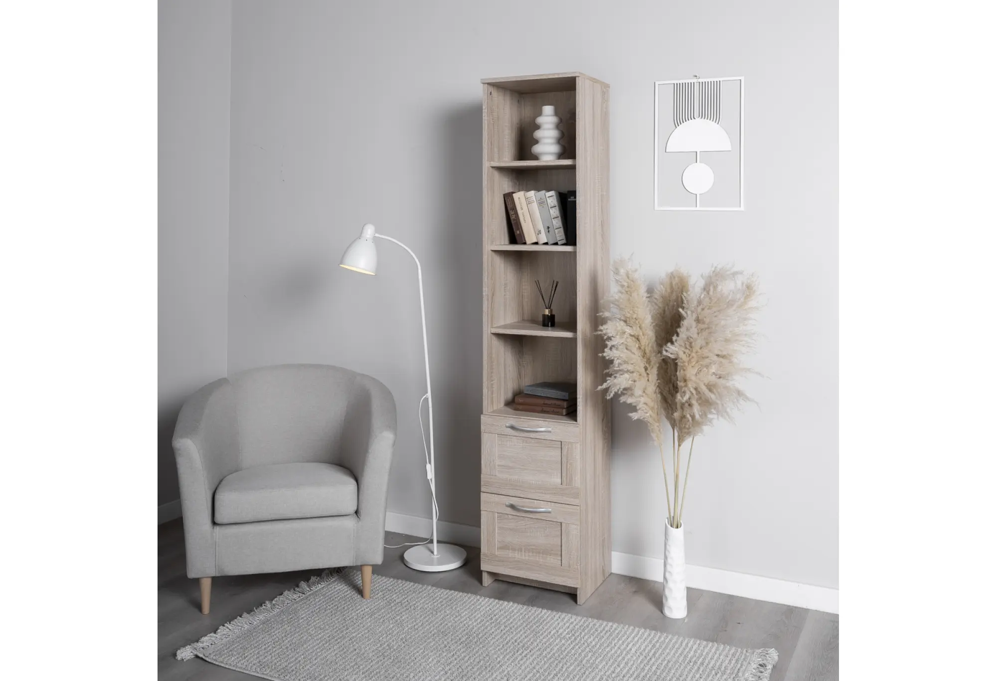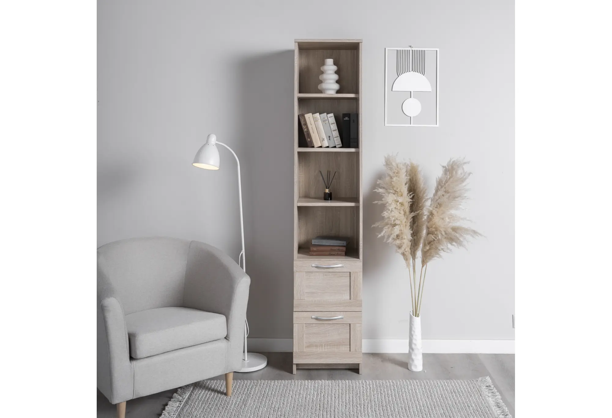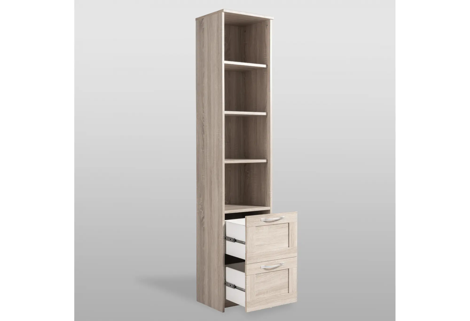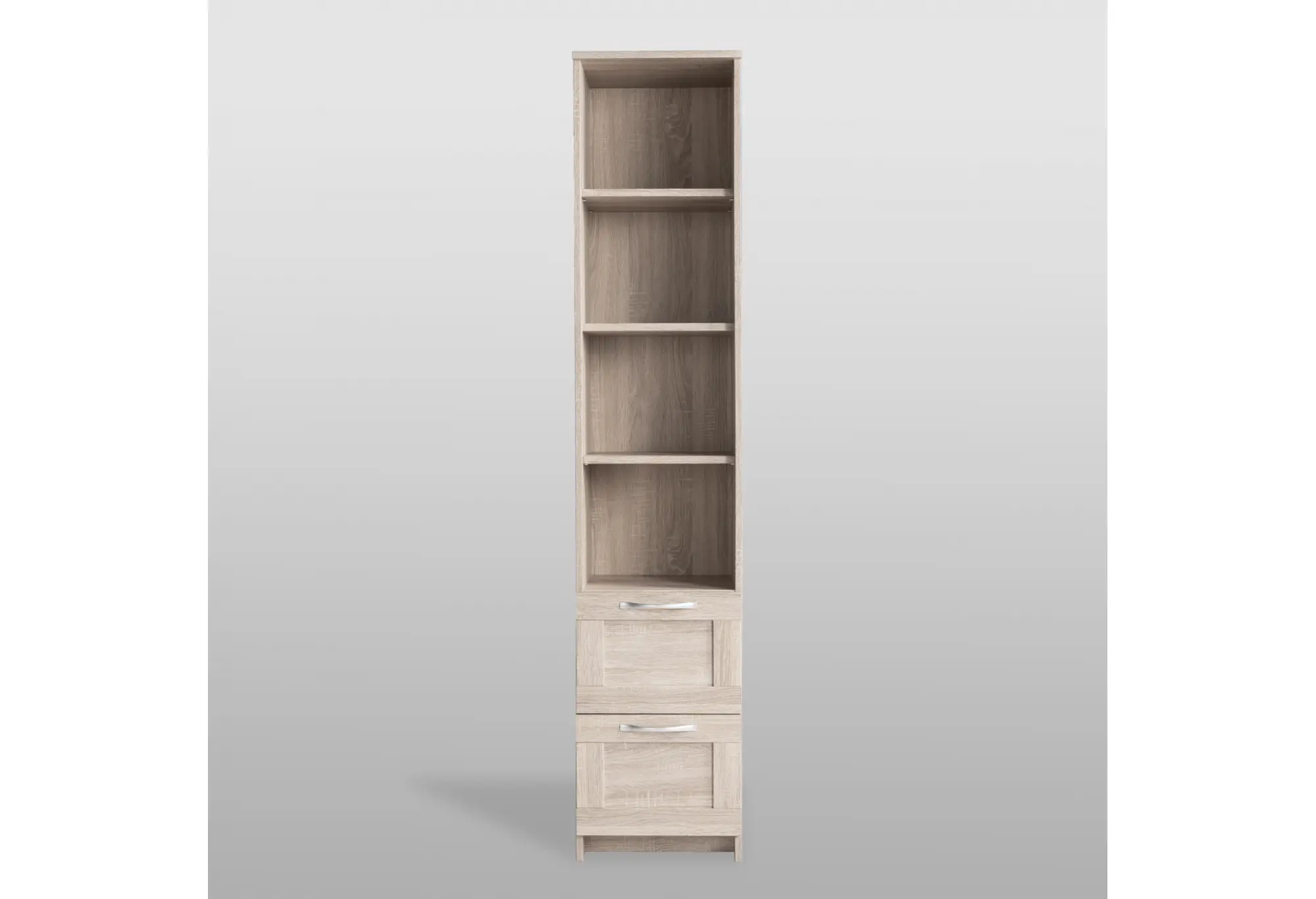 Элегантный стеллаж СИРИУС узкий в цвете Дуб Сонома станет функциональным и стильным дополнением вашего интерьера. Сочетая в себе утонченность дизайна и практичность, он предлагает четыре просторные полки для размещения книг, декоративных элементов или бытовых предметов. Два выдвижных ящика обеспечивают дополнительное место для хранения мелочей, помогая поддерживать порядок.