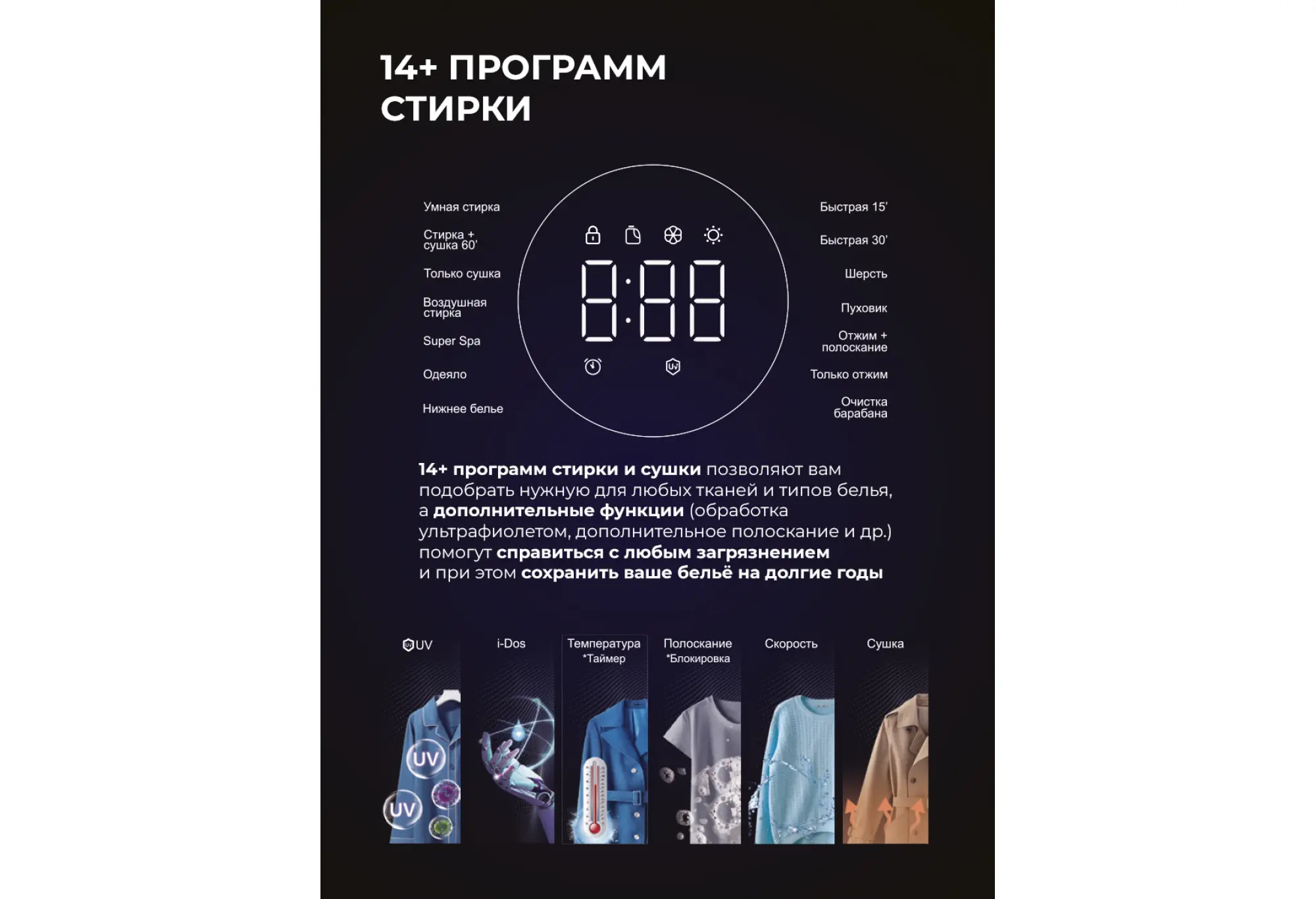 Модель LEX LWM10714 Lux — это отдельностоящая стирально-сушильная машина с сенсорным управлением и премиальным дизайном, доступная в черном и белом цветах.Важные преимущества:14+ программ стирки:А дополнительные функции (обработка ультрафиолетом, дополнительное полоскание и др.) помогут справиться с любым загрязнением и при этом сохранить ваше бельё на долгие годы.