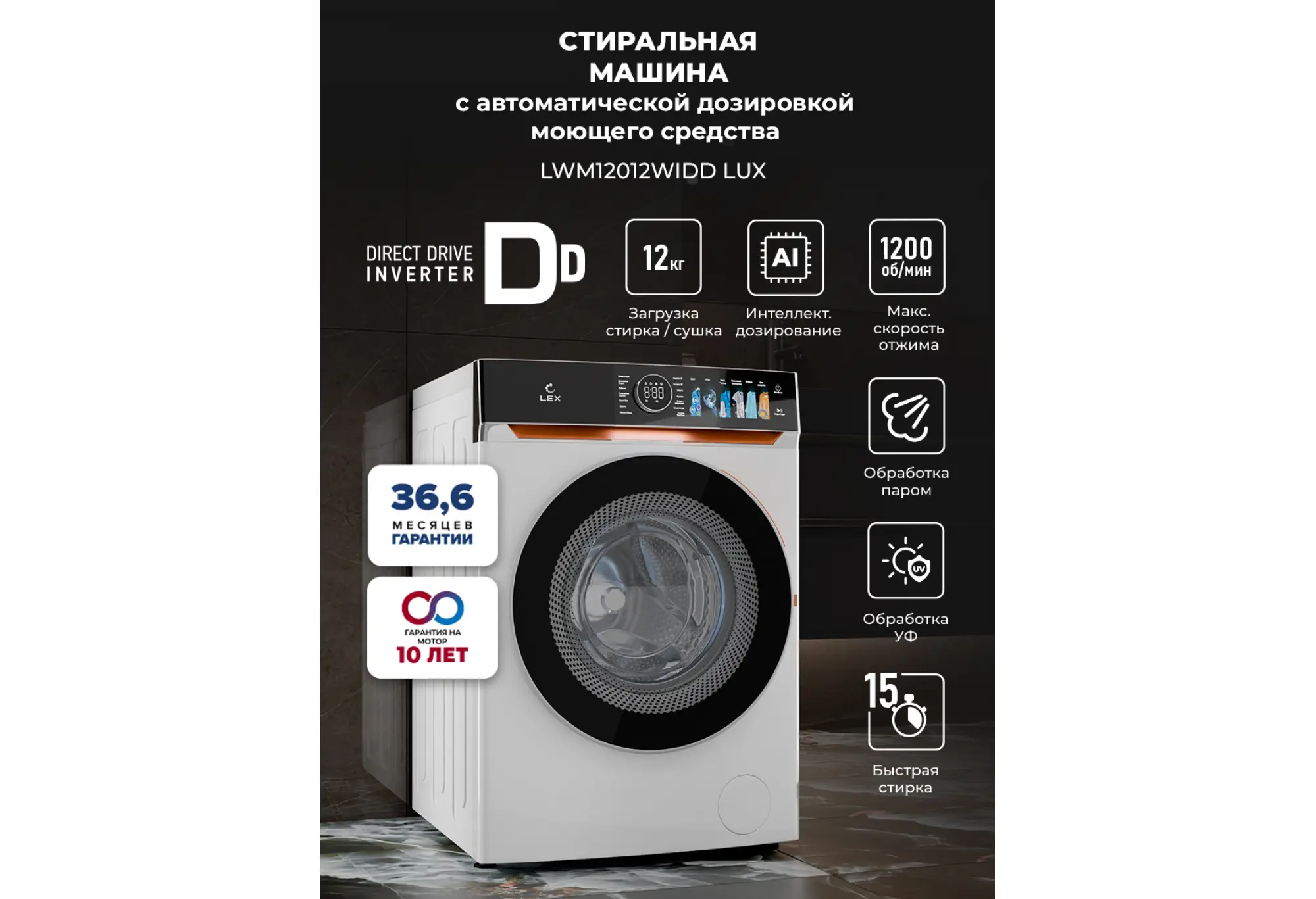 Модель LEX LWM12012 Lux — это отдельностоящая стиральная машина с сенсорным управлением и премиальным дизайном, доступная в черном и белом цветах. Важные преимущества:14+ программ стирки:А дополнительные функции (обработка ультрафиолетом, дополнительное полоскание и др.) помогут справиться с любым загрязнением и при этом сохранить ваше бельё на долгие годы.Кол-во программ: 14, Super spa, Воздушная стирка, Деликатная стирка, нижнее белье, Одеяла, Очистка барабана, Полоскание + отжим, Пуховик, Режим 15 мин, Режим 30 мин, Рубашки, Спортивная одежда, Только отжим, Умная стирка, Шерсть