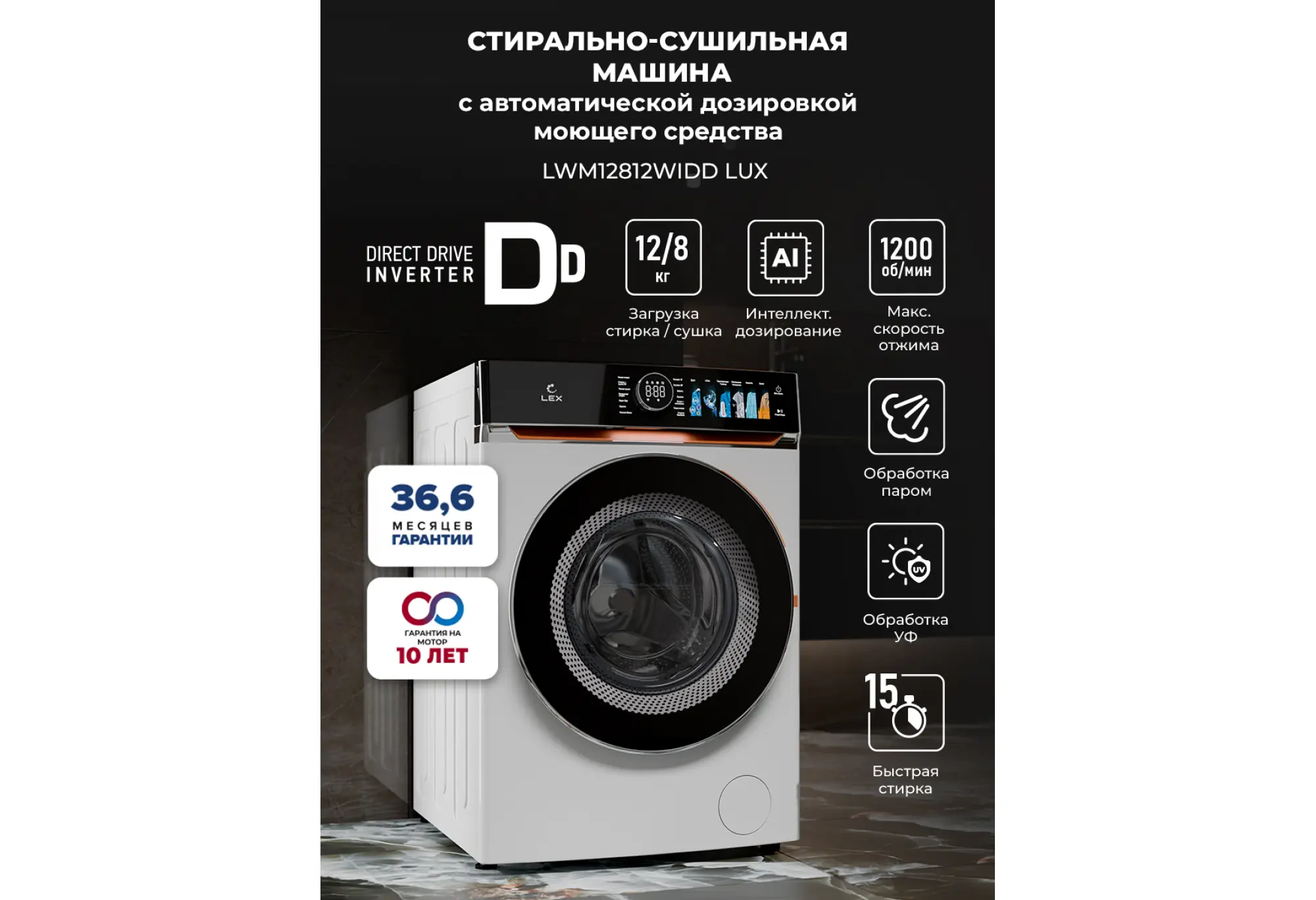 Модель LEX LWM12812 Lux — это отдельностоящая стирально-сушильная машина с сенсорным управлением и премиальным дизайном, доступная в черном и белом цветах. Важные преимущества:14+ программ стирки:А дополнительные функции (обработка ультрафиолетом, дополнительное полоскание и др.) помогут справиться с любым загрязнением и при этом сохранить ваше бельё на долгие годы.