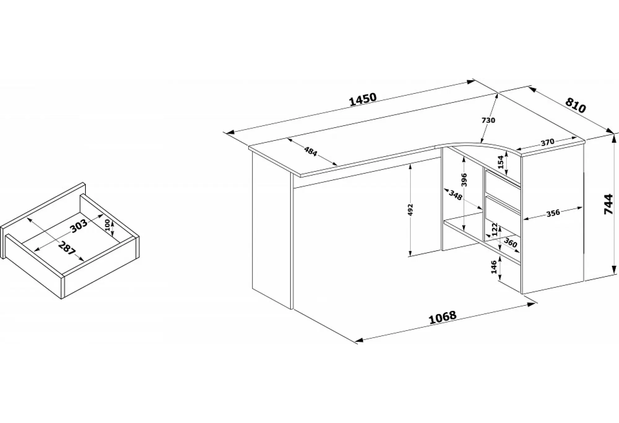 Конструкция предусматривает левостороннюю и правостороннюю сборку — вы можете адаптировать расположение тумбы под планировку помещения и свои привычки. Стол рассчитан на повседневную эксплуатацию в офисе - нагрузка до 20 кг на столешницу и до 5 кг на ящик и полки соответствует типичным задачам рабочего места.