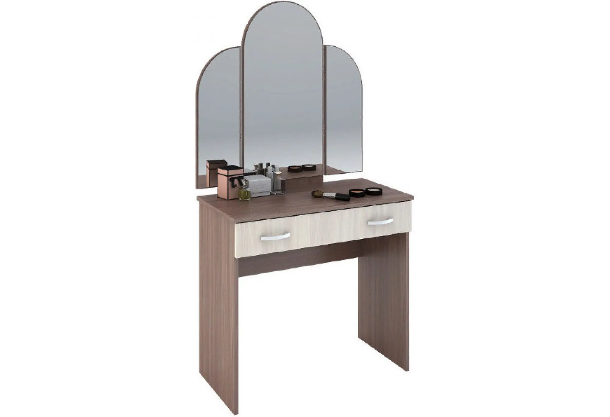 Компактный макияжный стол «Басса» аккуратно впишется в спальню или гардеробную, не занимая много места. Столешница шириной 820 мм и глубиной около 430 мм обеспечивает рабочее пространство для повседневного ухода и размещения косметики. Конструкция выполнена из ЛДСП, устойчивой к повседневным нагрузкам и простой в уходе. Трёхстворчатое зеркало-трельяж высотой 895 мм удобно для того, чтобы видеть себя под разными углами - центральная часть дополнена двумя боковыми зеркалами, визуально расширяющими зону обзора. Под столешницей расположен выдвижной ящик на всю ширину стола, который позволяет держать необходимые аксессуары и косметические средства под рукой и одновременно скрыть лишние мелочи с поверхности. Комбинация светлого и тёмного ясеня шимо подчёркивает современный характер модели и облегчает подбор мебели в похожей цветовой гамме. Стол производится в России, что упрощает подбор аналогичных модулей из той же серии и гарантирует соответствие распространённым стандартам по размерам.
